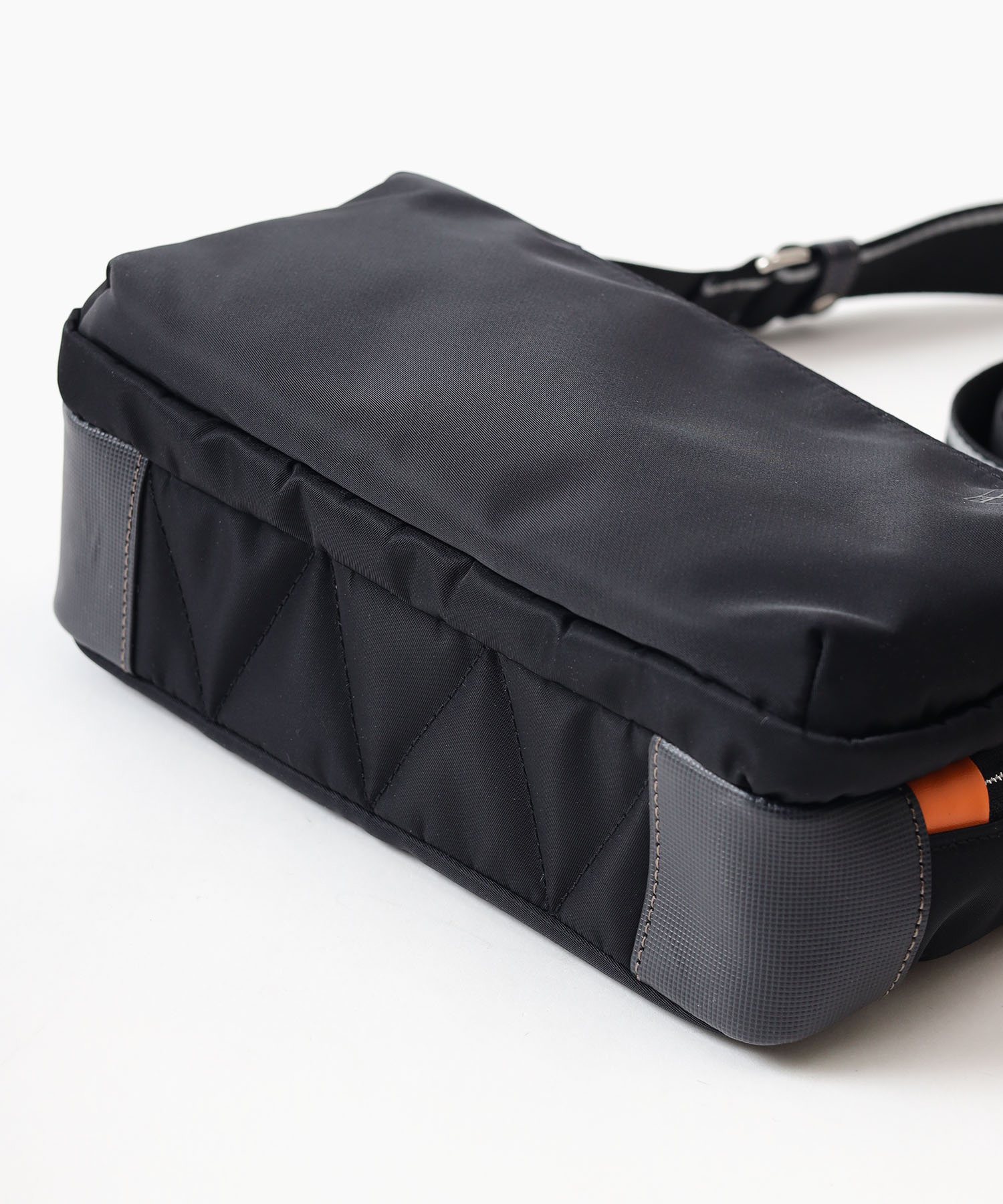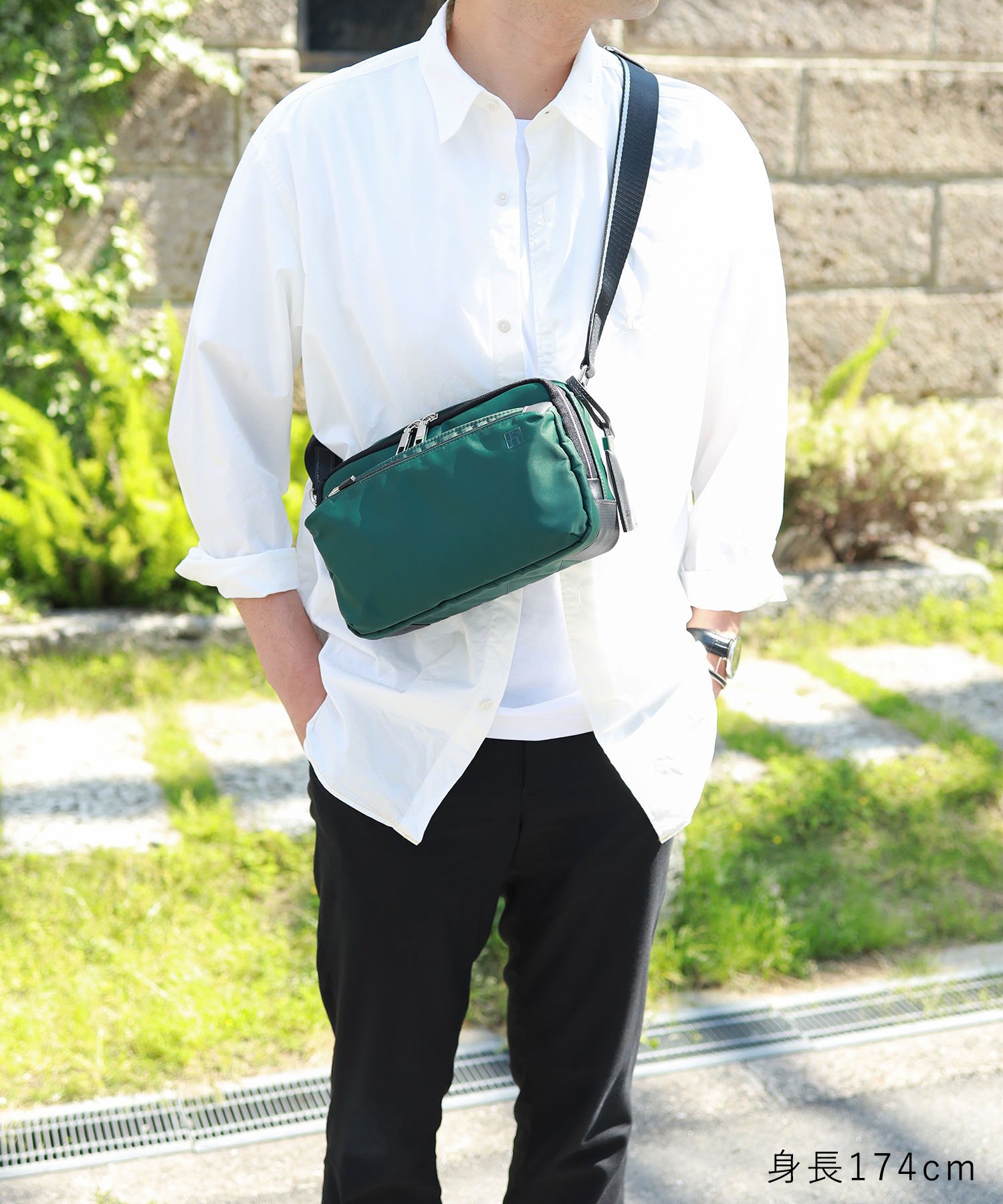 陰影ある光沢感と発色の良いカラーの魅力あふれる高密度ナイロンツイル生地を使用しています。付属革の部分には、シャープな格子状のエンボスを施しております。艶と色でツートンで加工をし、傷が付きにくくなっています。