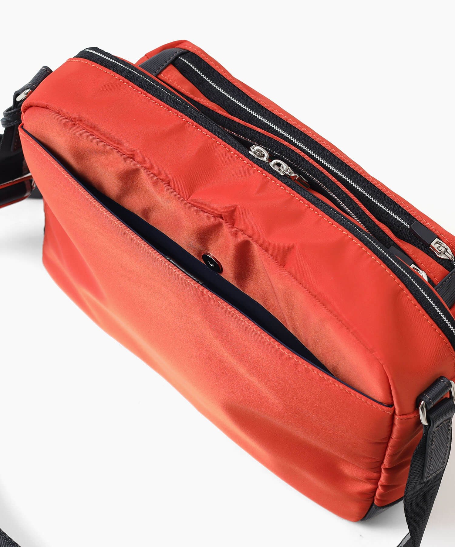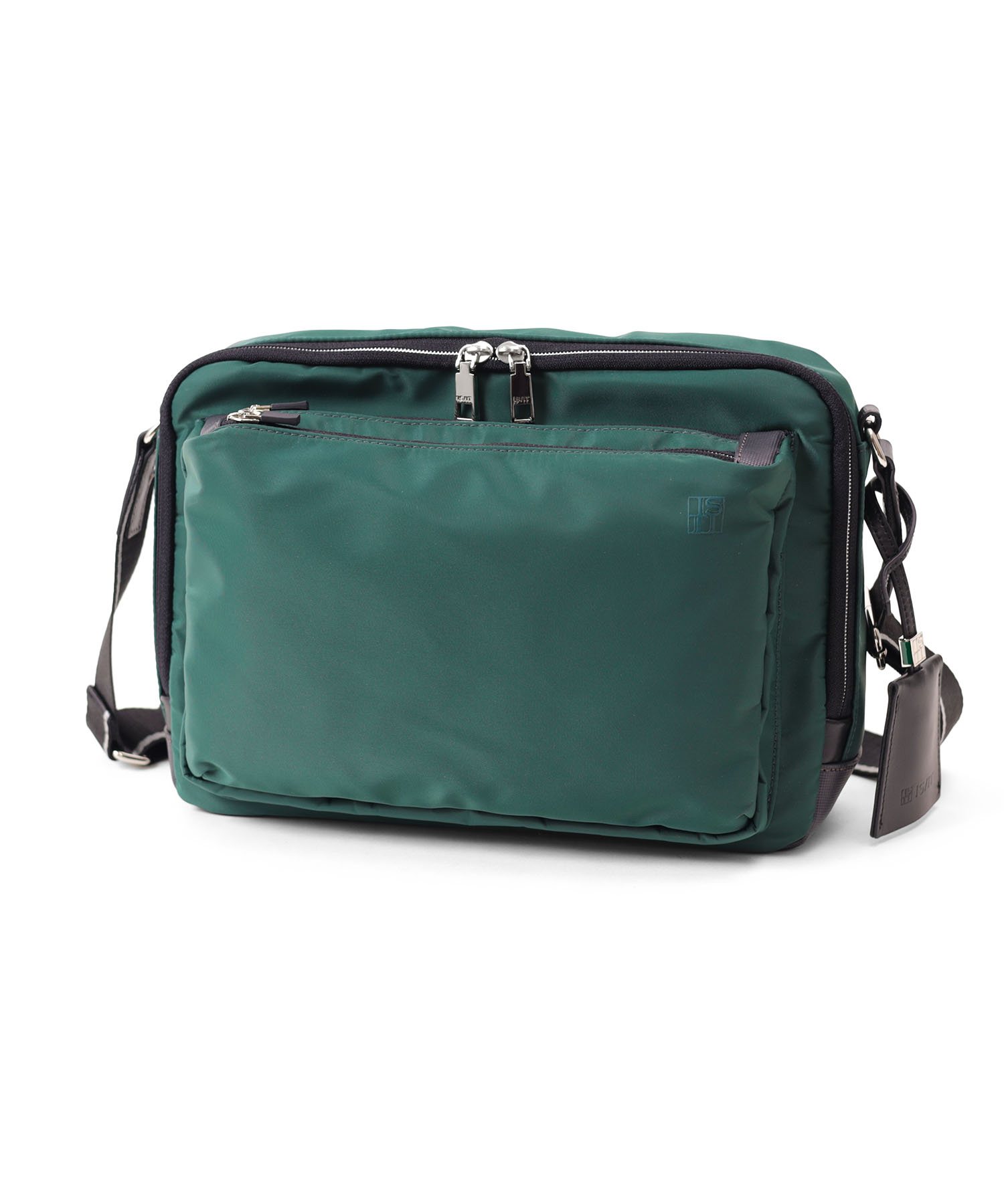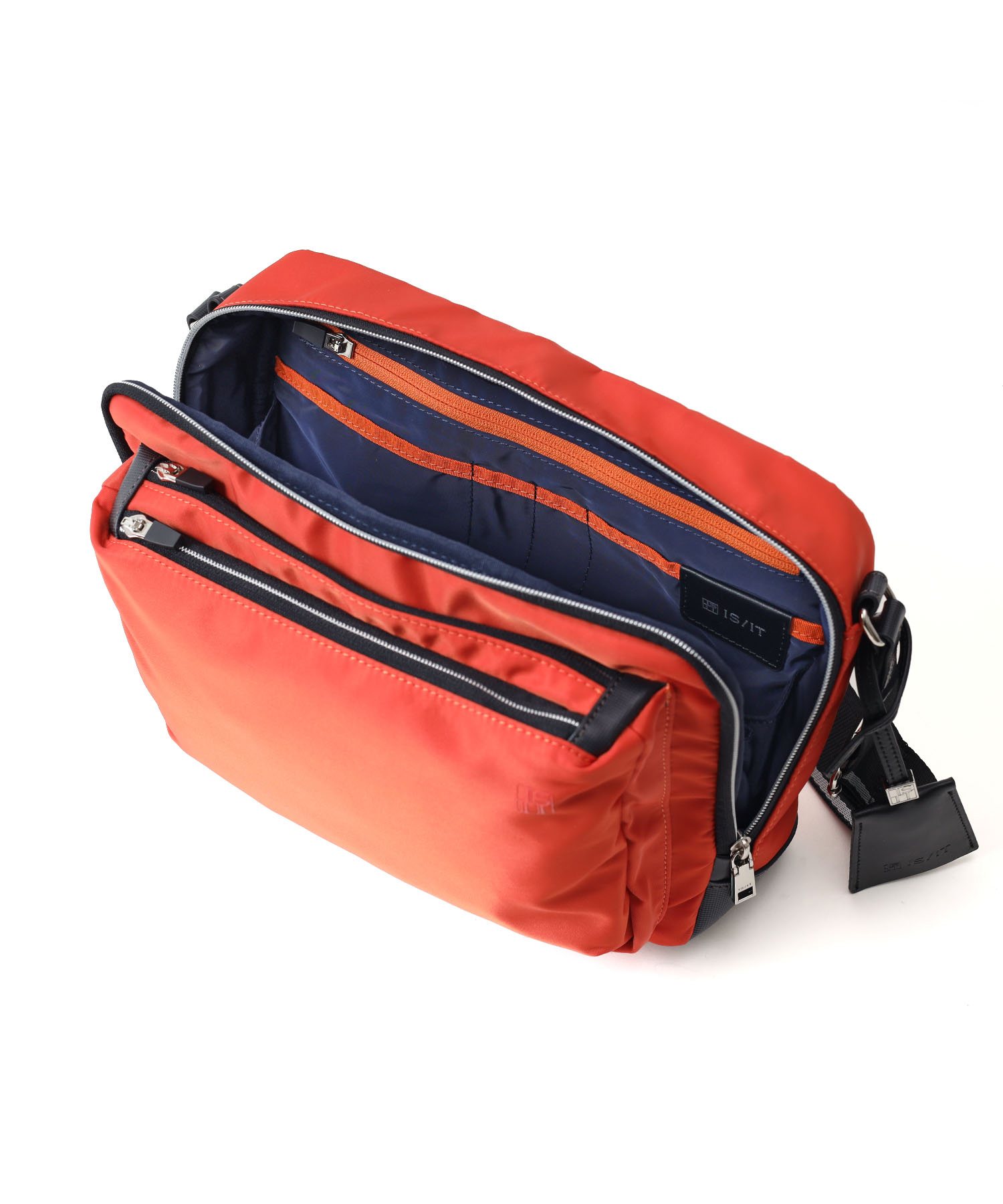「収納しやすい」を追求し完成した、イズイットのB5サイズのショルダーバッグ。フロントにある機能的な2層式のポケットがポイント。スマホや財布類など、使用頻度の高いアイテムが収納しやすいようデザインしました。