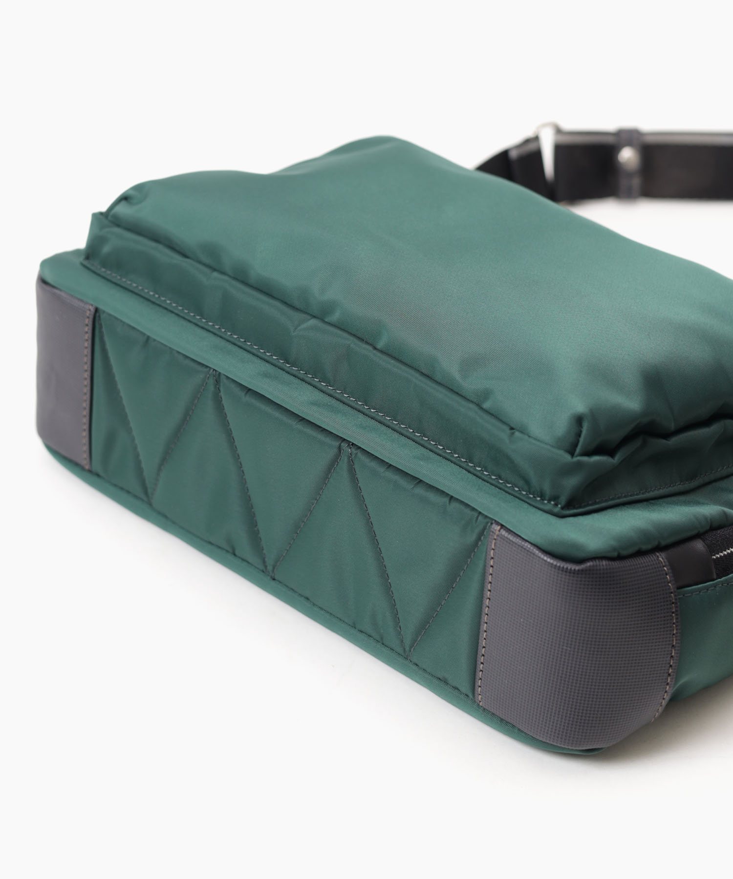 陰影ある光沢感と発色の良いカラーの魅力あふれる高密度ナイロンツイル生地を使用しています。付属革の部分には、シャープな格子状のエンボスを施しております。艶と色でツートンで加工をし、傷が付きにくくなっています。