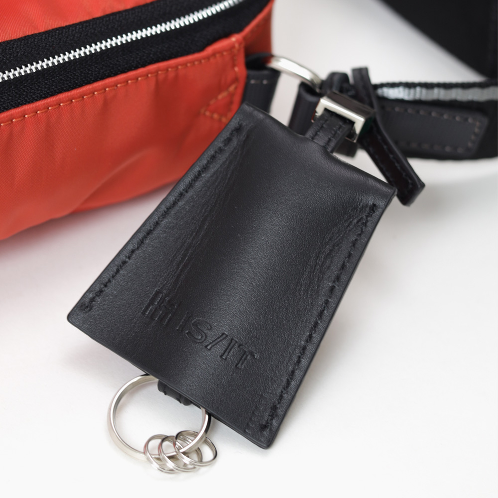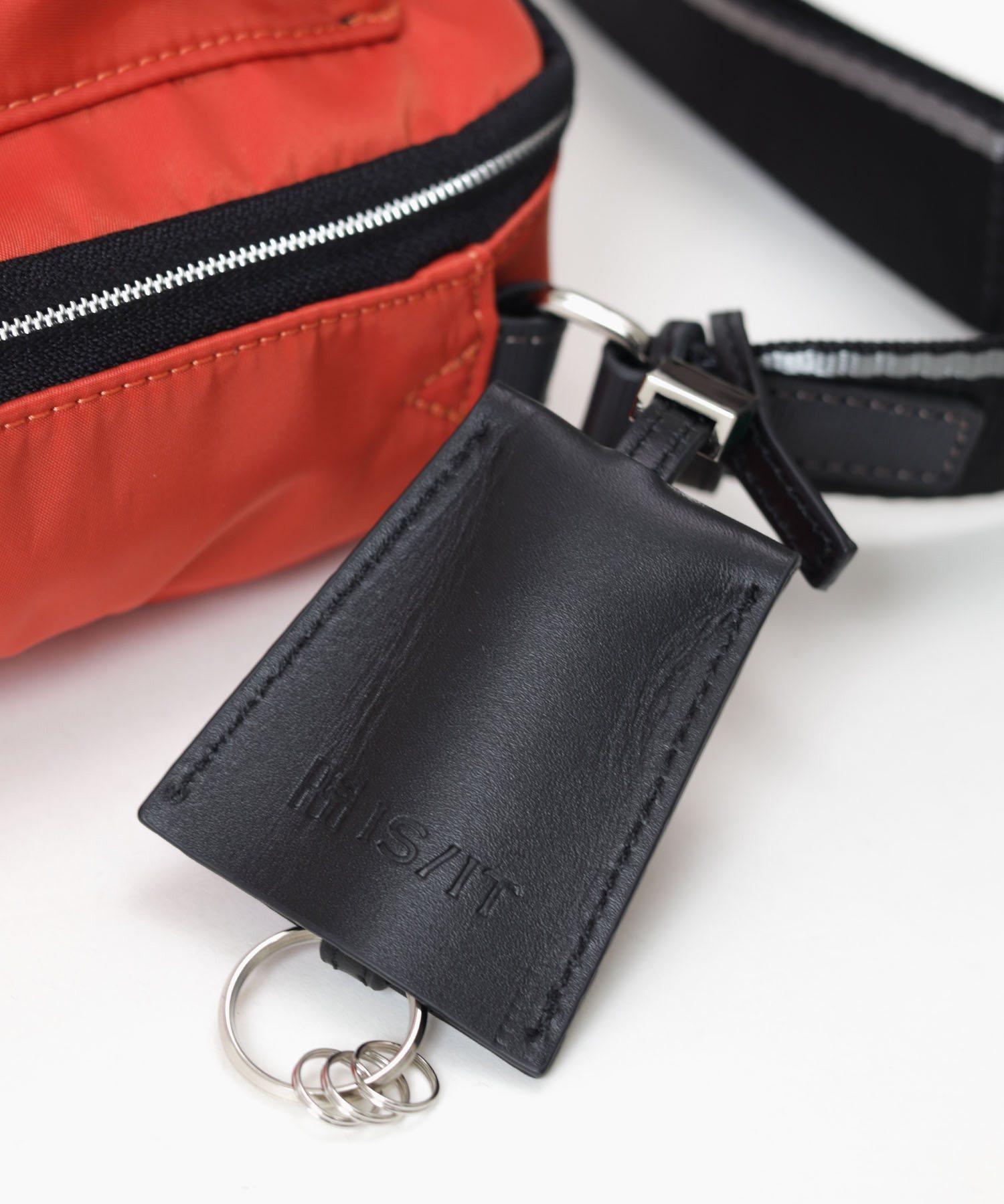 チャームとしての役割を果たすブランのロゴ入りキーサック。中にはリングが3つ付いているので、鍵を付けておけば鞄の中から鍵を探す手間が省けます。