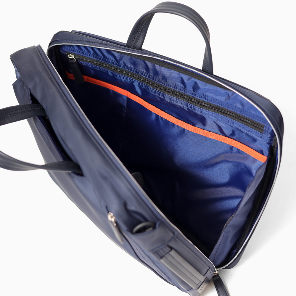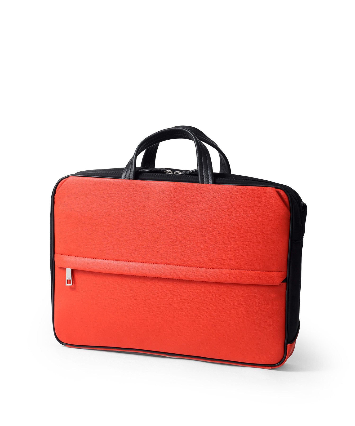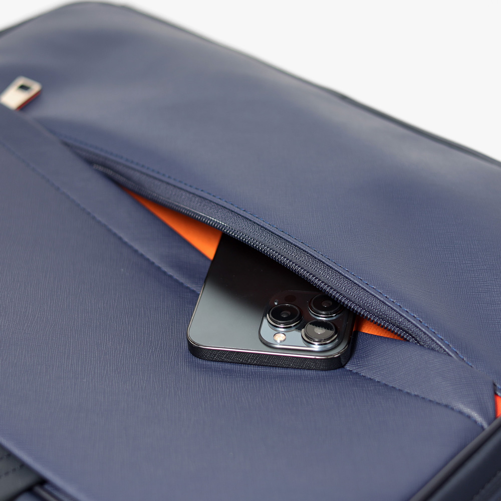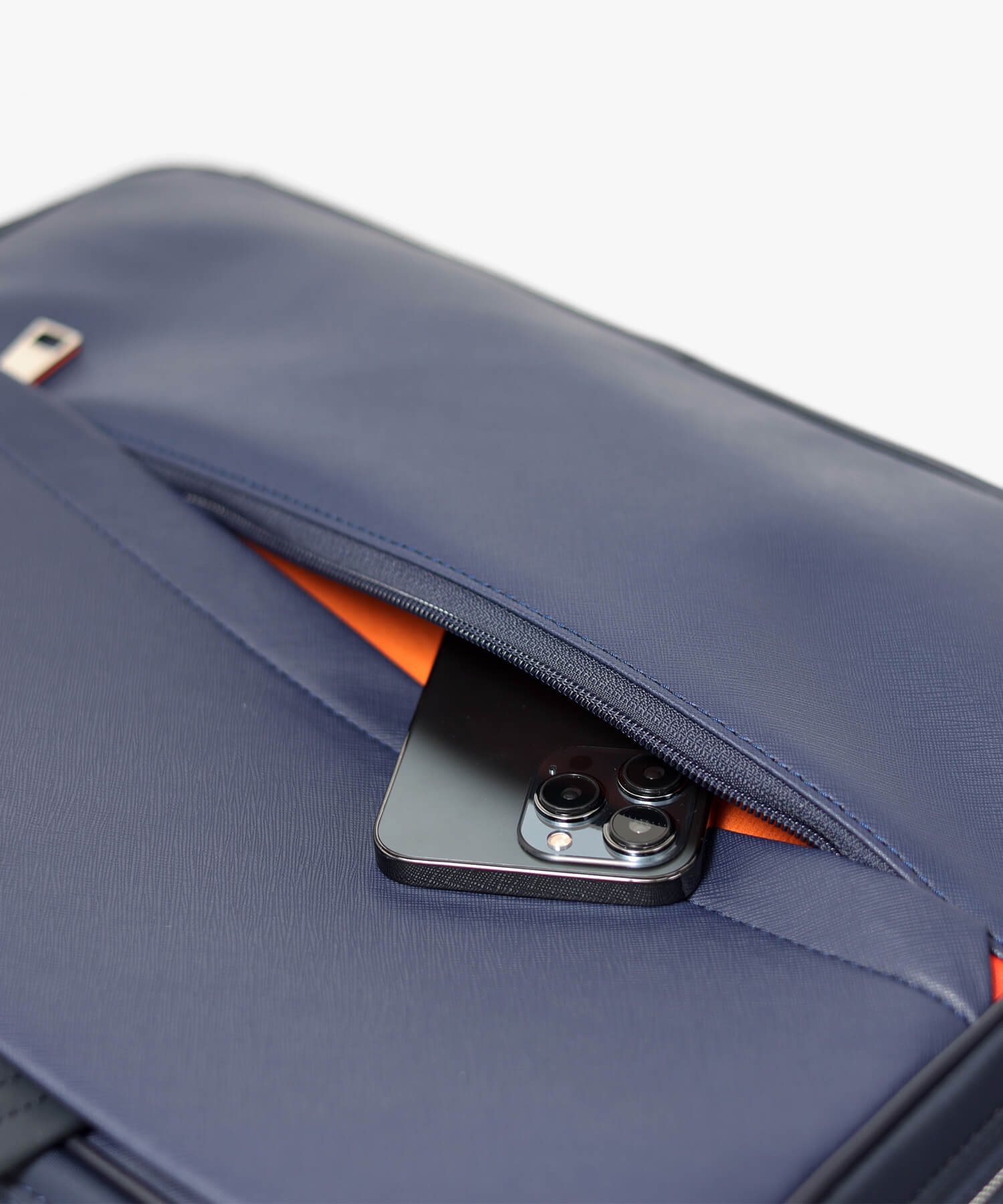 豊富な収納ポケットで、ビジネスに必要なあらゆる荷物の持ち運びが可能です。A4ファイルがすっぽりと収まるメインルーム内には、15インチPC収納対応ポケットと、ファスナーポケットが1つ、大小のポケットが1つずつ装備されています。ガジェット類など細かな荷物を整理して収納が可能です。また、ビジネスバッグの前面にはアオリポケットがあり、新聞やサッと取り出したい小物の収納に便利です。フロントのファスナーポケットは浅型に設計しており、さらに内側は見やすいオレンジ色のパイル生地を使用することで、スマートフォン等を入れても画面を傷つける心配がありません。