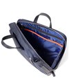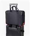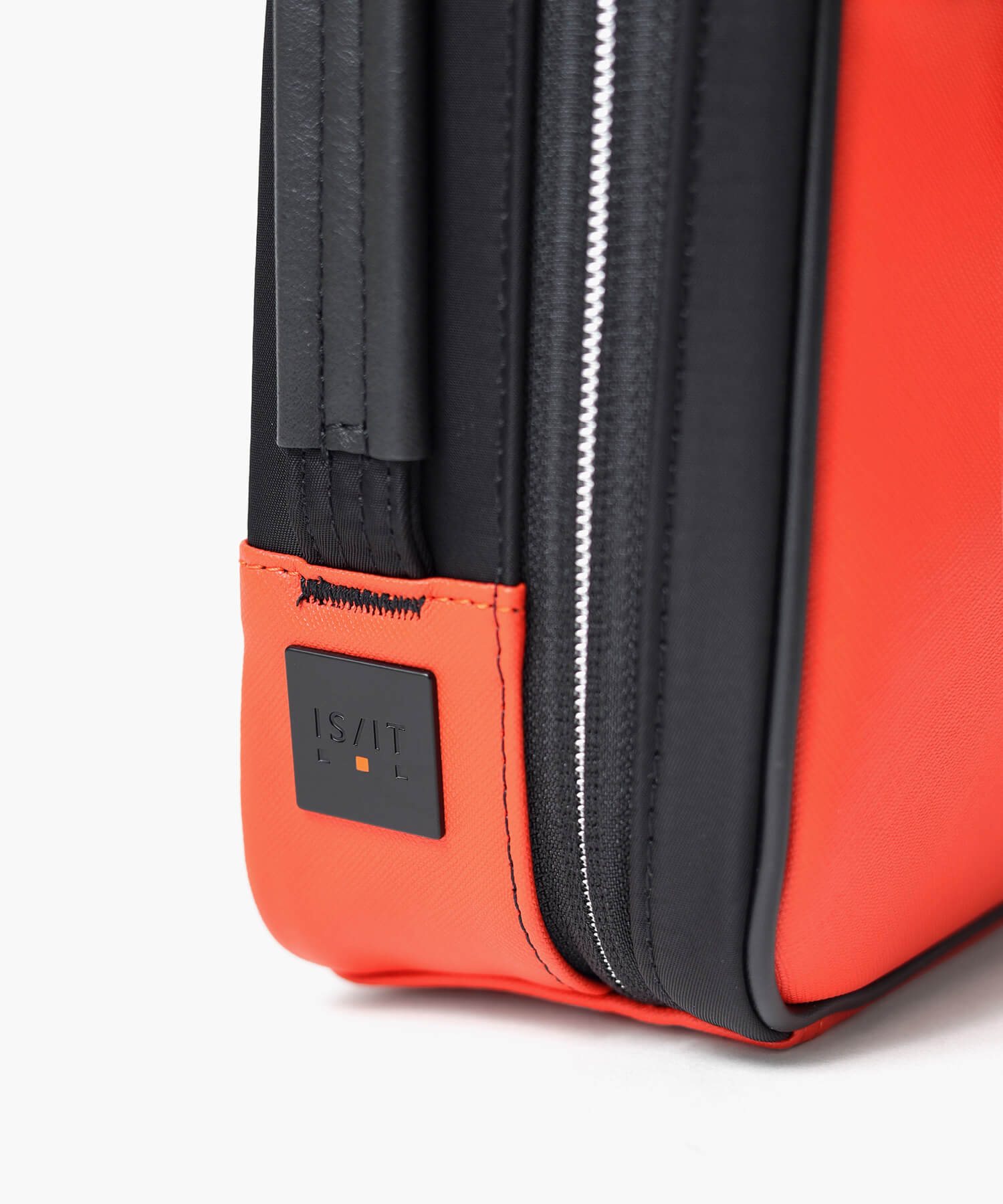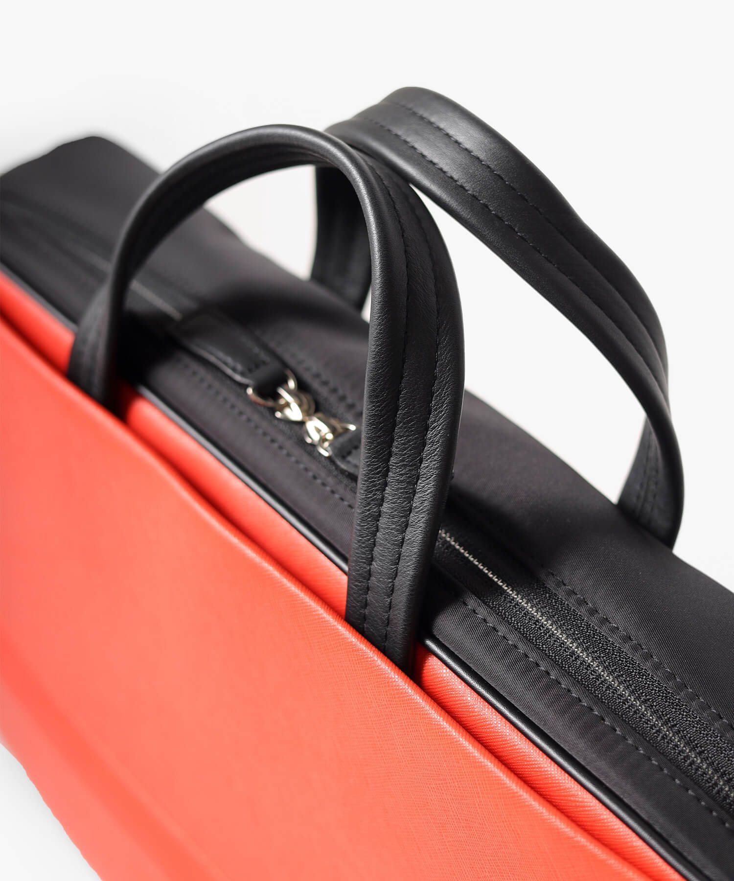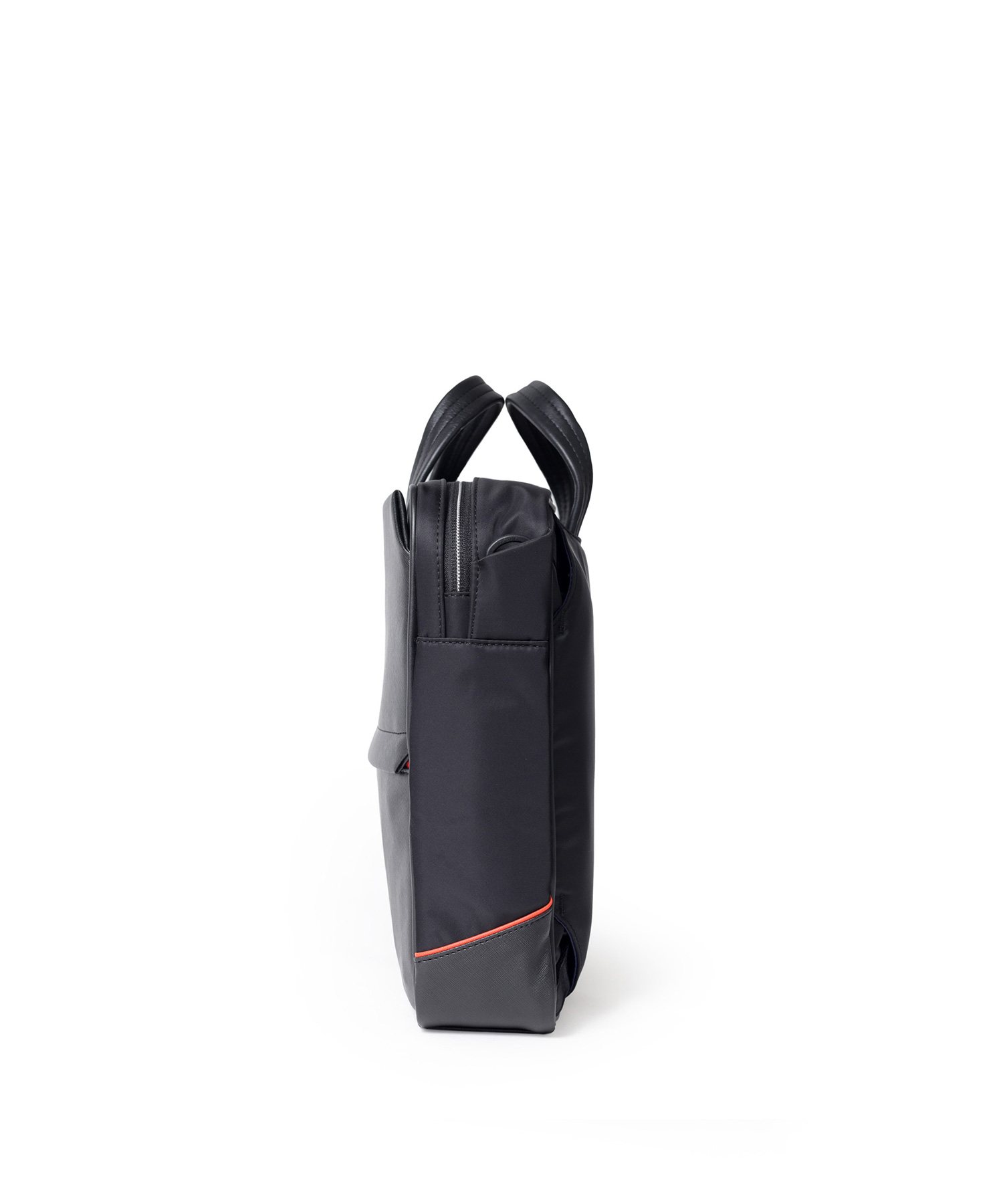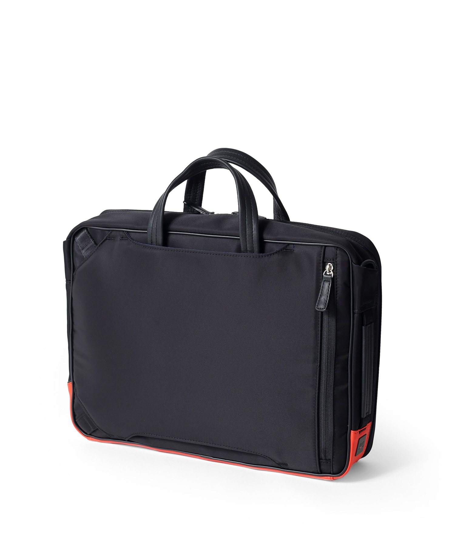 豊富な収納ポケットで、ビジネスに必要なあらゆる荷物の持ち運びが可能です。A4ファイルがすっぽりと収まるメインルーム内には、15インチPC収納対応ポケットと、ファスナーポケットが1つ、大小のポケットが1つずつ装備されています。ガジェット類など細かな荷物を整理して収納が可能です。また、ビジネスバッグの前面にはアオリポケットがあり、新聞やサッと取り出したい小物の収納に便利です。フロントのファスナーポケットは浅型に設計しており、さらに内側は見やすいオレンジ色のパイル生地を使用することで、スマートフォン等を入れても画面を傷つける心配がありません。