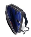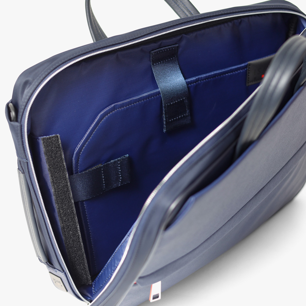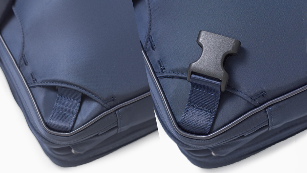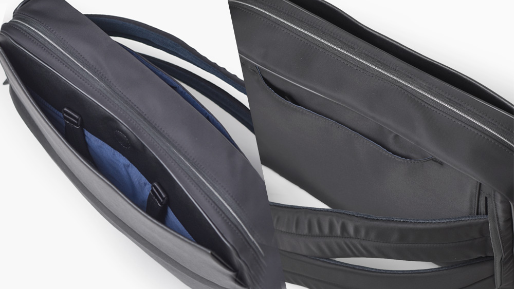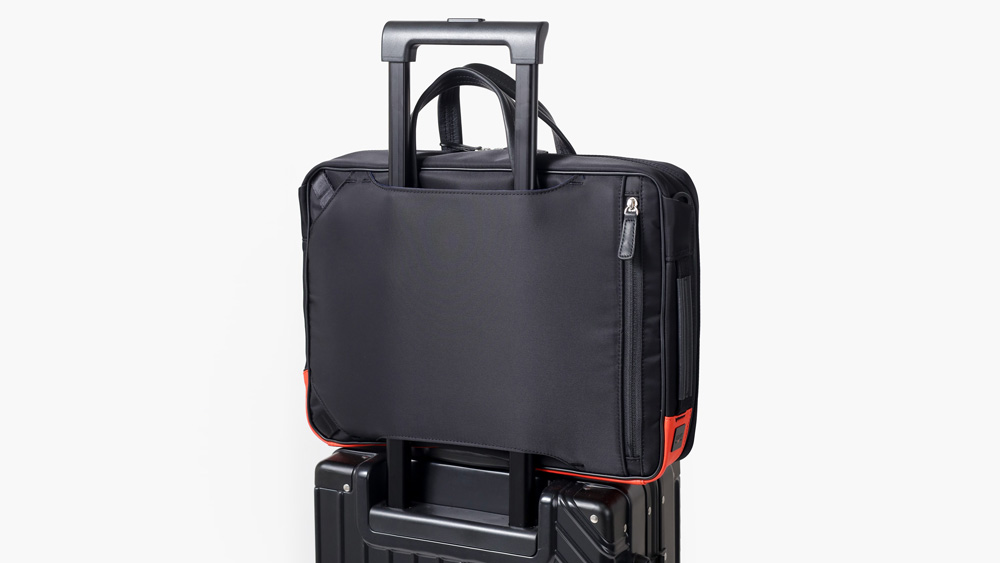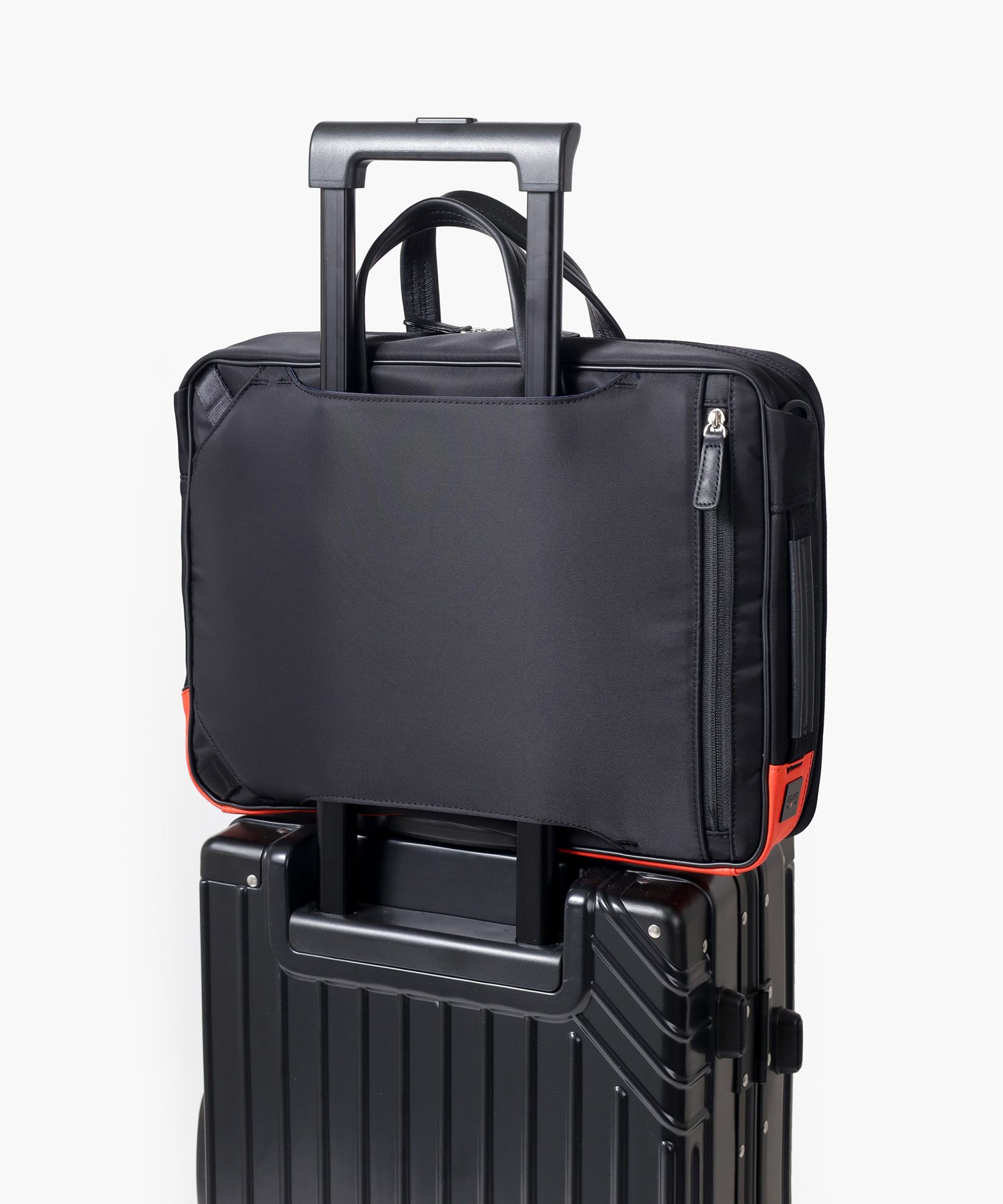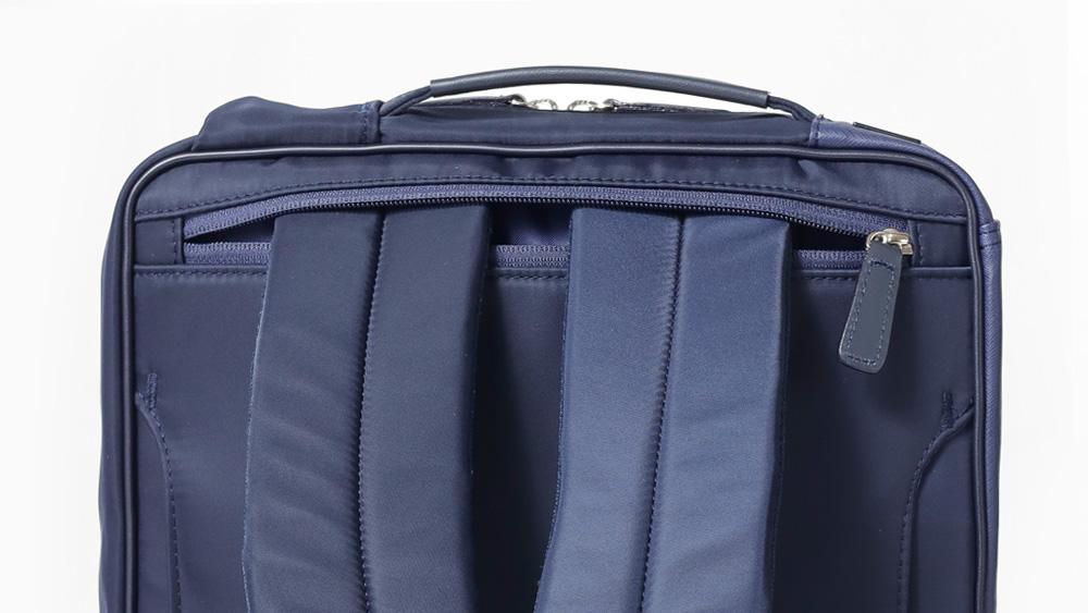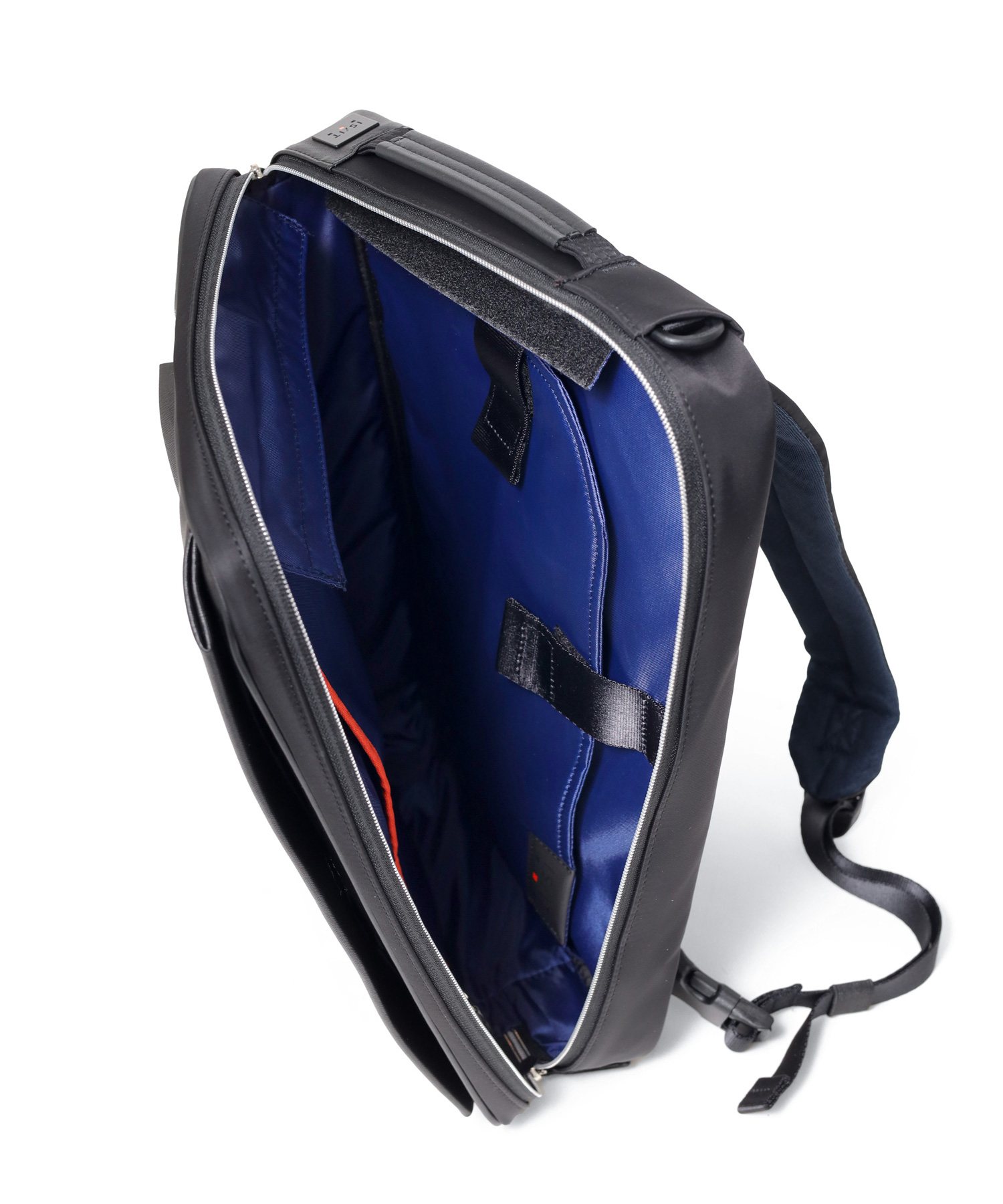 カバンの背側ファスナー内には、リュック紐が収納されています。バックルに装着してリュックスタイルとしても活躍します。マチ部分はマジックテープで開閉できるため、リュックとしてカバンを縦型に使うときもカバンの上部から荷物を出し入れすることができます。バックル部分は普段使いする際は見えないように収まります。また、手持ちハンドルも前後の収納スペースに完全に入れておくことができるため、リュックを背負っている時や、カバンを斜め掛けにする時にも邪魔になりません。背側にはセットアップ機能付きなので出張にも便利です。