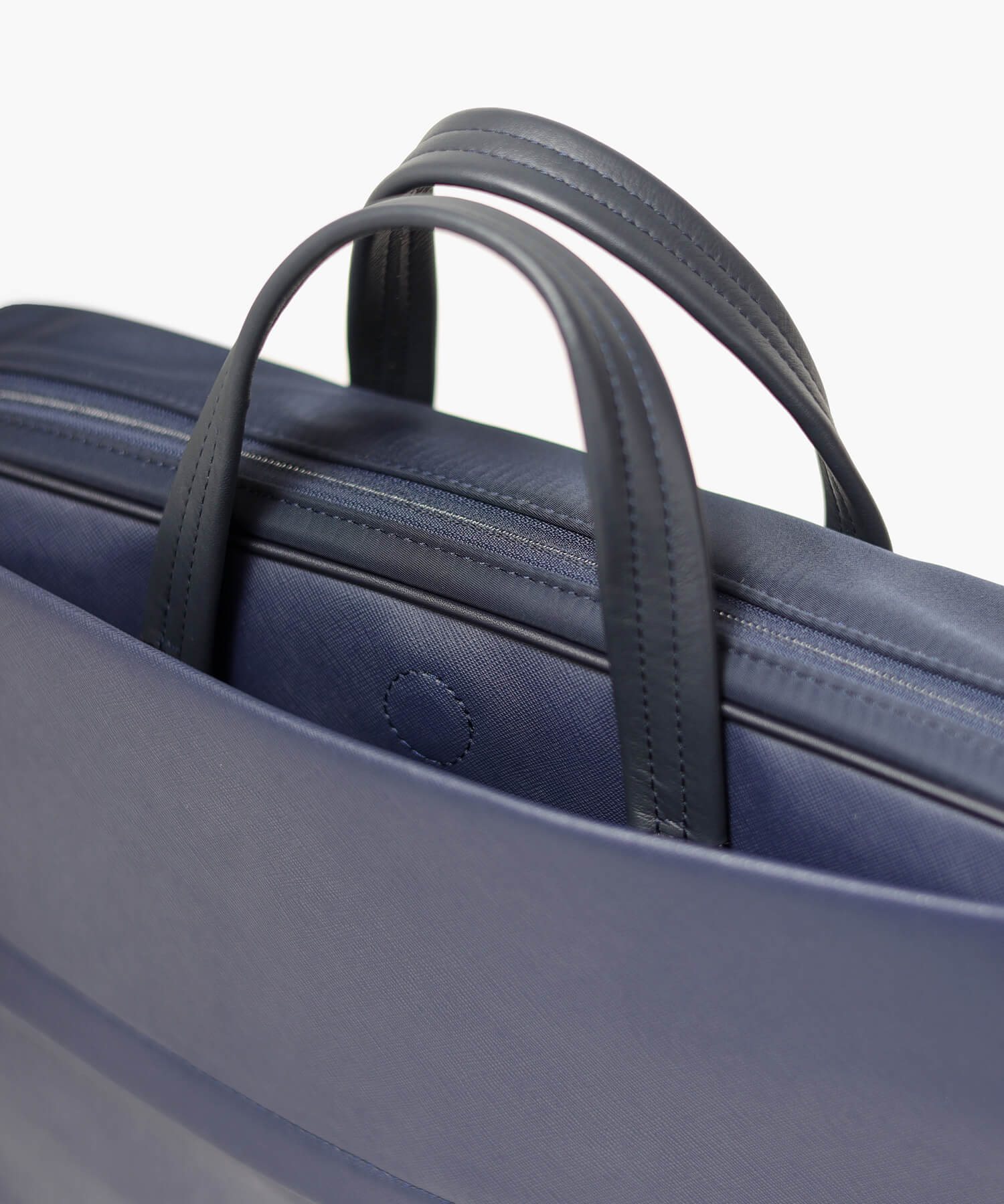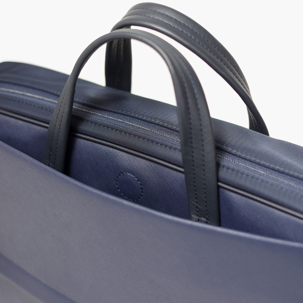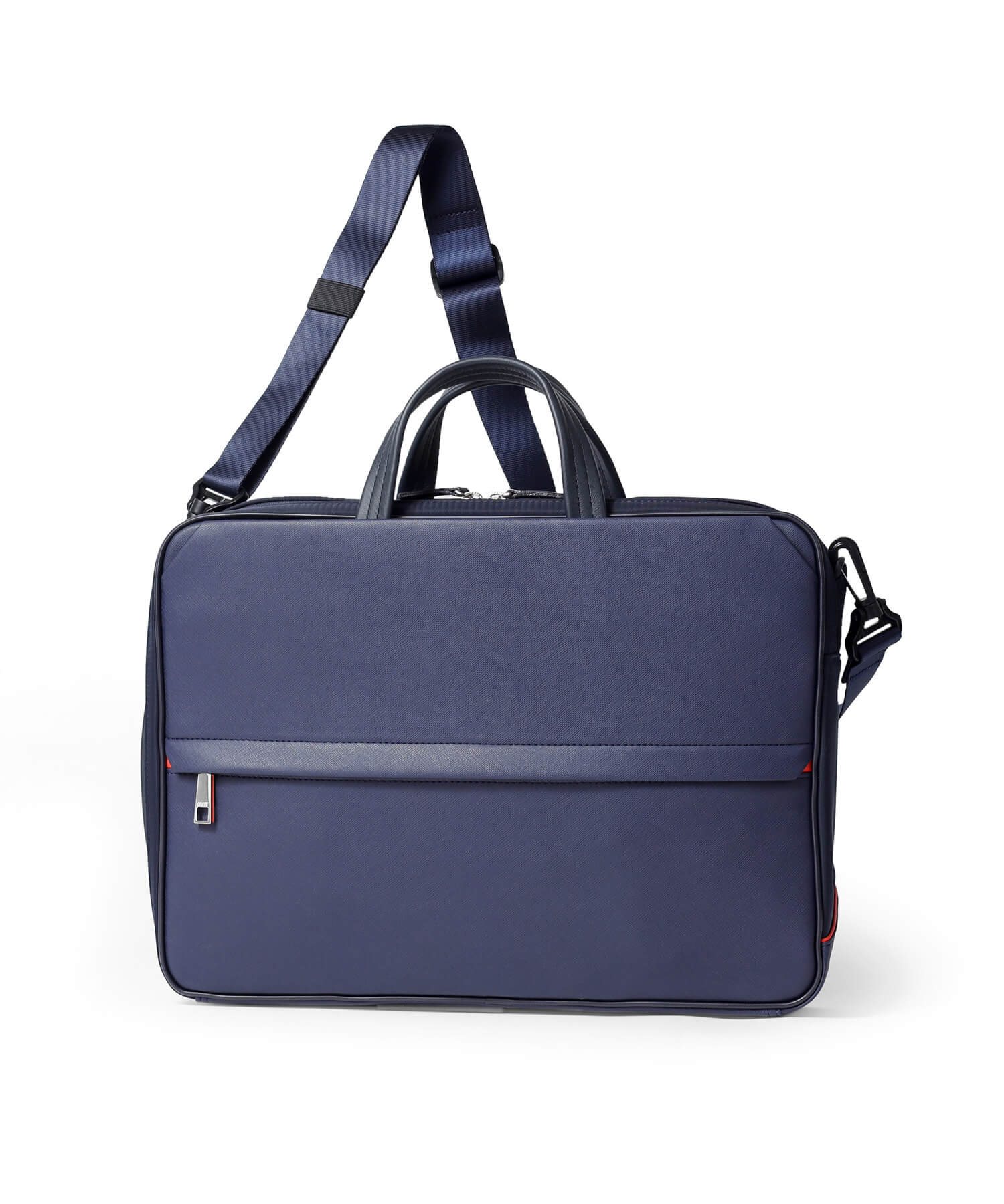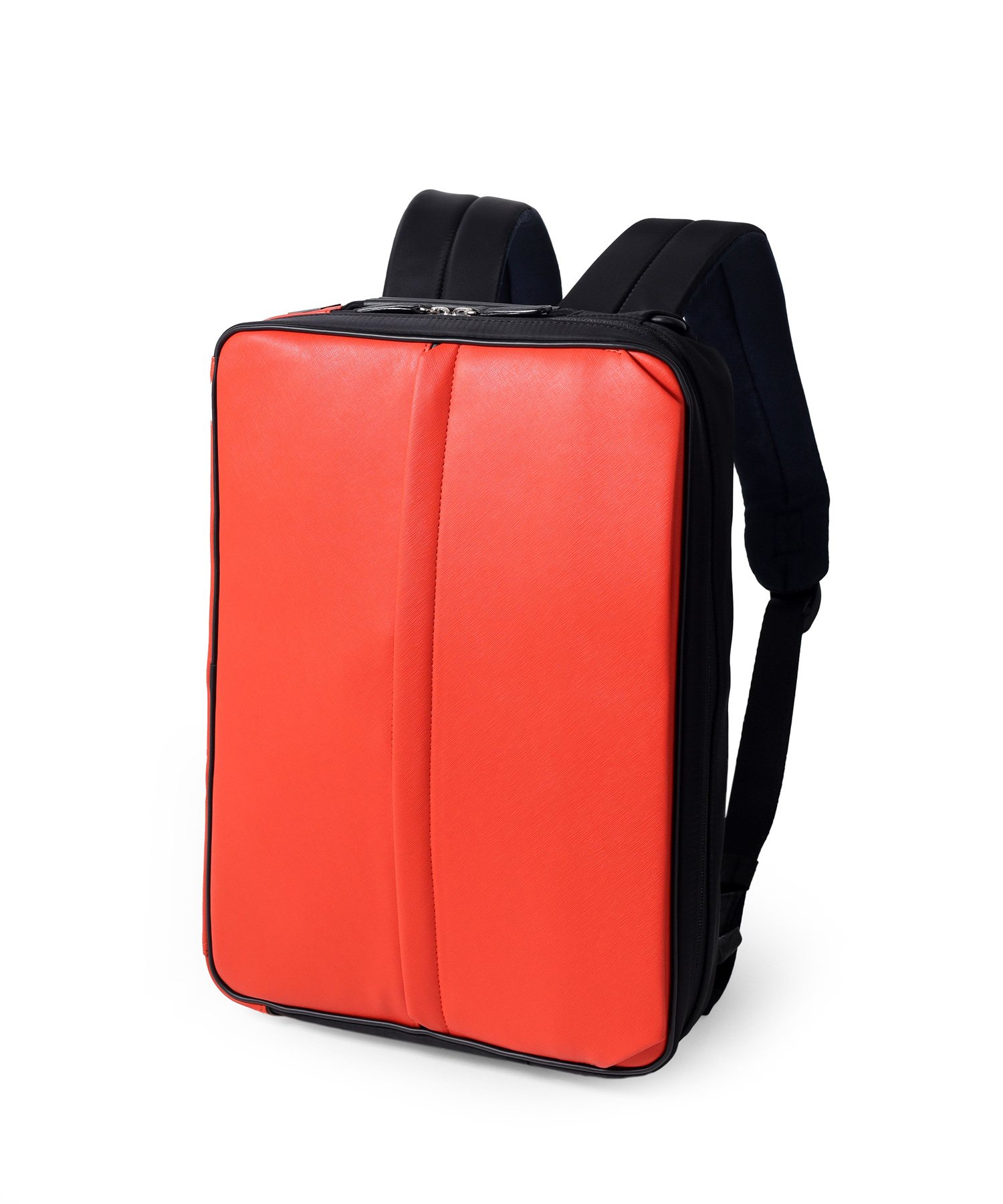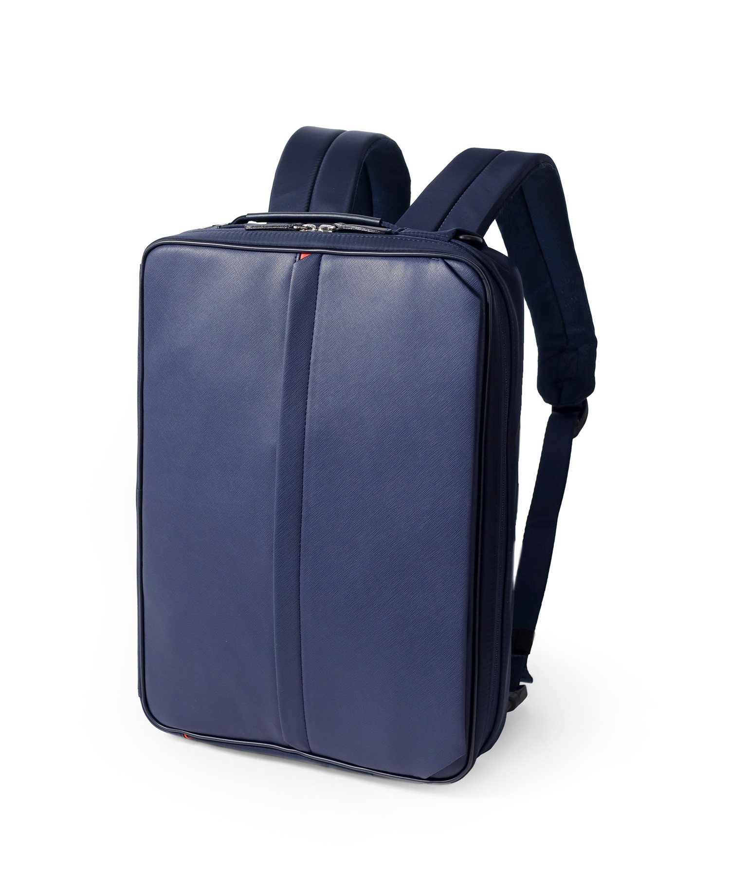 前面にはサフィアーノ型合成皮革を、ハンドルには手に馴染む牛革を、そしてマチと背面にはナイロンを使用した異素材コンビでスッキリとしたデザインのA4サイズの3WAYビジネスバッグ。シーンに合わせて、リュックやショルダーとしてもお使いいただけます。
