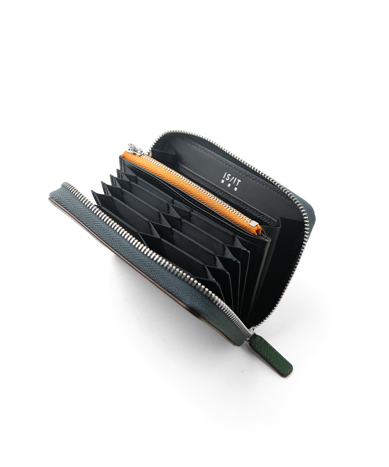 蛇腹仕様のカードポケットで開いた瞬間に一目でカードの判断が可能な特殊な製法によって生まれたラウンドファスナーセミ長財布。
