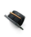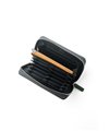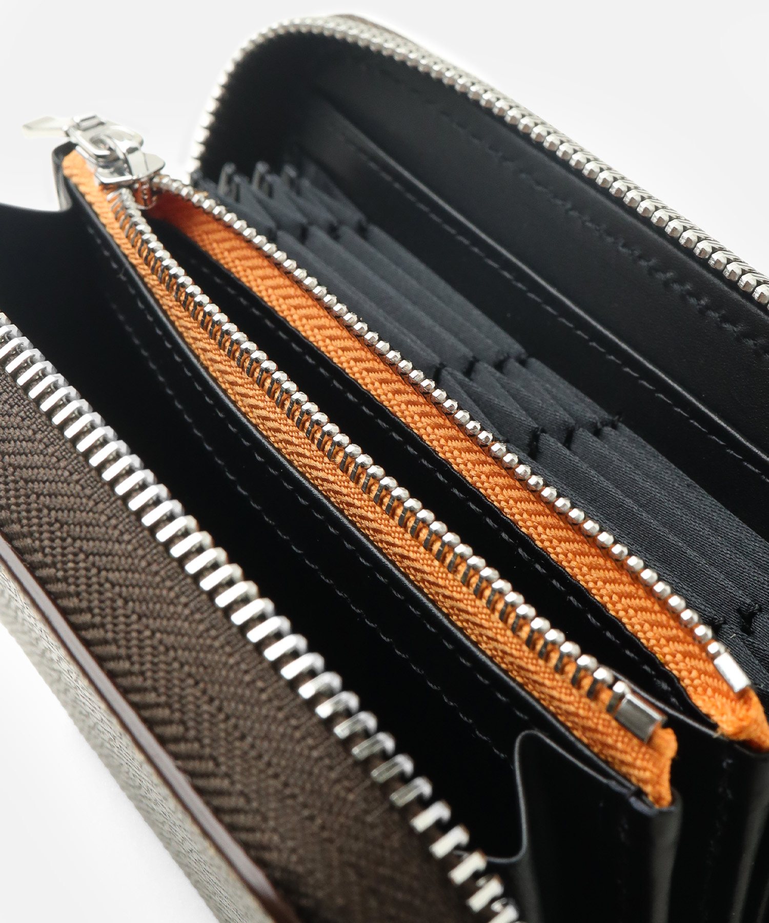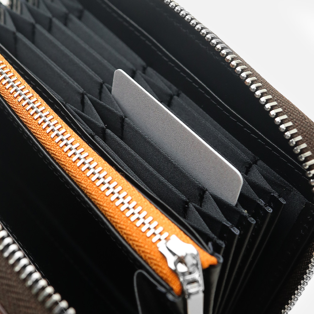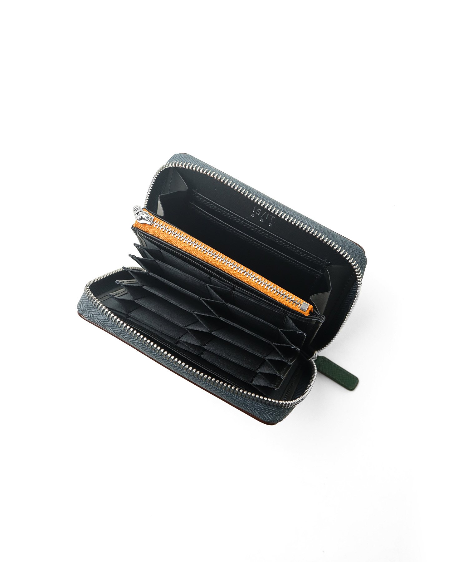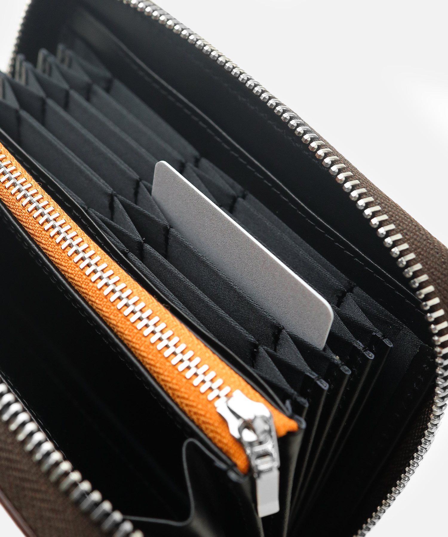開いた瞬間に一目でカードの判断が可能になるように特殊な製法によって生まれたラウンドファスナーセミ長財布。蛇腹仕様のカードポケットは通常のカードポケットで発生するデッドスペースを限りなく無くすことで、コンパクトにすることができる他、カードの視認性に優れた構造となっています。