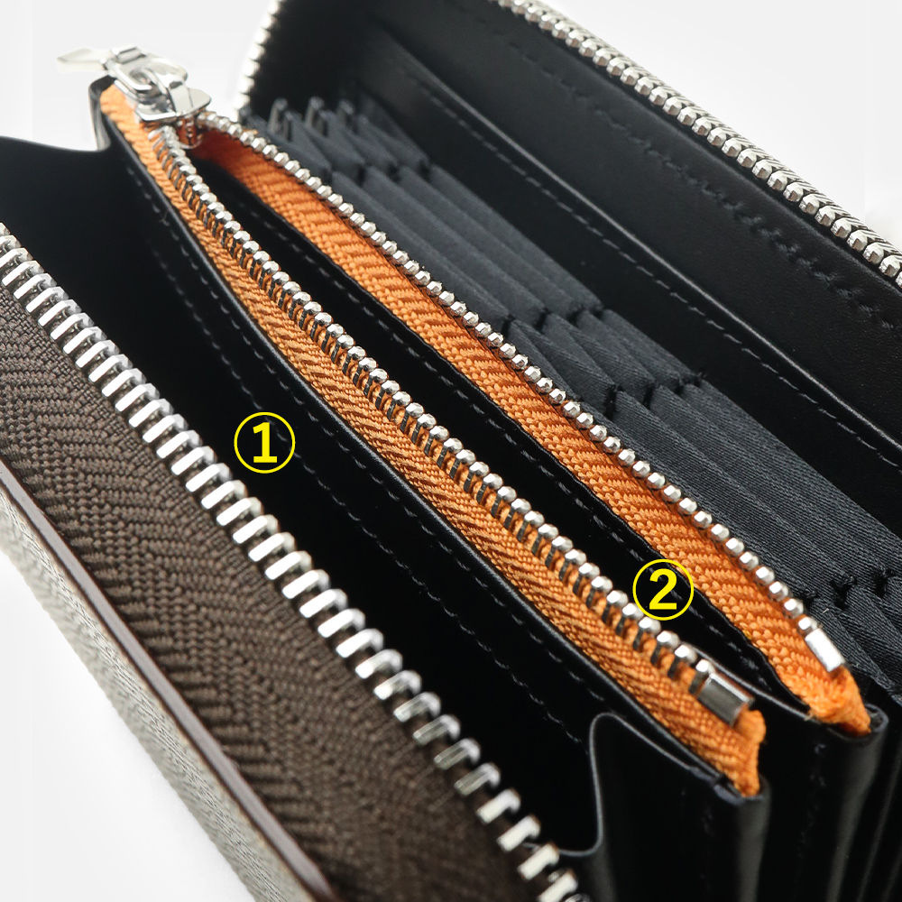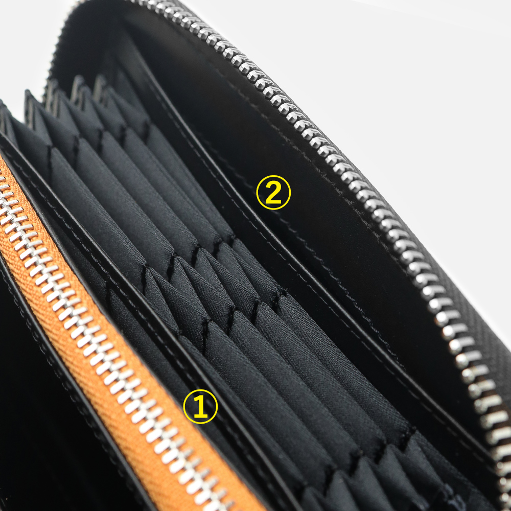 一般的なカードポケットと比べ蛇腹仕様のカードポケットはカードが重なるように収納できるので横幅を狭くすることが可能です。またファスナーテープは通常20mm前後ですがカードの収納力を高めるため4mm程広く作られています。