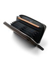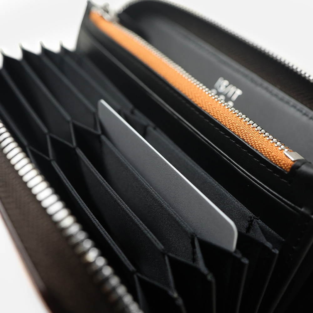 開いた瞬間に一目でカードの判断が可能になるように特殊な製法によって生まれた蛇腹仕様のラウンドファスナー長財布。