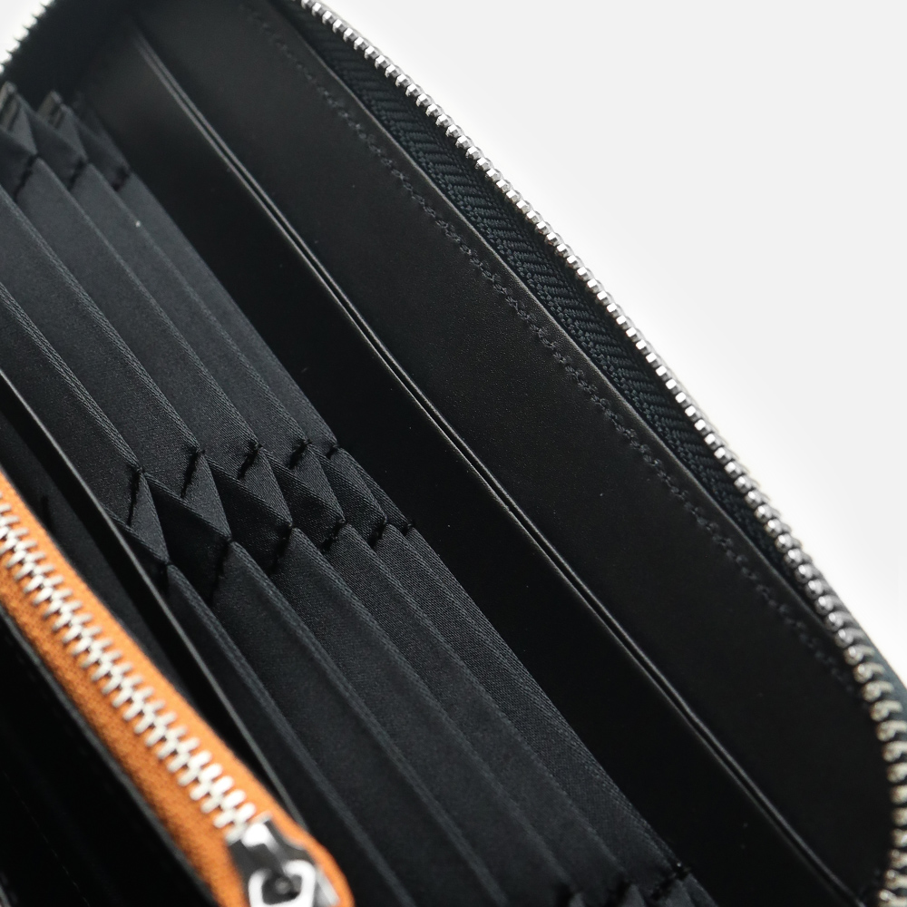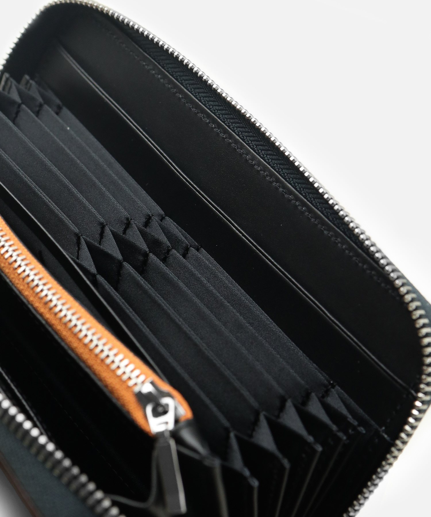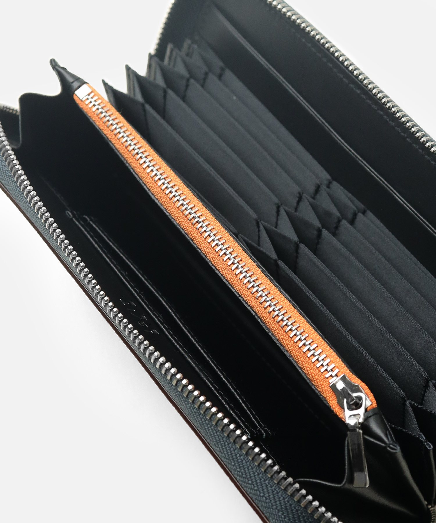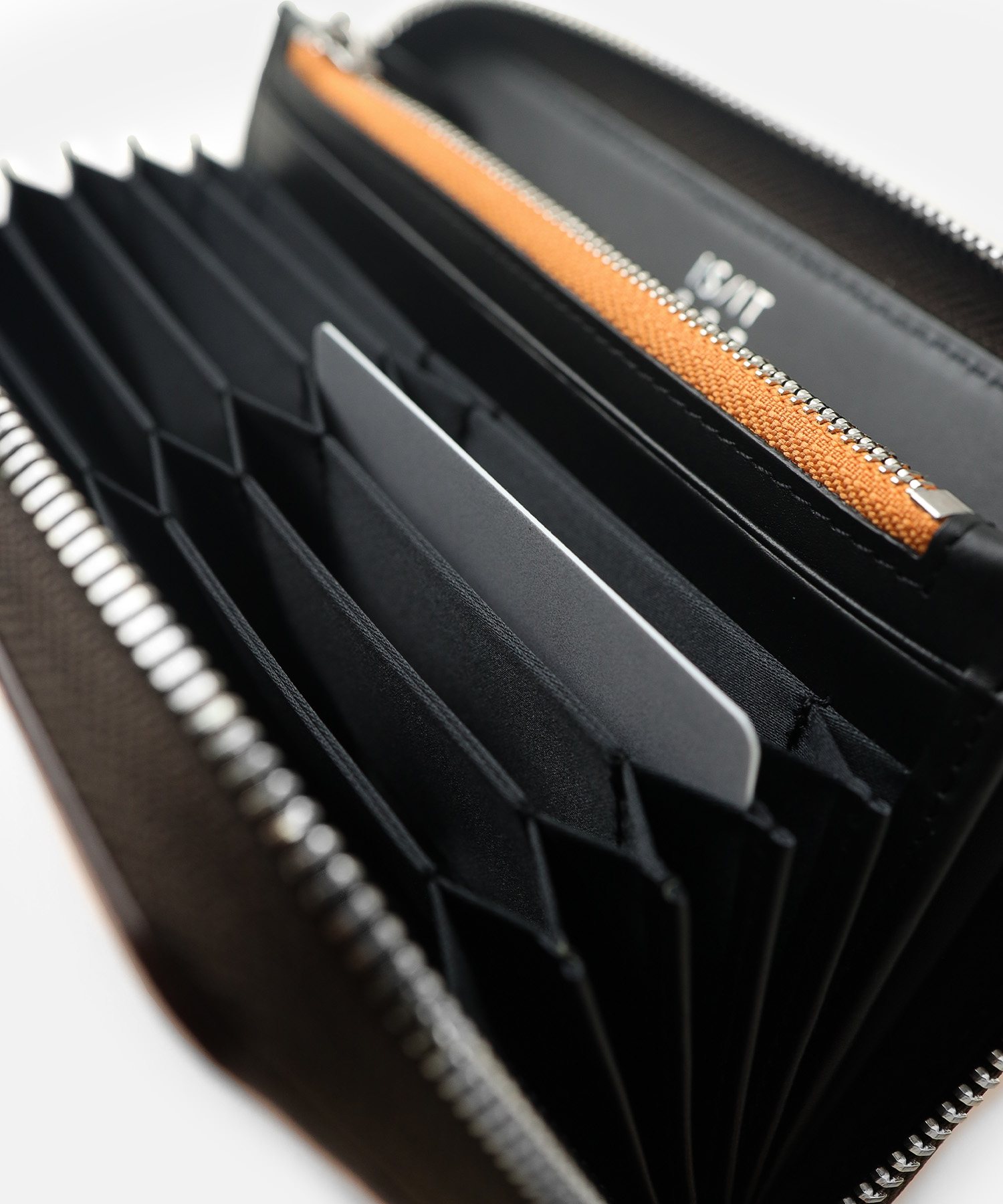 開いた瞬間に一目でカードの判断が可能になるように特殊な製法によって生まれたラウンドファスナー長財布。蛇腹仕様のカードポケットは通常のカードポケットで発生するデッドスペースを限りなく無くすことで、コンパクトにすることができる他、カードの視認性に優れた構造となっています。