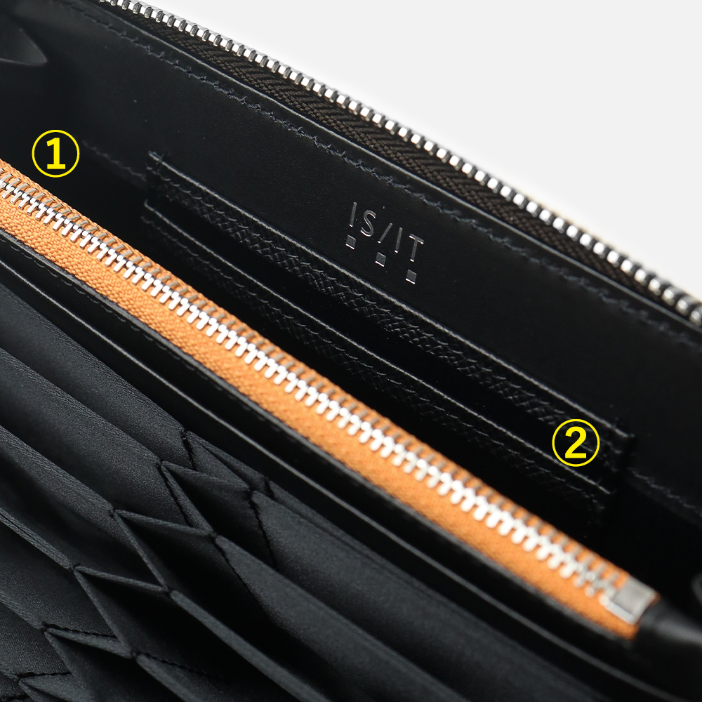 < 一般的なカードポケットと比べ蛇腹仕様のカードポケットはカードが重なるように収納できるので横幅を狭くすることが可能です。またファスナーテープは通常20mm前後ですがカードの収納力を高めるため4mm程広く作られています。