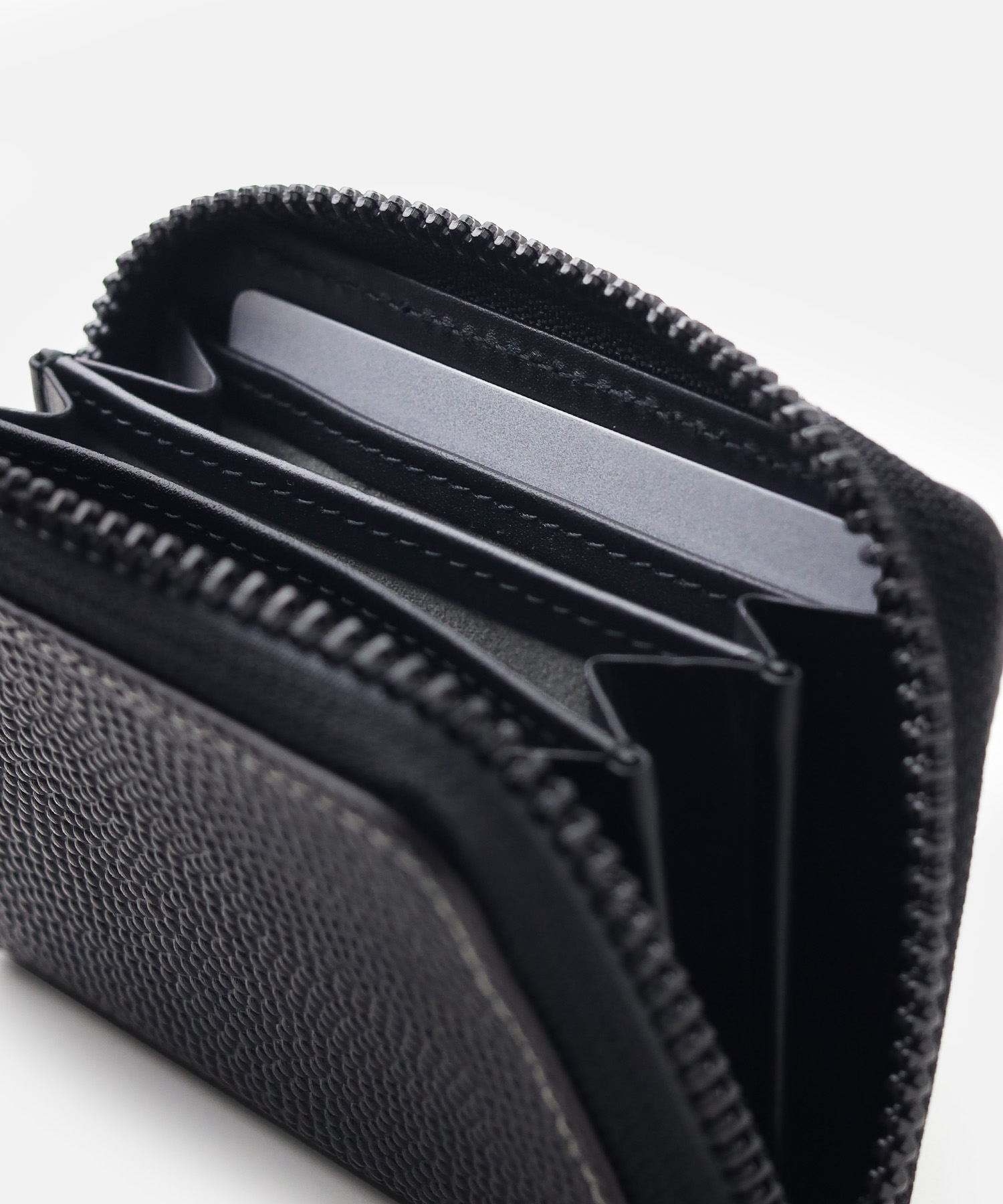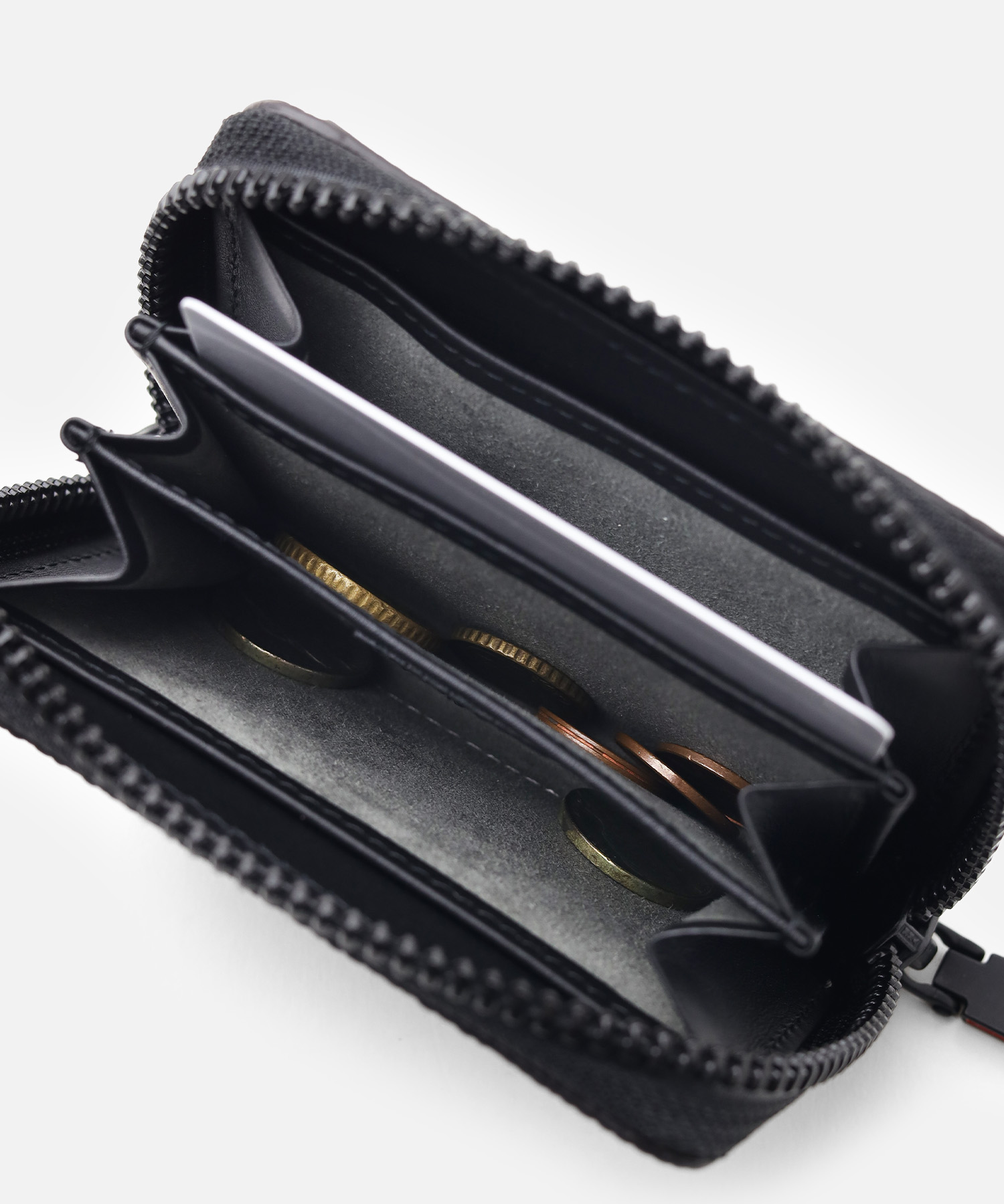 素材だけでなく、内装も便利な機能を搭載しており、内装は三層に分かれたポケットに小銭はもちろんカードを収納できます。また内装両端にカードポケットが2つあります。