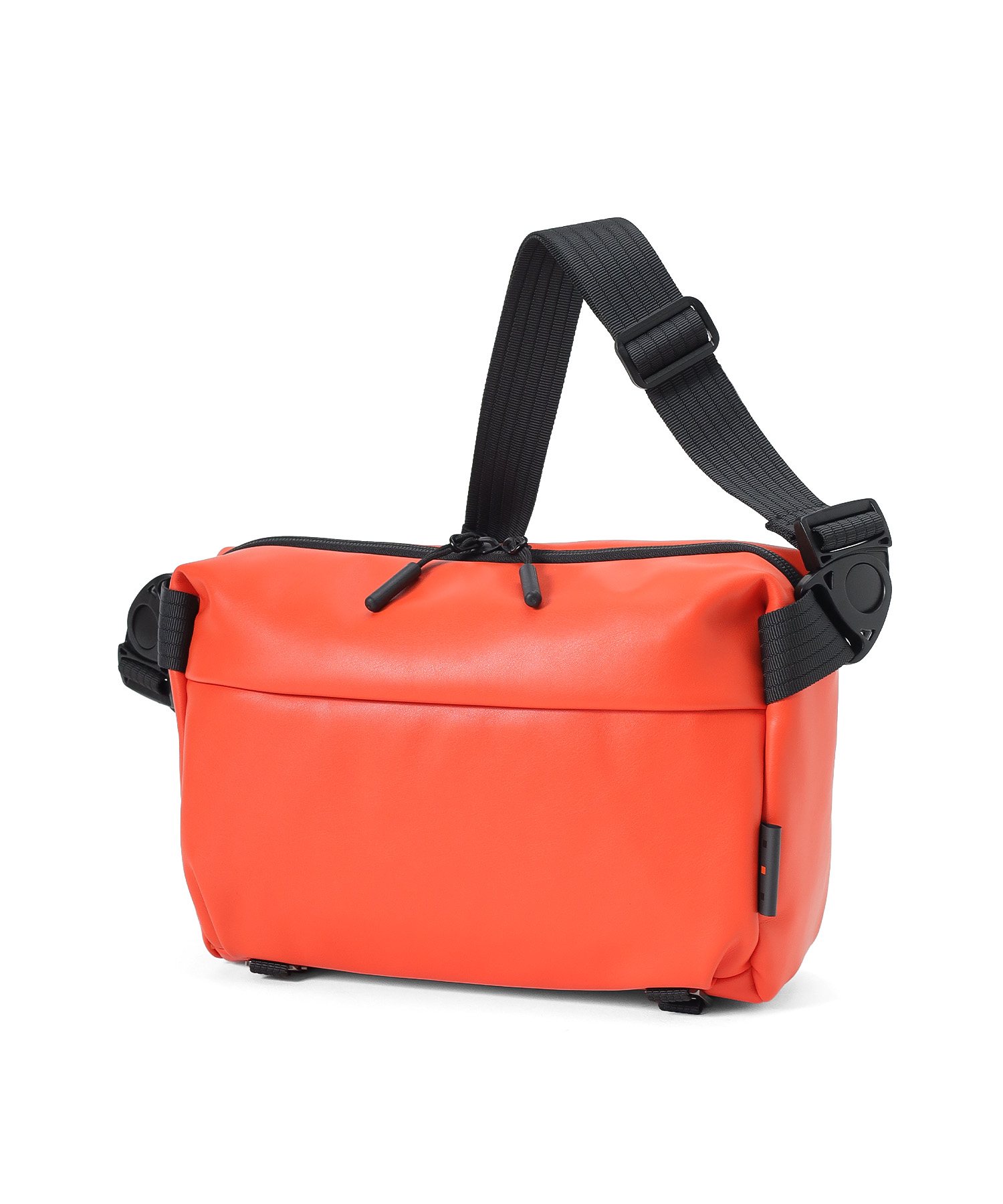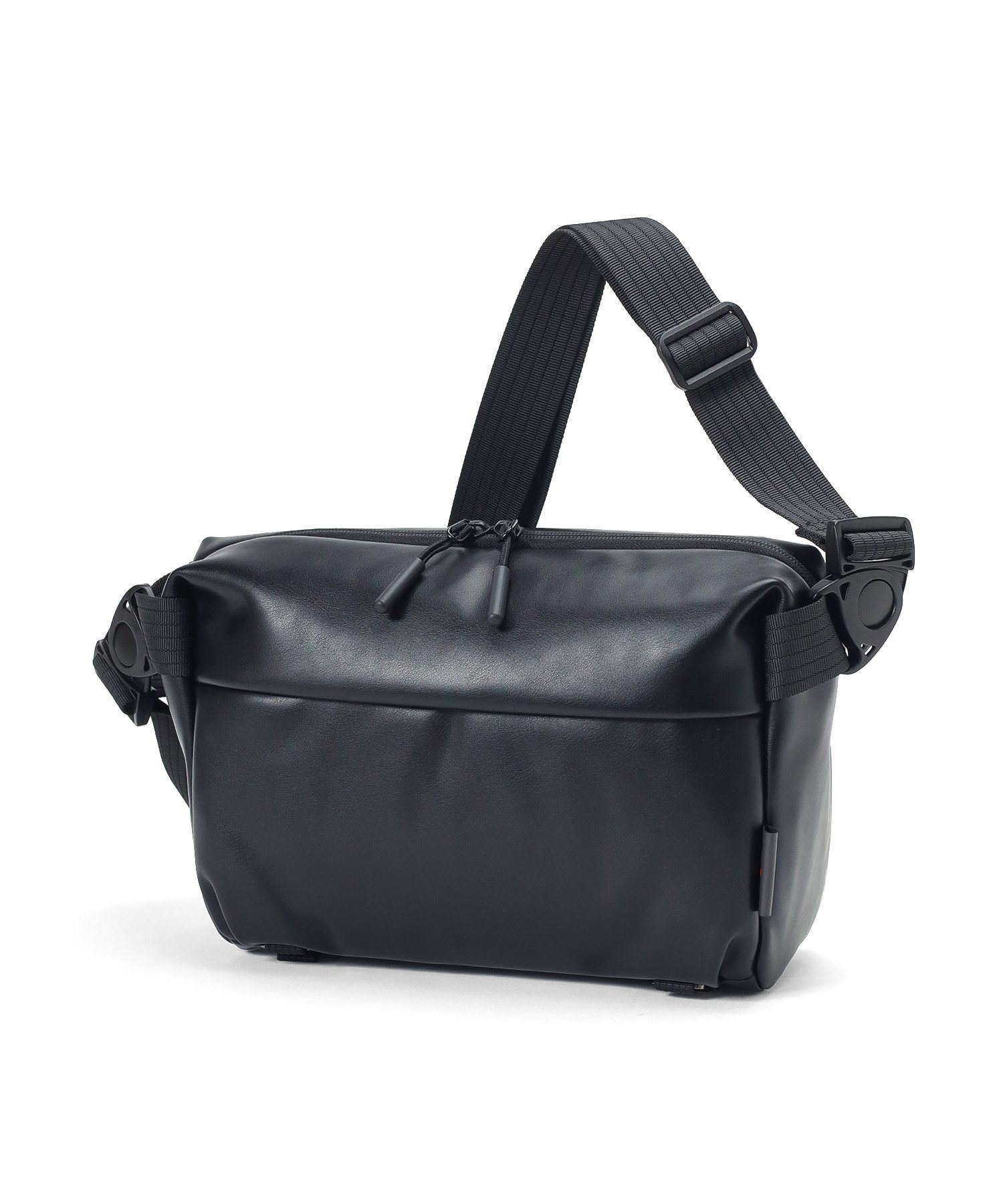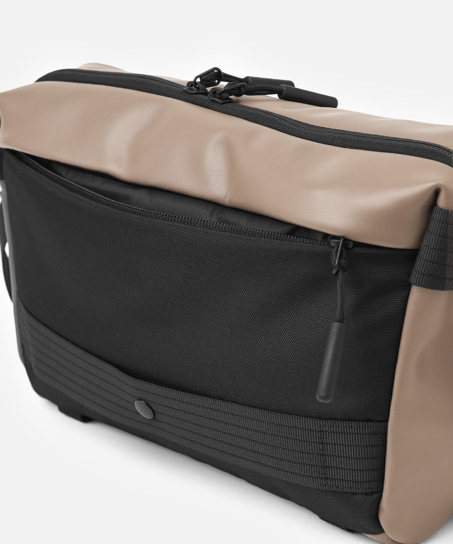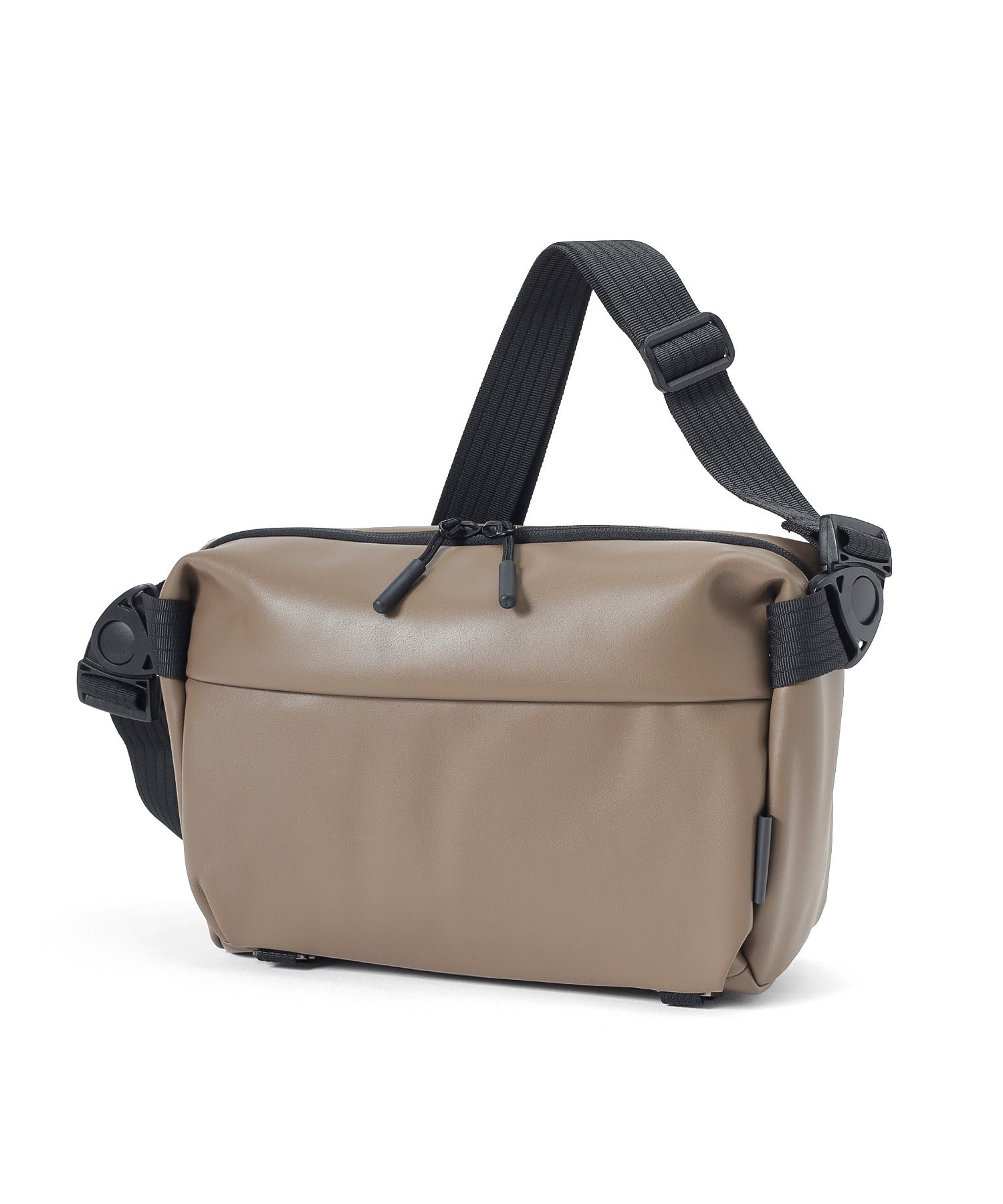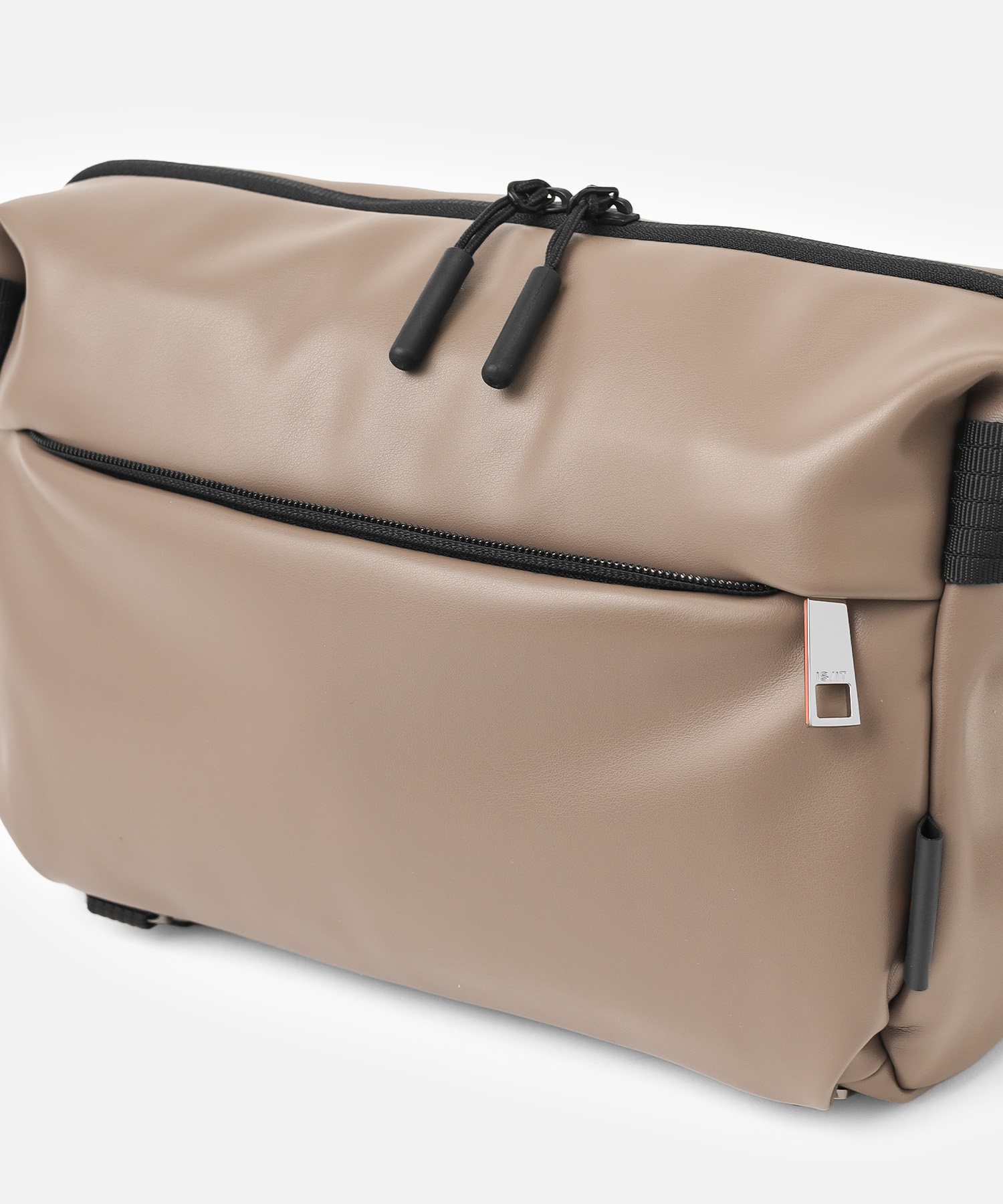 本体の底部から上部にかけてマチ幅を徐々に狭めることで、ショルダーを掛けた際に身体のラインに自然と寄り添う、絶妙なフィット感を実現したスリングショルダーバッグです。メイン素材には手触りの良い合皮を採用。さらに、ファスナー部分には「撥水コイル」を使用しているため、水分の侵入を防ぎます。突然の雨や天候の変化を気にせず、毎日アクティブにお使いいただける頼もしい相棒です。