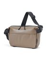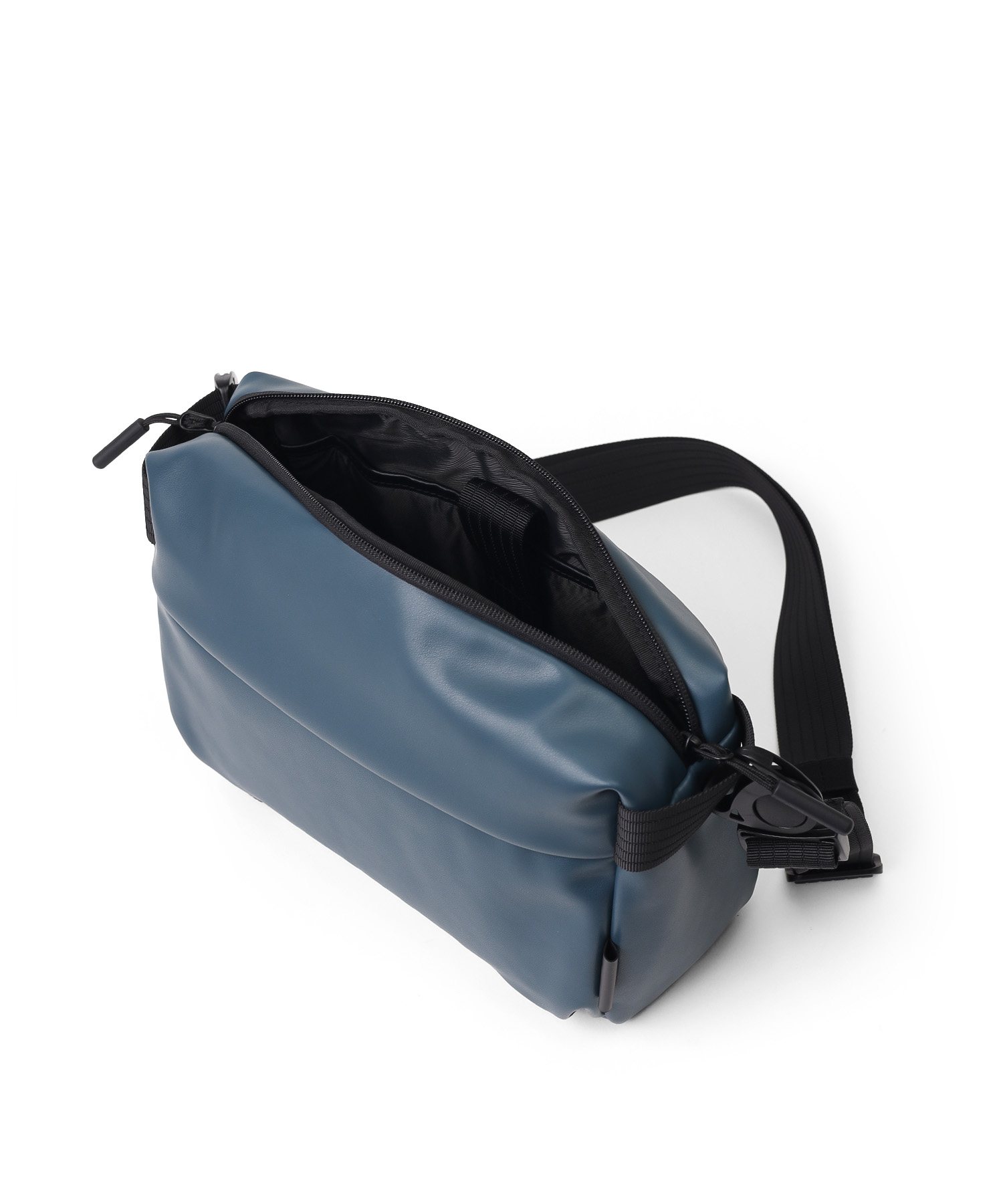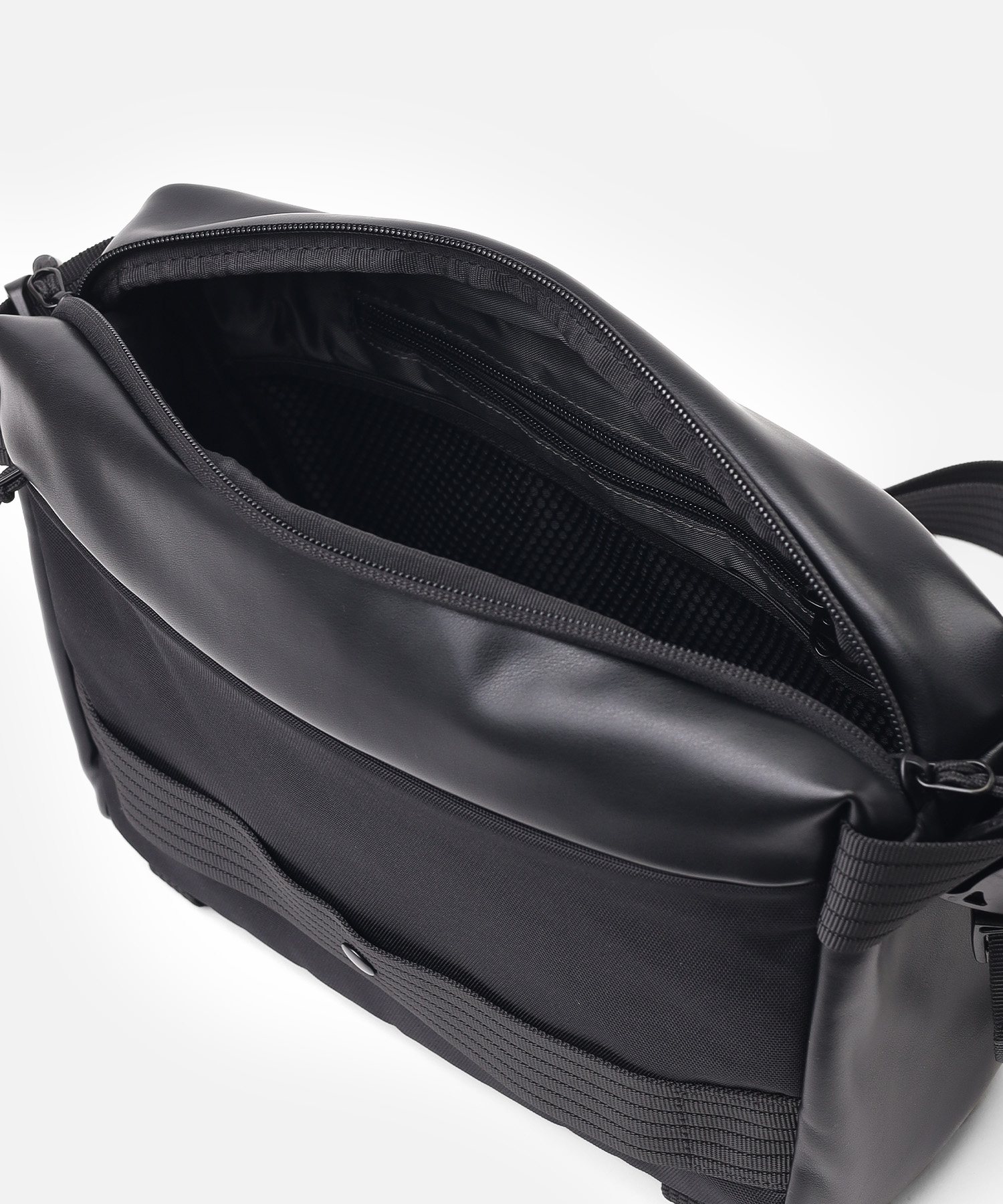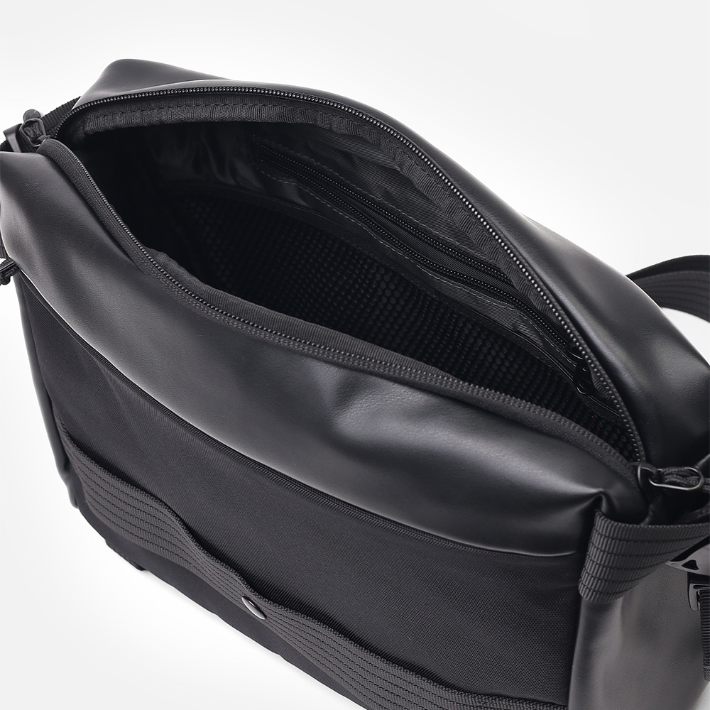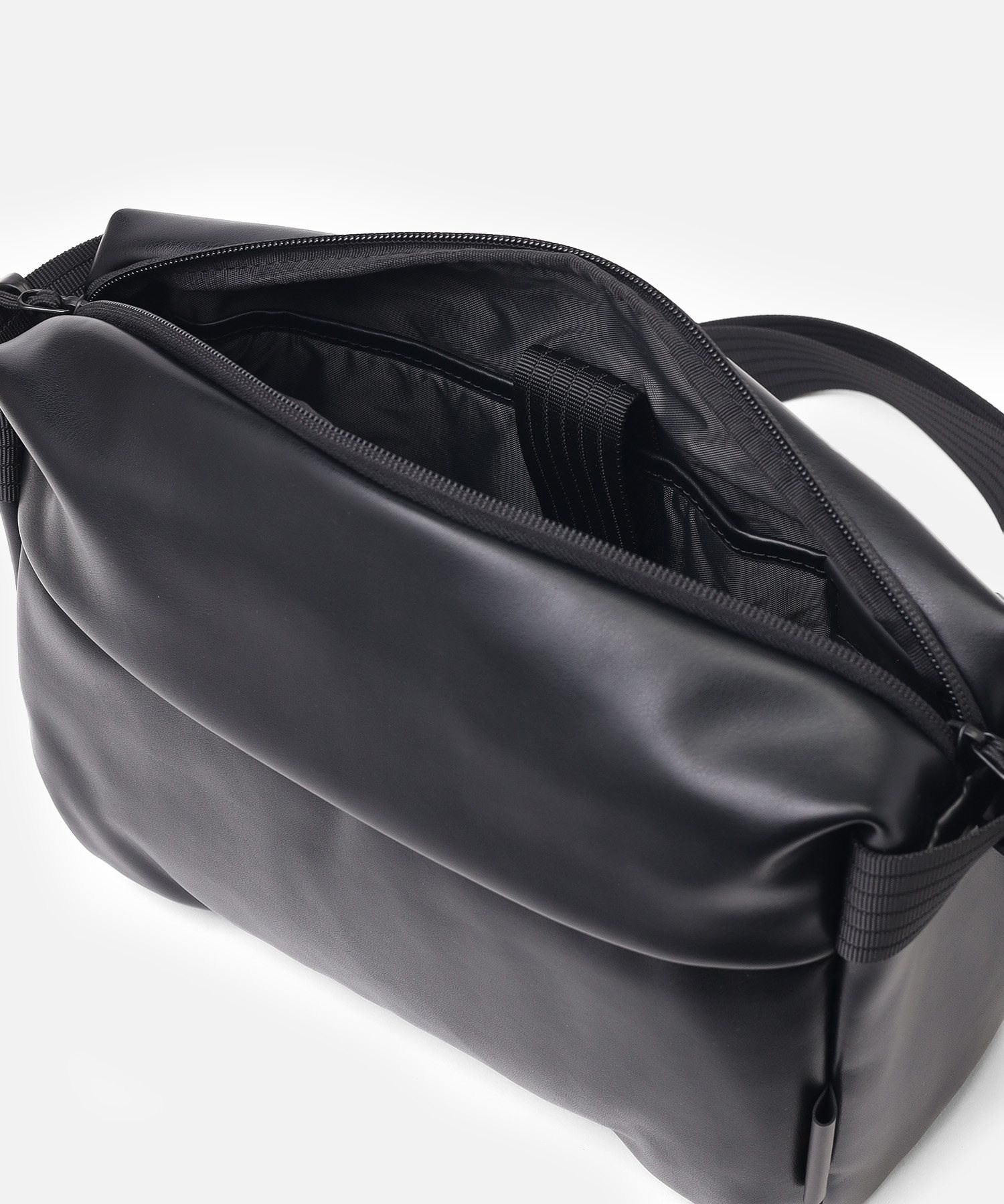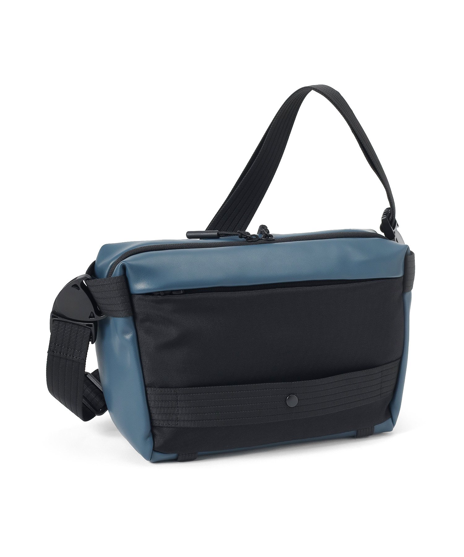 本体の底部から上部にかけてマチ幅を徐々に狭めることで、ショルダーを掛けた際に身体のラインに自然と寄り添う、絶妙なフィット感を実現したスリングショルダーバッグです。メイン素材には手触りの良い合皮を採用。さらに、ファスナー部分には「撥水コイル」を使用しているため、水分の侵入を防ぎます。突然の雨や天候の変化を気にせず、毎日アクティブにお使いいただける頼もしい相棒です。