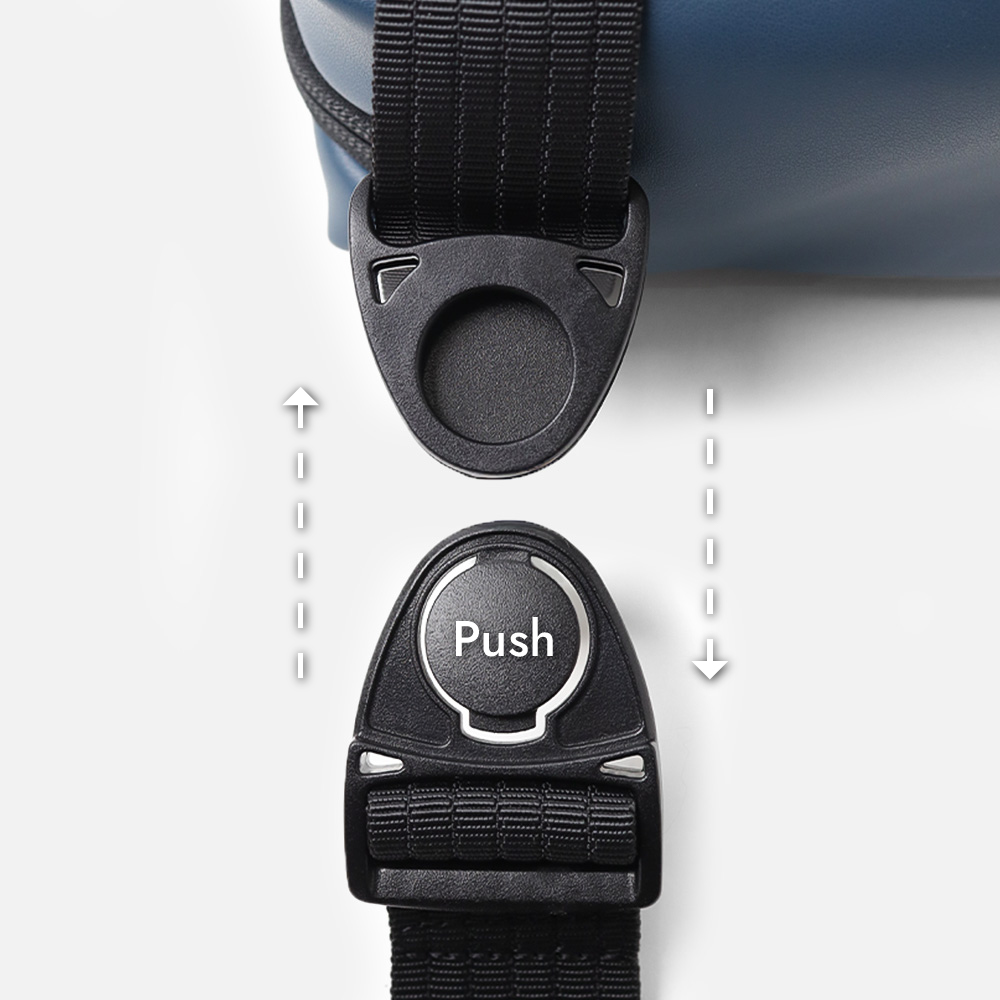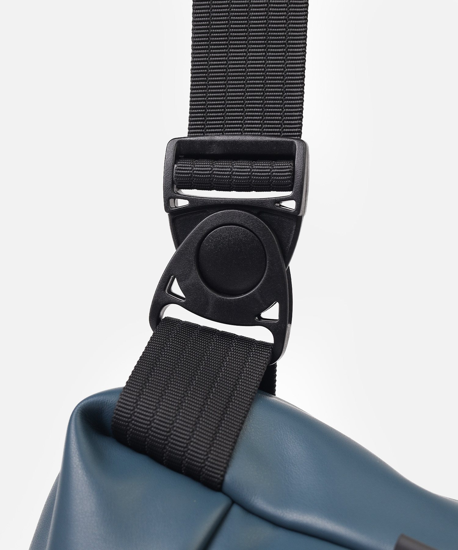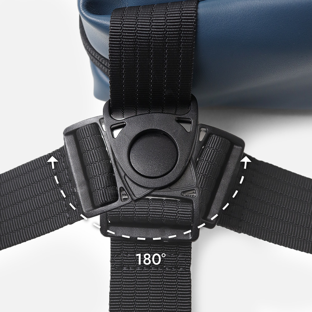 ショルダーベルトの接続部は、バックルを軸に180度回転する可動式を採用。身体の動きに合わせて角度が変わるため、ベルトがねじれたり突っ張ったりせず、常に快適な背負い心地をキープします。また、ワンタッチで着脱できるバックル仕様により、厚手のアウターを着ている時や、混雑した車内でもバッグの積み下ろしがスムーズに行えます。