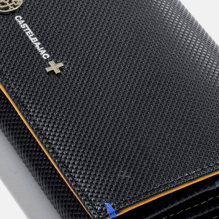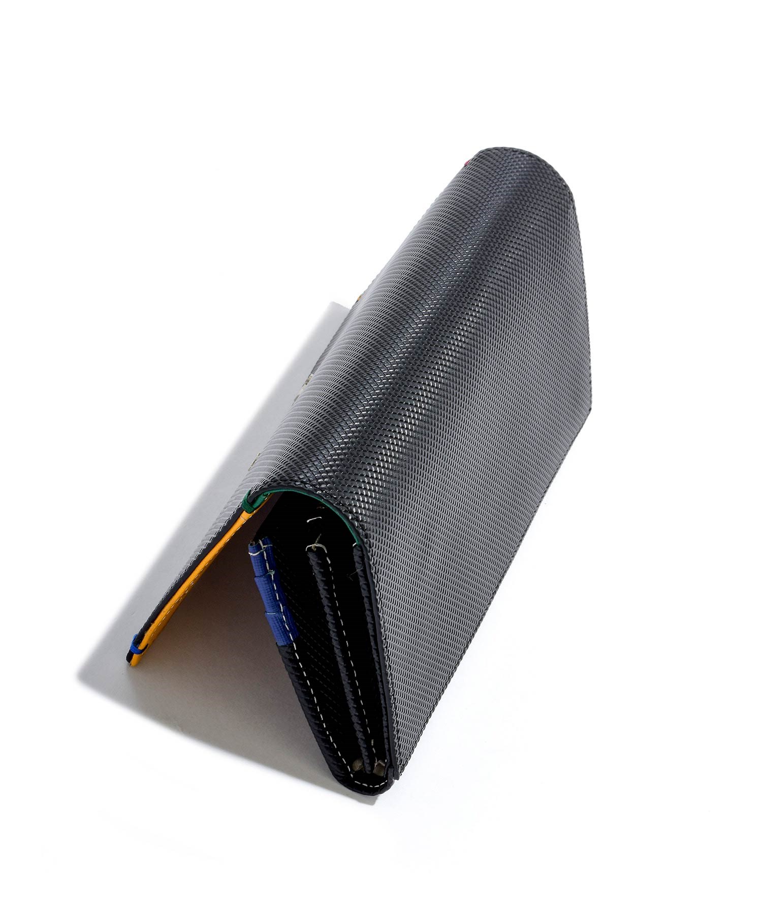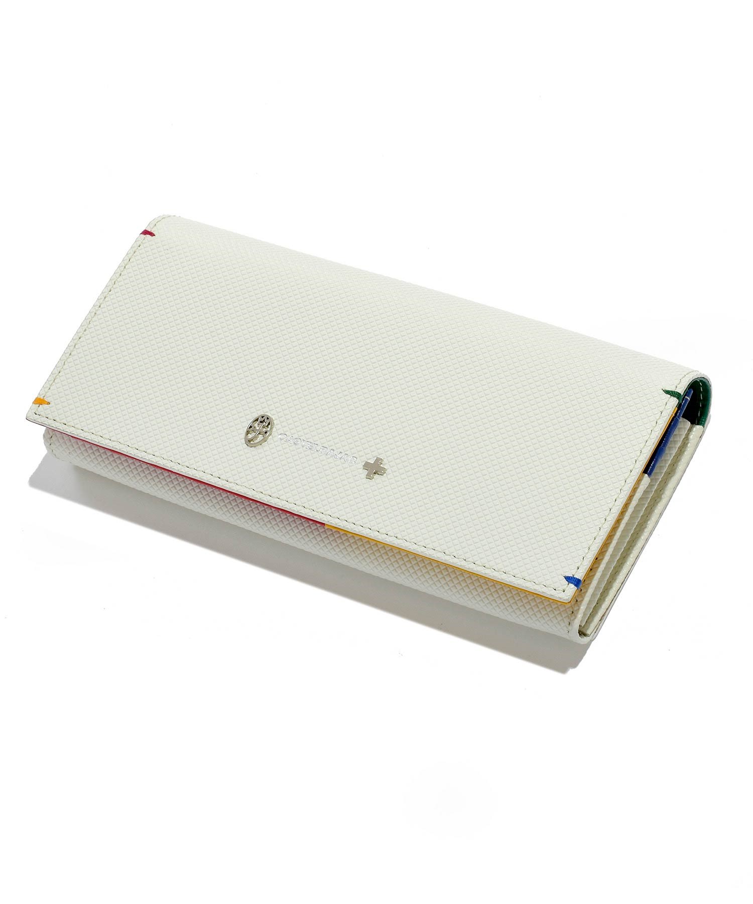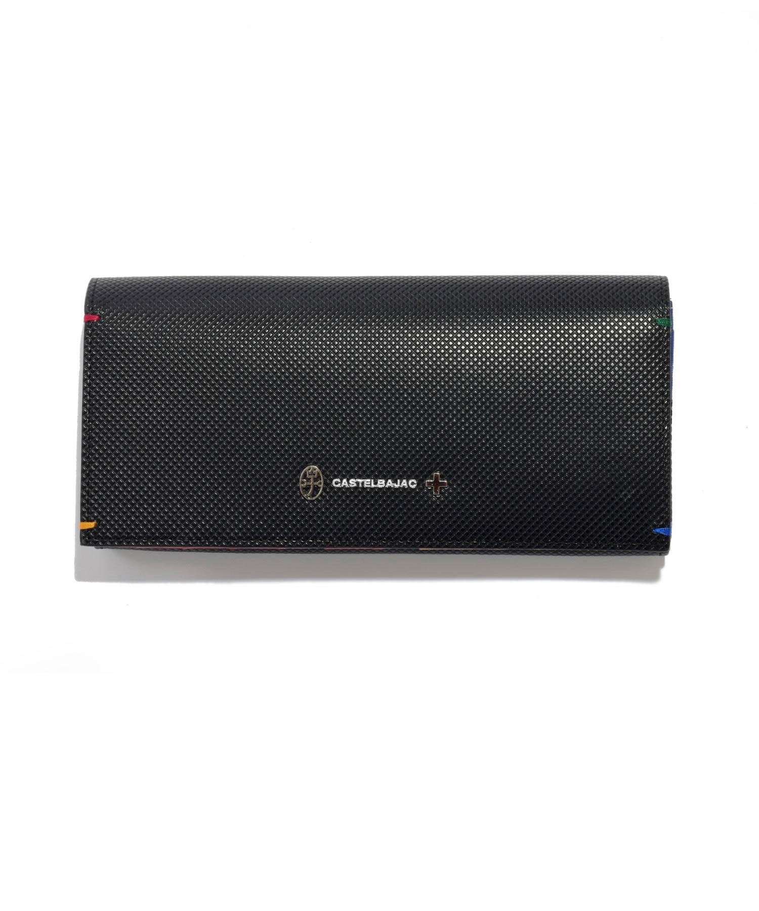 格子柄のエンボス加工を施した牛革を斜めに使用することでダイヤ柄を表現したカステルバジャックらしいPOPな雰囲気の長財布。ツヤ感とダイヤ柄による濃淡で独特の奥行き感と立体感をだしています。四角に施されたカステルバジャックカラーのステッチもデザインポイントです。