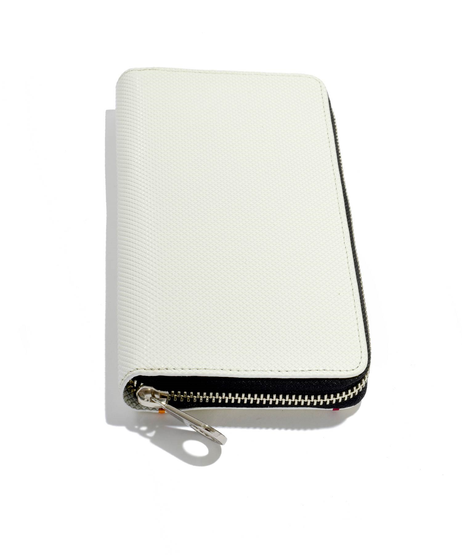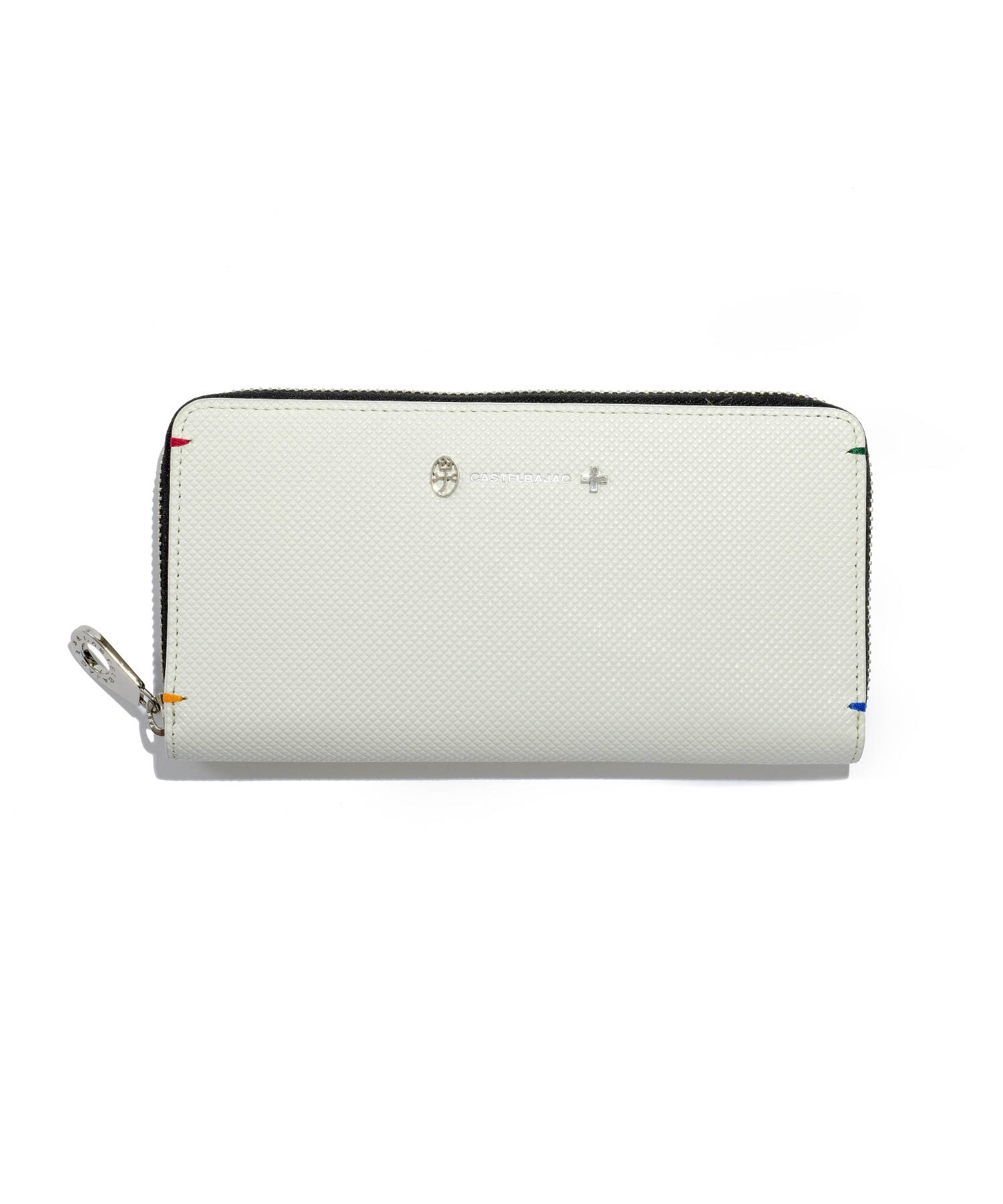 格子柄のエンボス加工を施した牛革を斜めに使用することでダイヤ柄を表現したカステルバジャックらしいPOPな雰囲気のラウンドファスナー長財布。ツヤ感とダイヤ柄による濃淡で独特の奥行き感と立体感をだしています。四角に施されたカステルバジャックカラーのステッチもデザインポイントです。