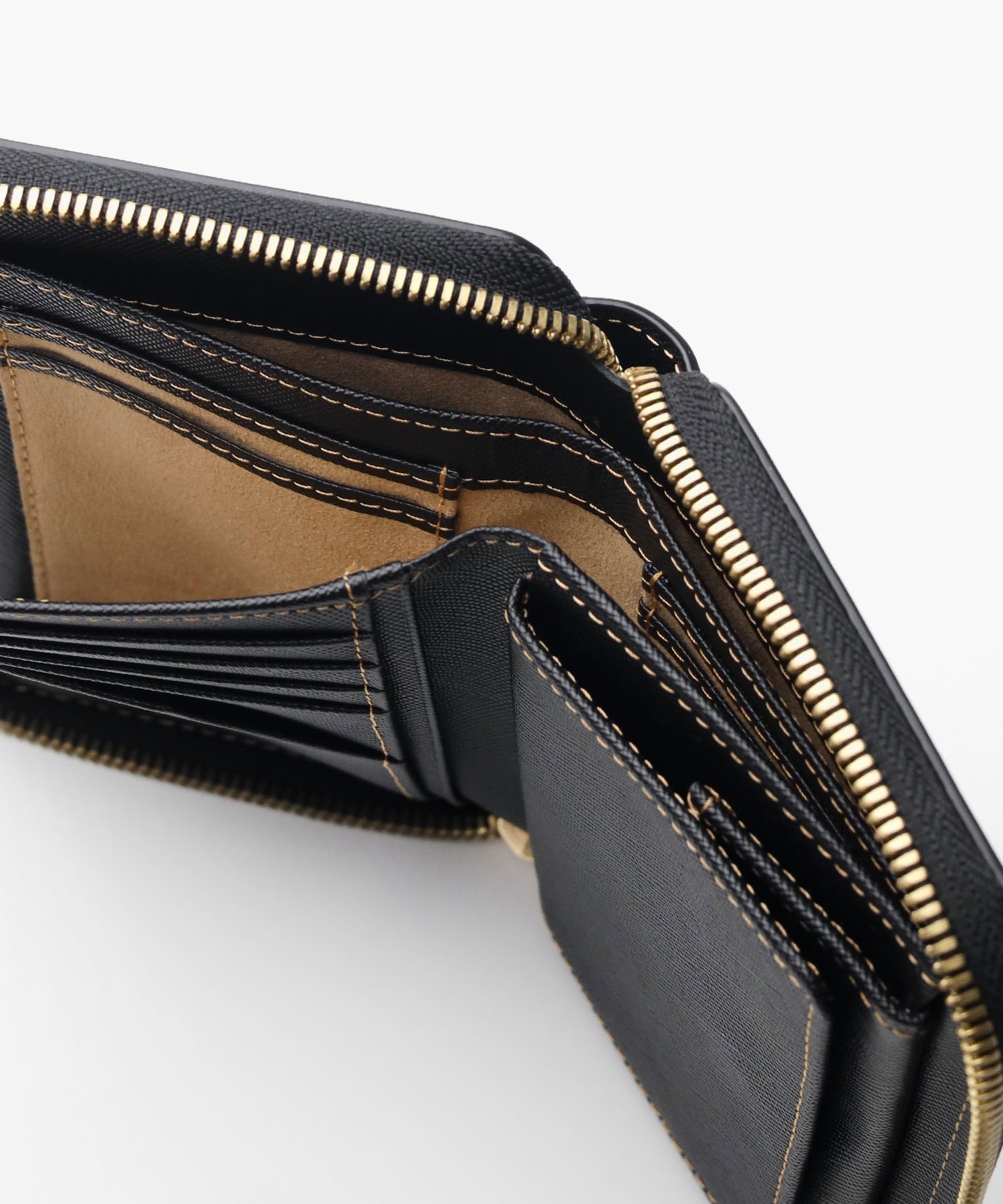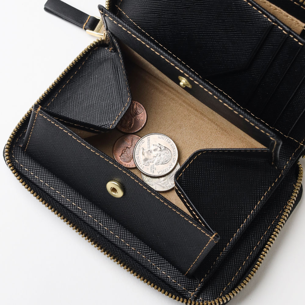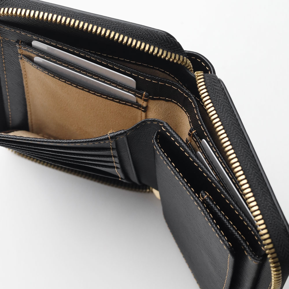 内側にはカード段が5つ、ポケットが3つあり、小銭入れは中身が見やすく取り出しやすいボックス型を採用しています。札入れは2室構造で紙幣を分けて収納することができ、さらに札入れ内にはカードポケットが4つあります。