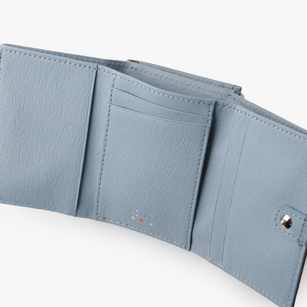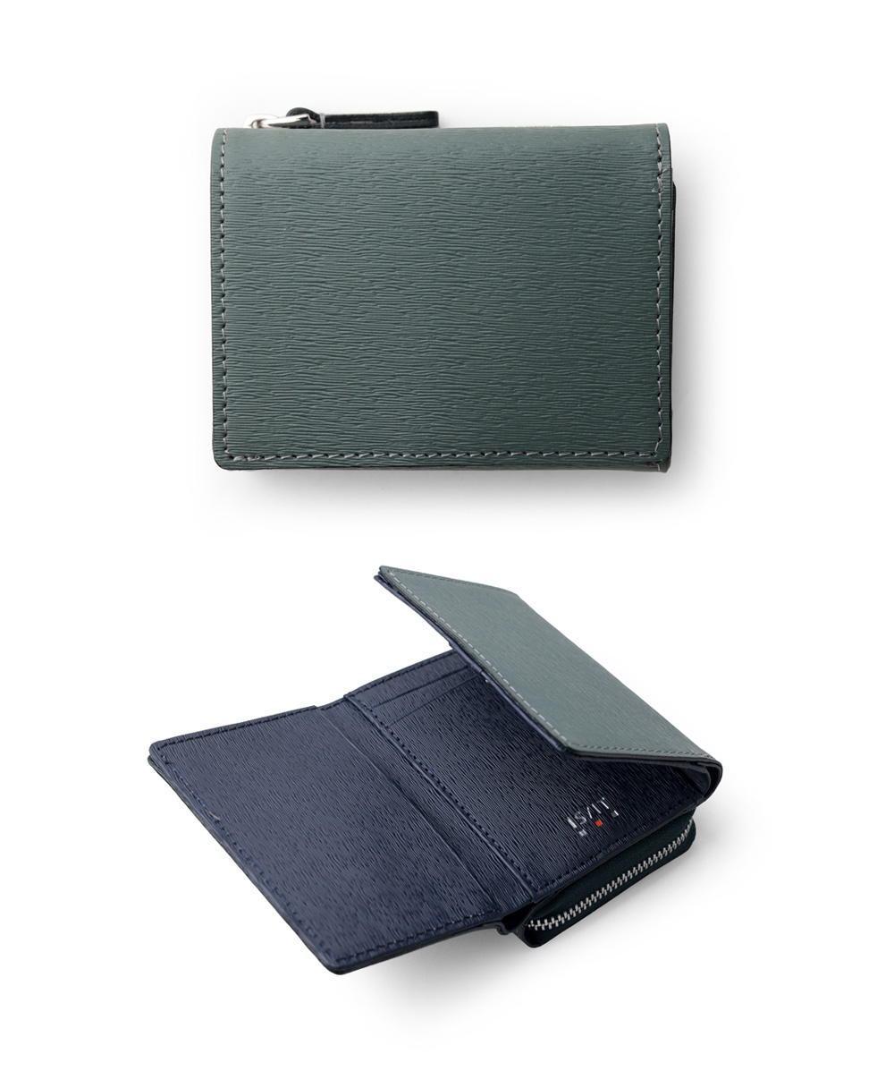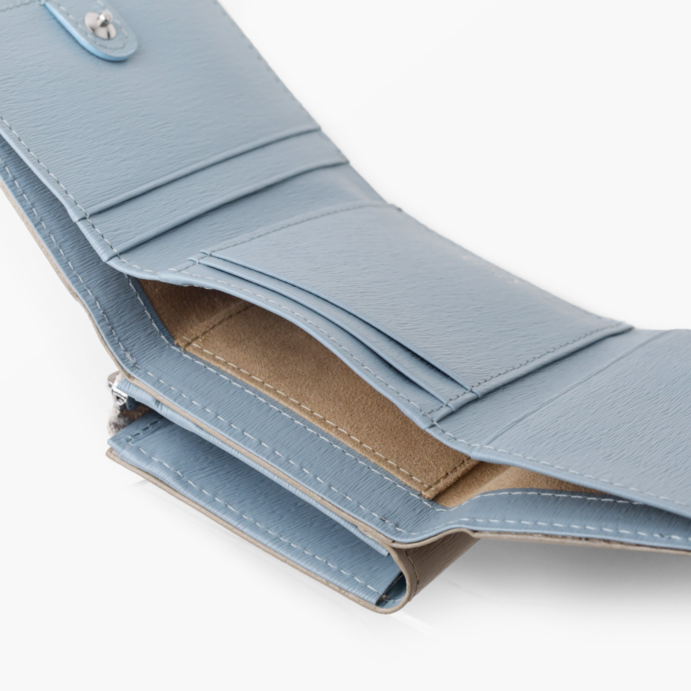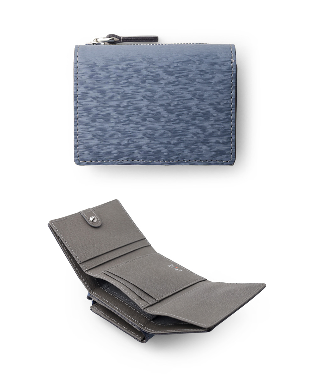 スモーキーなカラーコンビが魅力の三つ折り財布。エンボスレザーを贅沢に使用し、その特徴的な質感が際立ちます。さらに、優れた耐久性を持ち、傷が目立ちにくいので、長く愛用いただけます。ジェンダーレスなデザインとカラーコンビは、男女を問わず幅広い方にお楽しみいただけます。