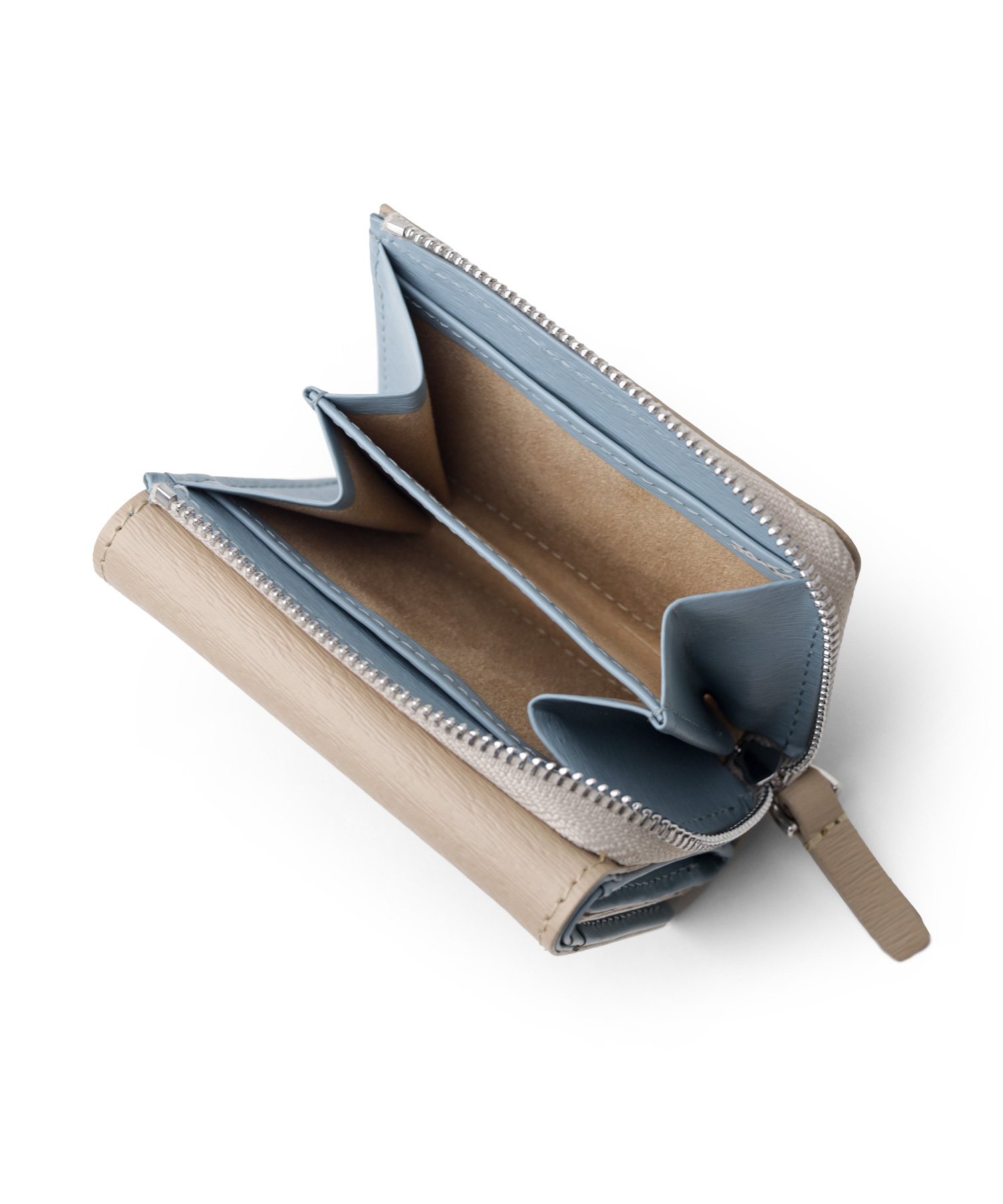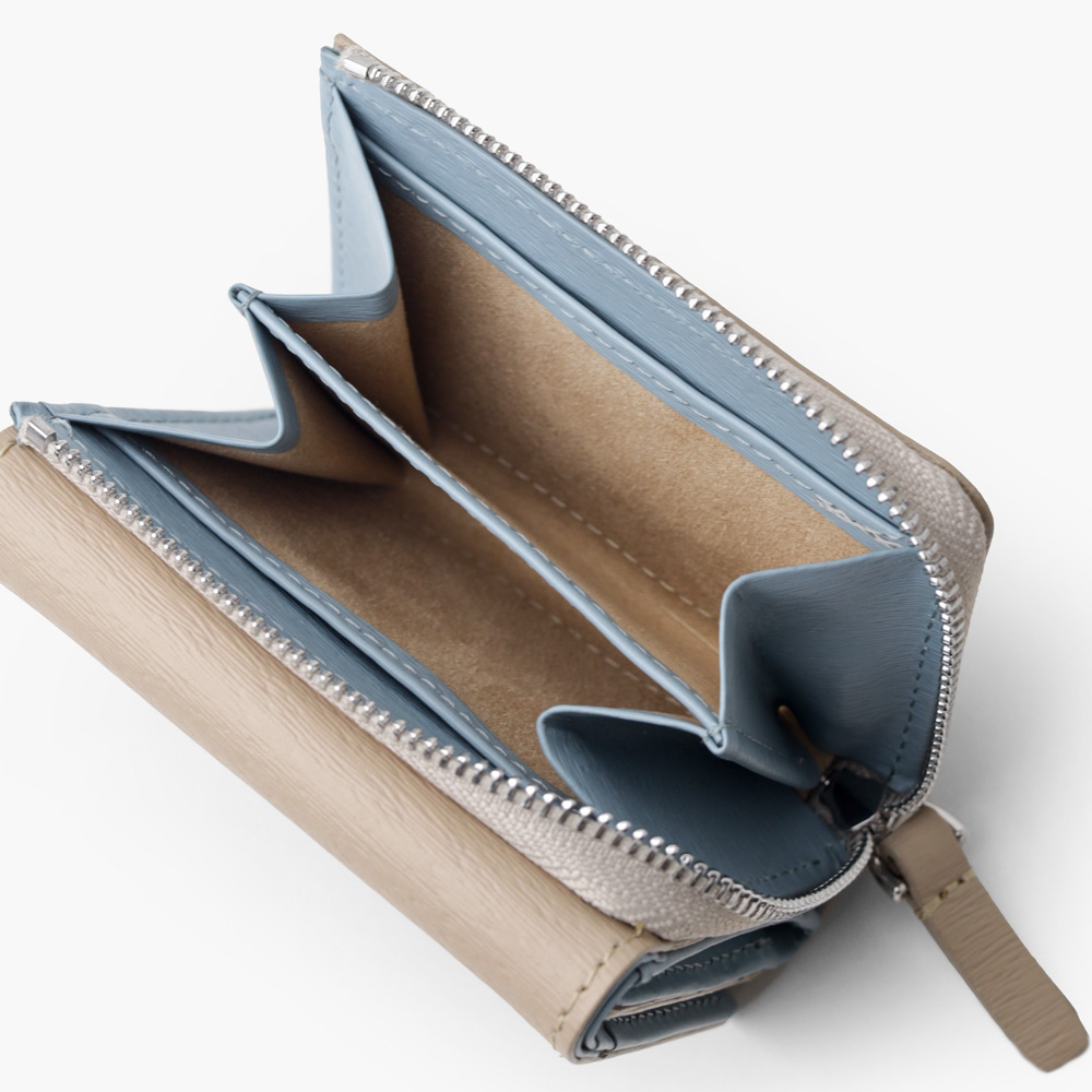 内装生地には高級感のある起毛生地を使用。ソフトなタッチ感と落ち着いた雰囲気で価値観を高めます。また内装生地の色は、クロ・ブルー・グリーンのお財布にはグレーカラーを。シロ・ベージュのお財布にはトープカラーを使用しております。