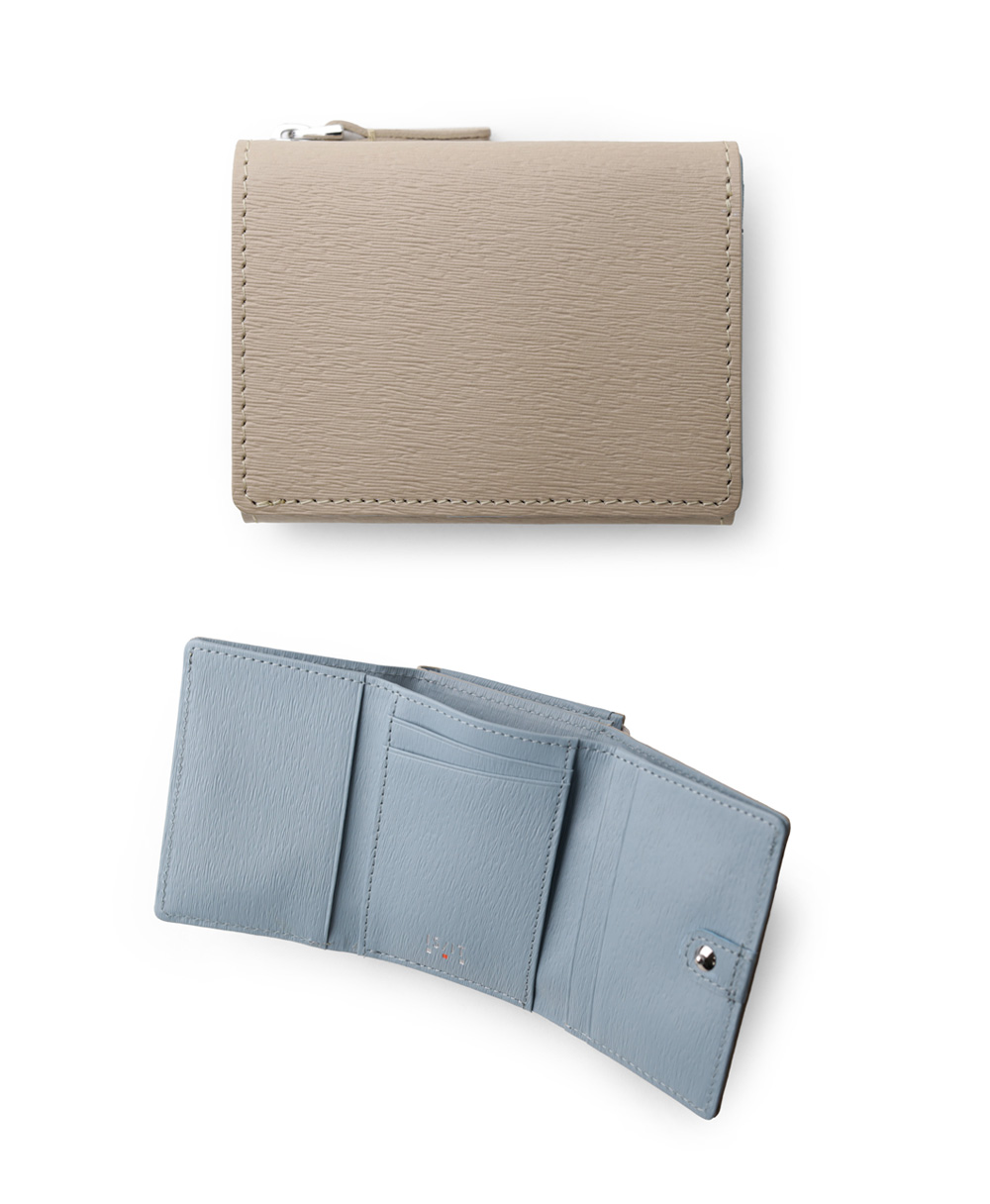 スモーキーなカラーコンビが魅力の三つ折り財布。エンボスレザーを贅沢に使用したこのホルダーは、その特徴的な質感が際立ちます。さらに、優れた耐久性を持ち、傷が目立ちにくいので、長く愛用いただけます。ジェンダーレスなデザインとカラーコンビは、男女を問わず幅広い方にお楽しみいただけます。