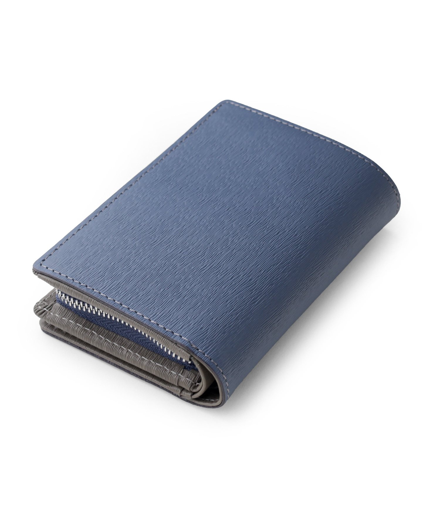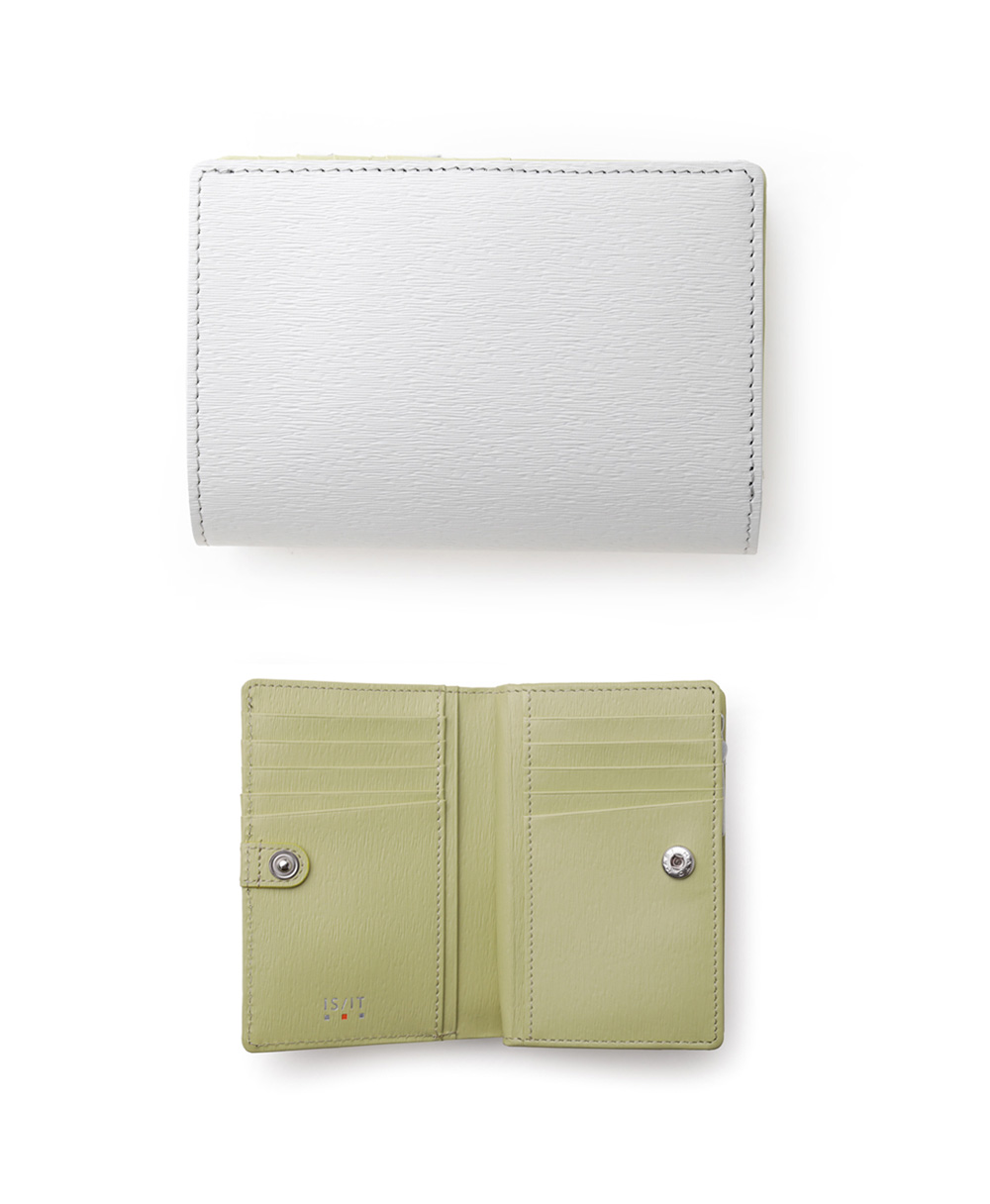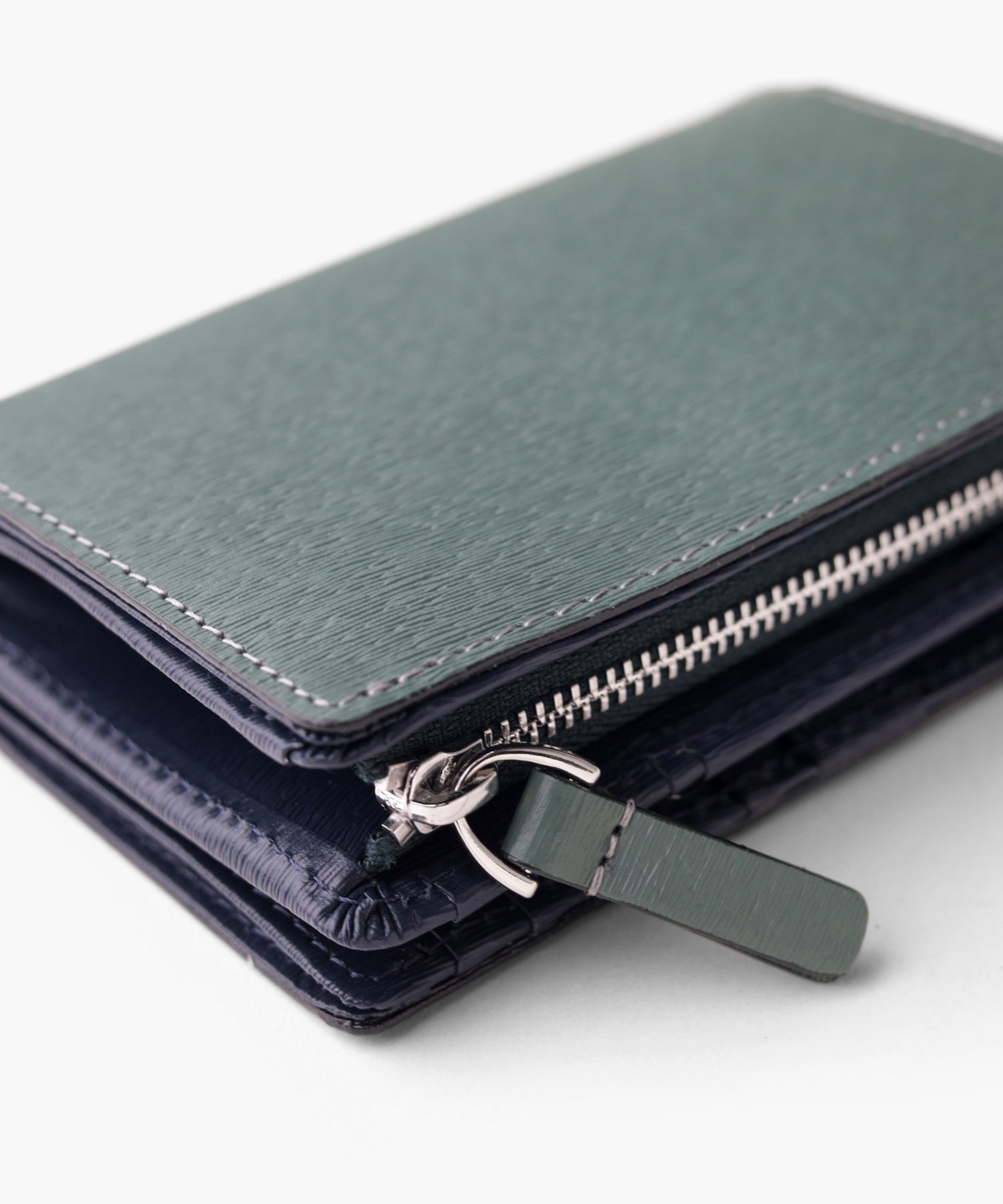 スモーキーなカラーコンビが魅力の二つ折り財布。エンボスレザーを贅沢に使用し、その特徴的な質感が際立ちます。さらに、優れた耐久性を持ち、傷が目立ちにくいので、長く愛用いただけます。ジェンダーレスなデザインとカラーコンビは、男女を問わず幅広い方にお楽しみいただけます。