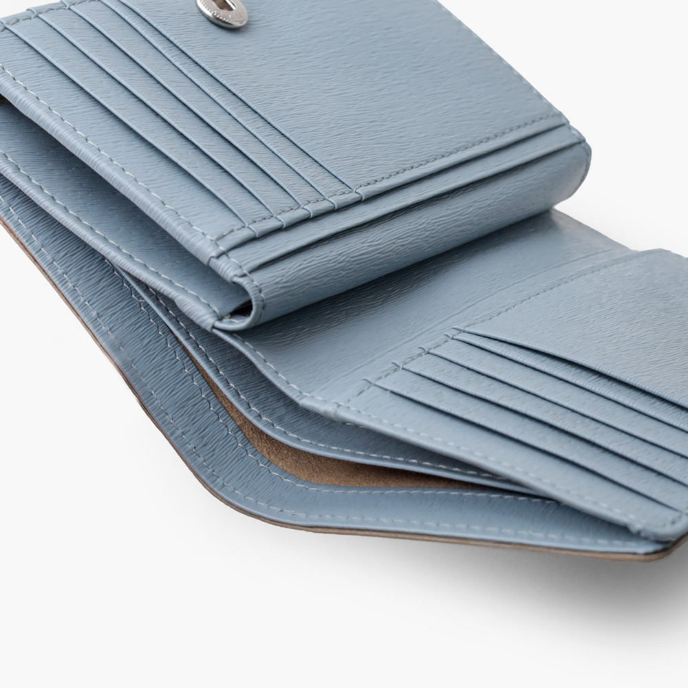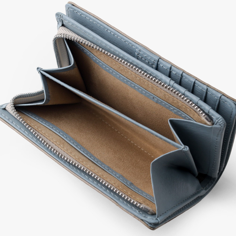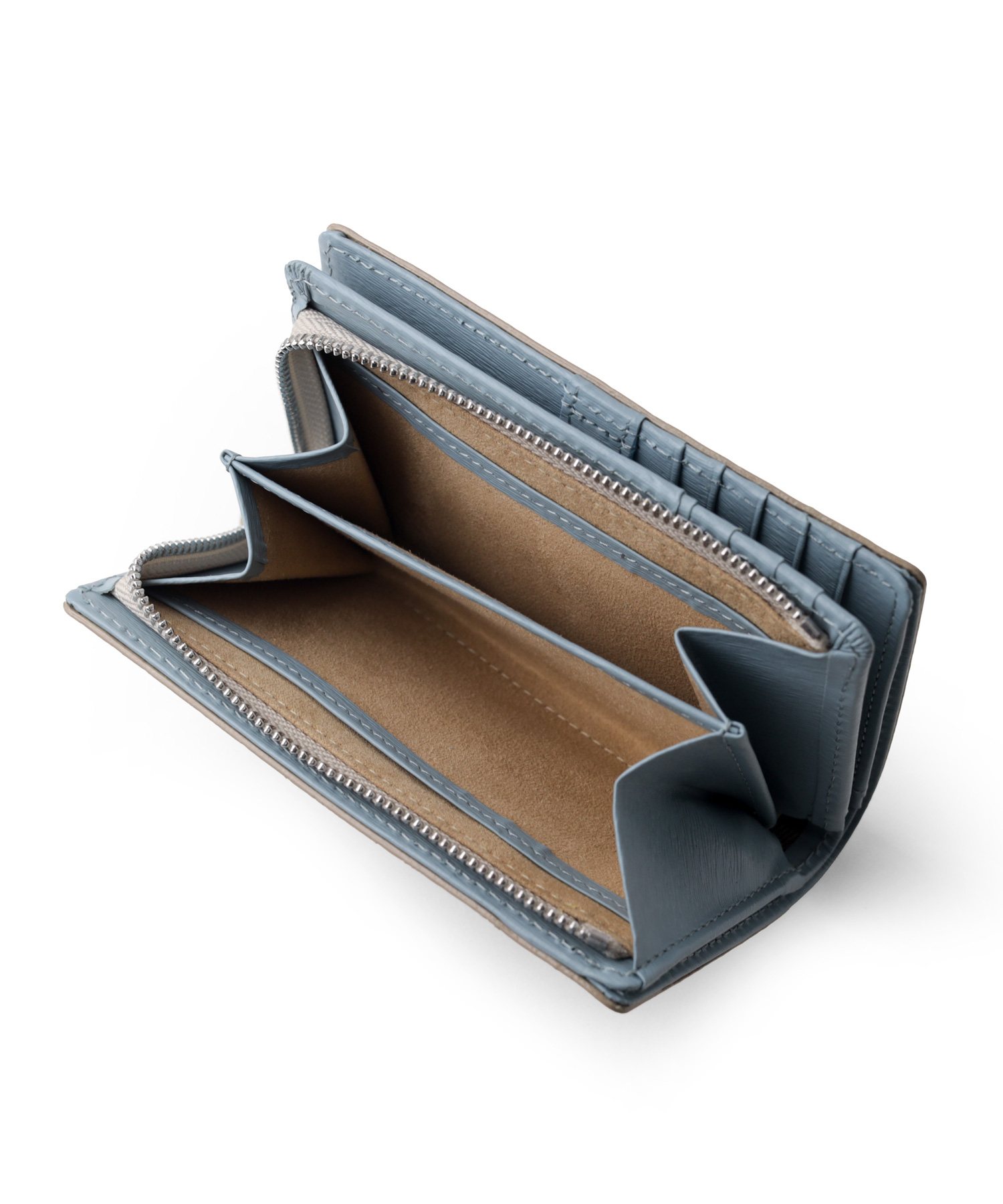 スモーキーなカラーコンビが魅力の二つ折り財布。エンボスレザーを贅沢に使用したこのホルダーは、その特徴的な質感が際立ちます。さらに、優れた耐久性を持ち、傷が目立ちにくいので、長く愛用いただけます。ジェンダーレスなデザインとカラーコンビは、男女を問わず幅広い方にお楽しみいただけます。
