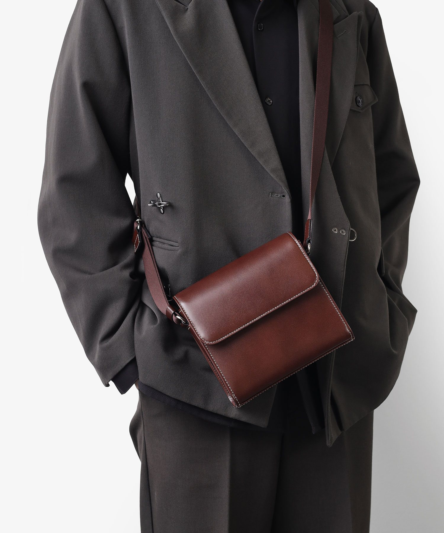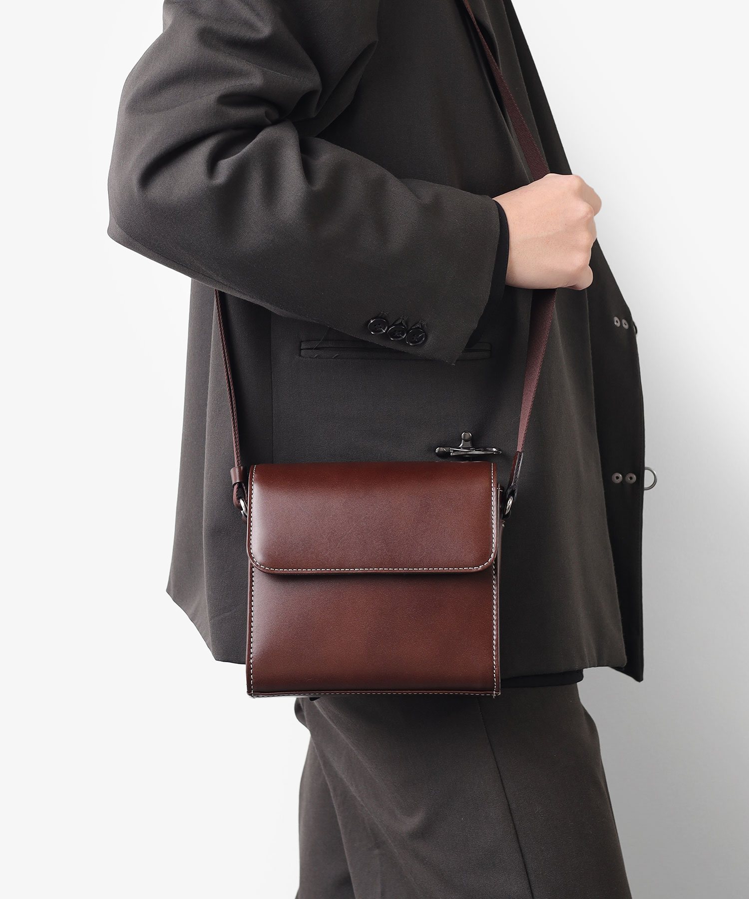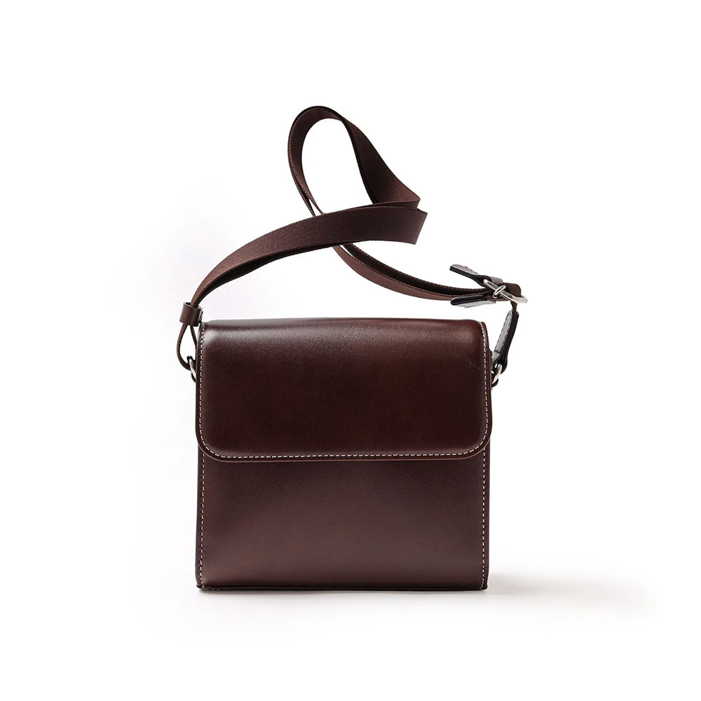 特殊なマチ構造により、すっきりとした見た目に仕立てています。コンパクトなサイズ感ながら、内装ポケットにはパスポートが収納可能です。