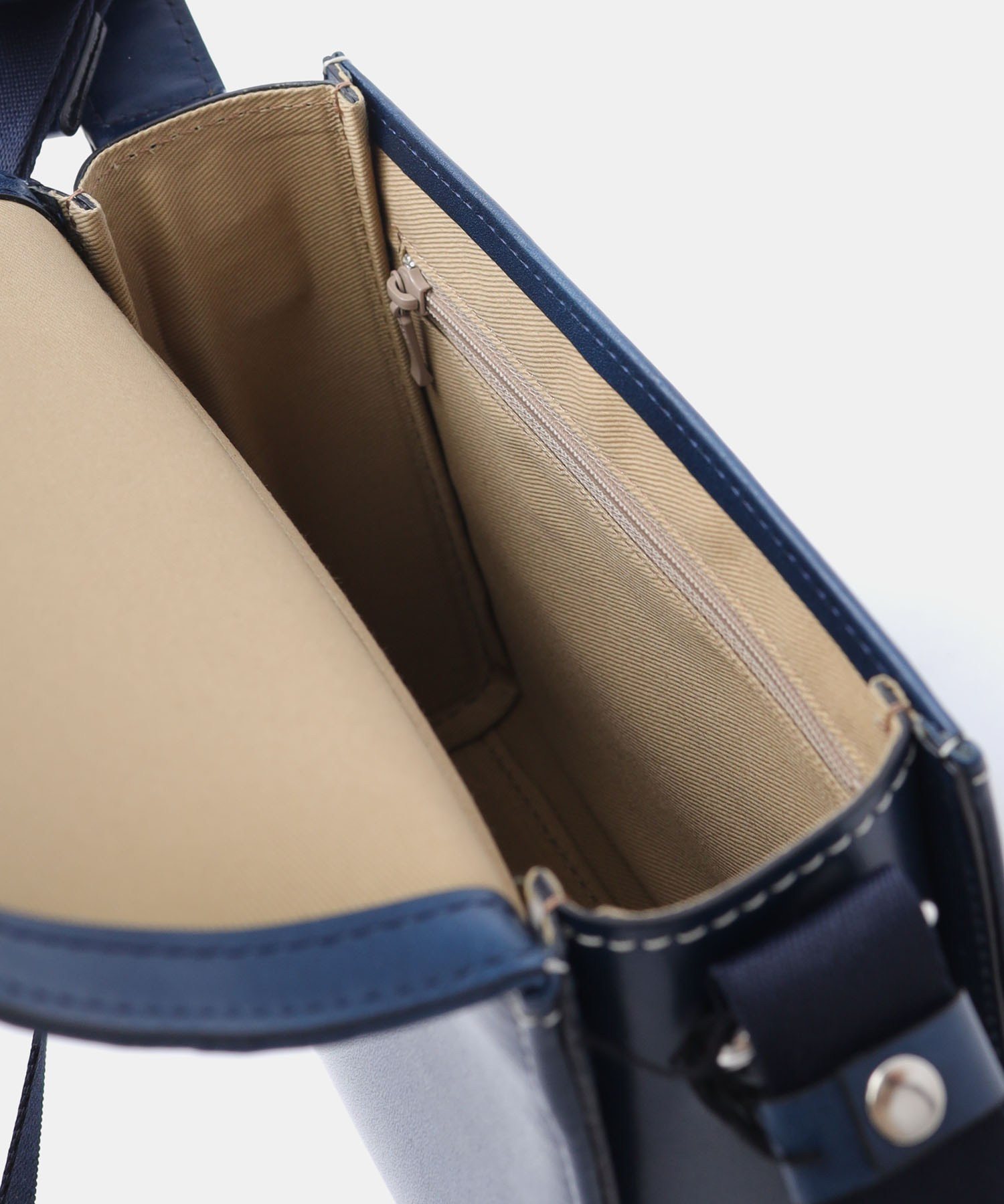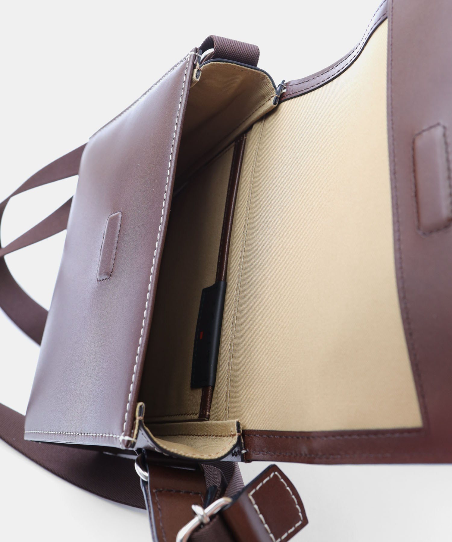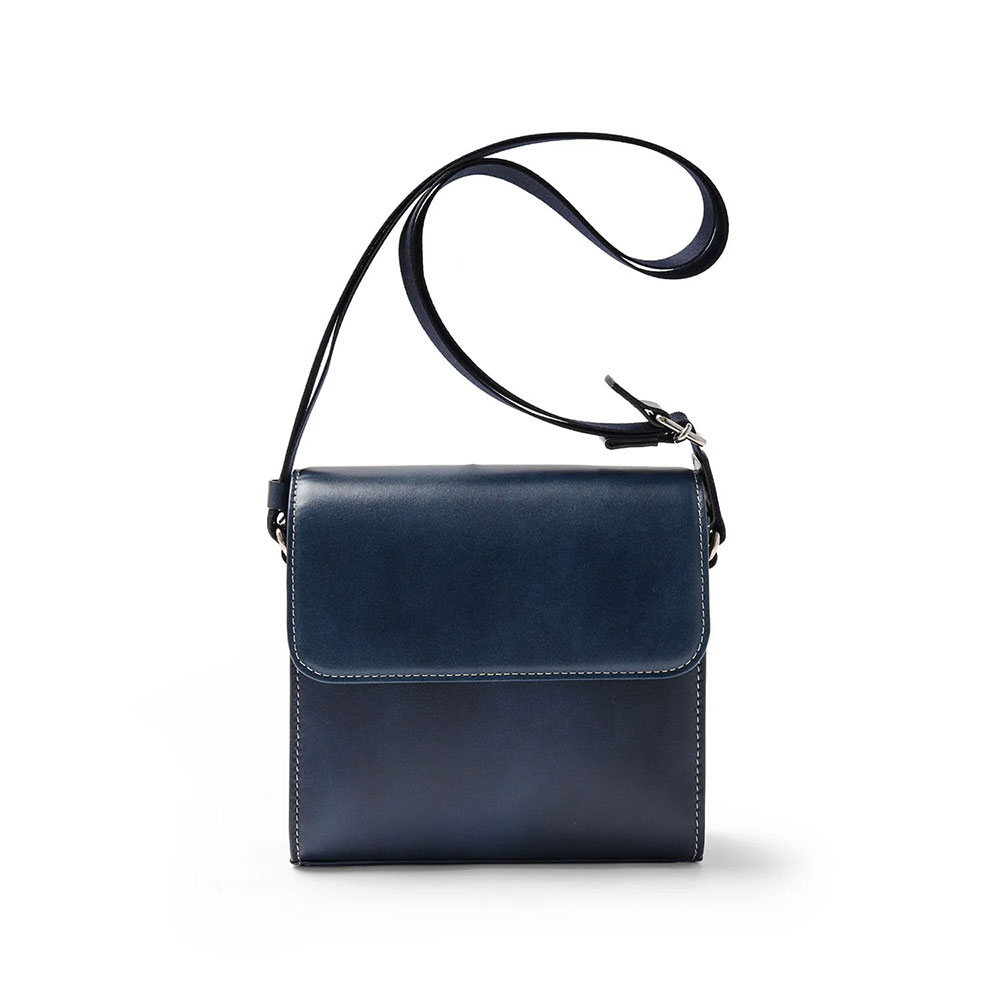 特殊なマチ構造により、すっきりとした見た目に仕立てています。コンパクトなサイズ感ながら、内装ポケットにはパスポートが収納可能です。