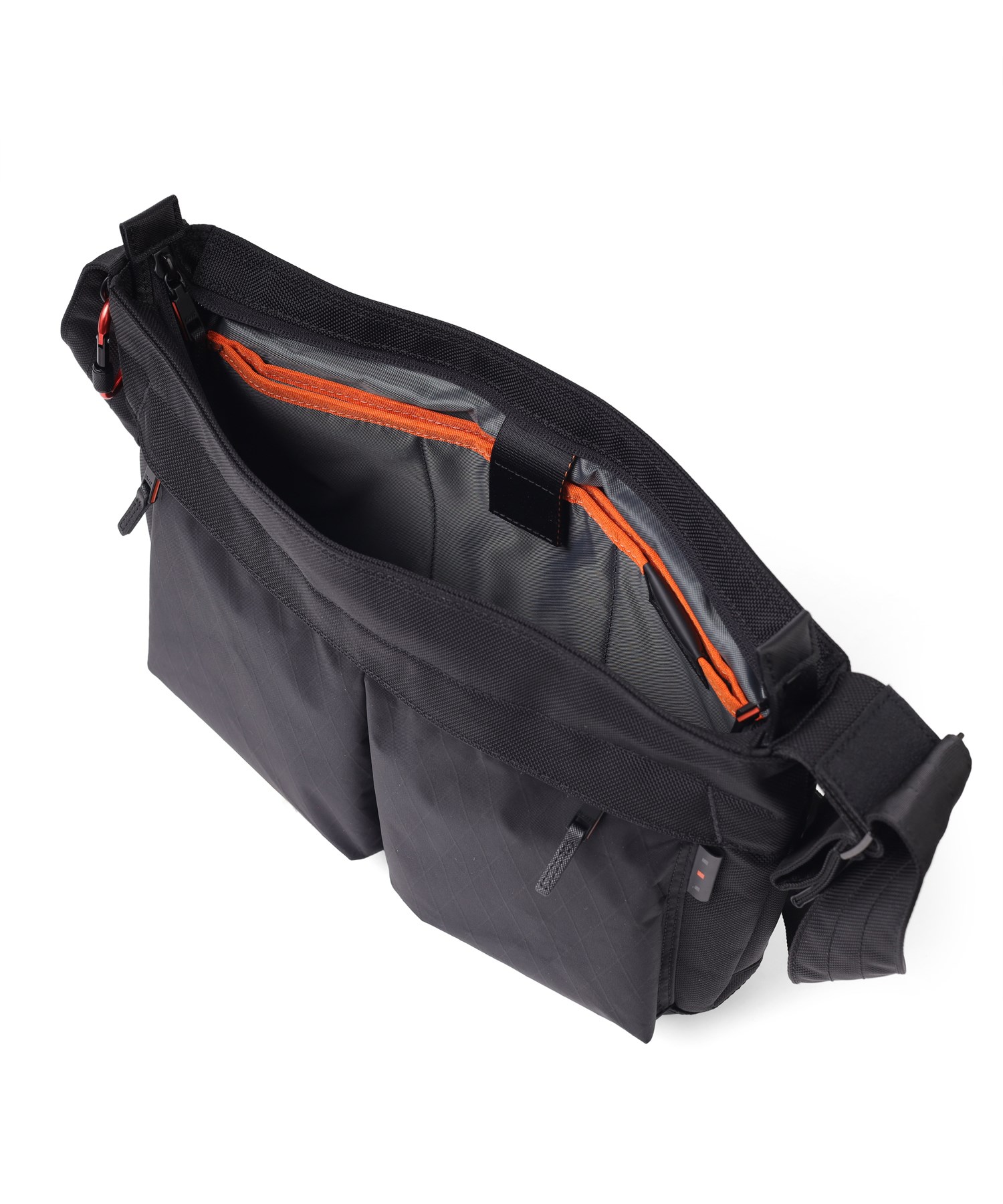 電子機器の収納に便利なクッションポケットや、小物の整理に最適なポケット類が充実している機能性に優れたショルダーバッグです。