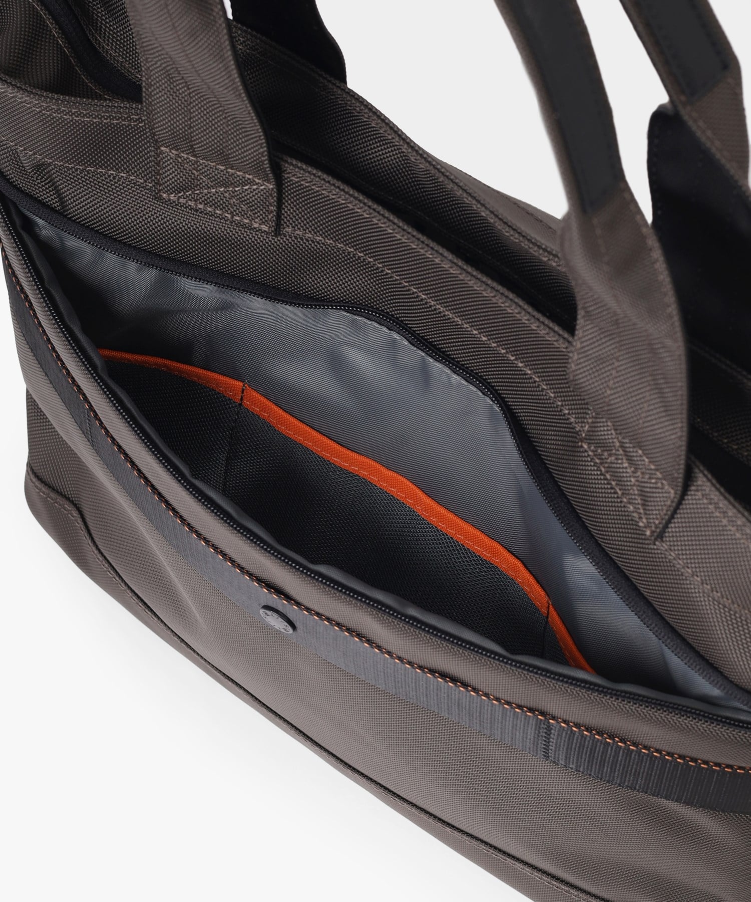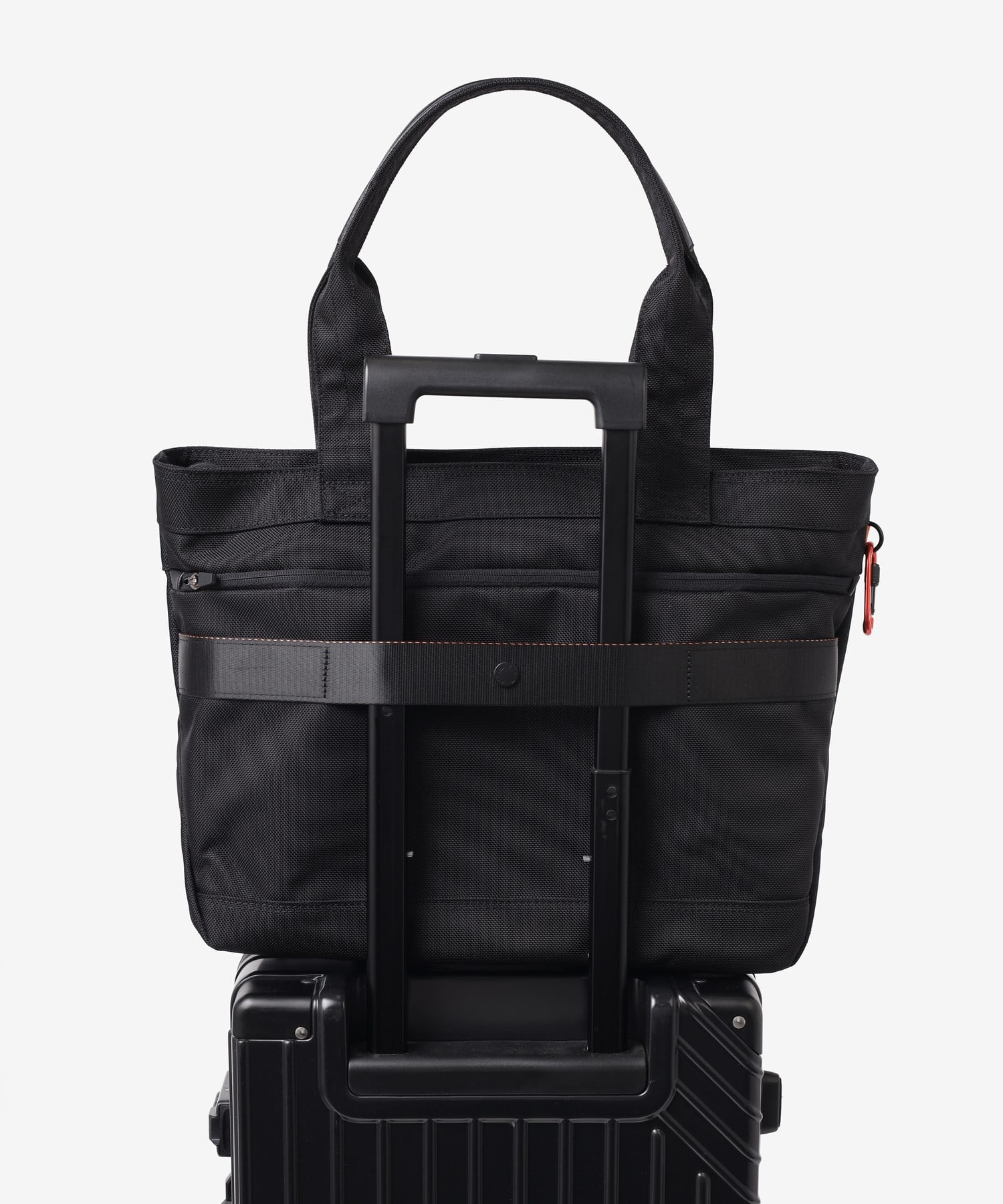 13.3インチPC対応のクッションポケットや、小物の整理に最適なポケット類が充実しています。さらには、キャリーケースに通すセットアップベルトが備わっているので、出張にも最適なトートバッグです。
