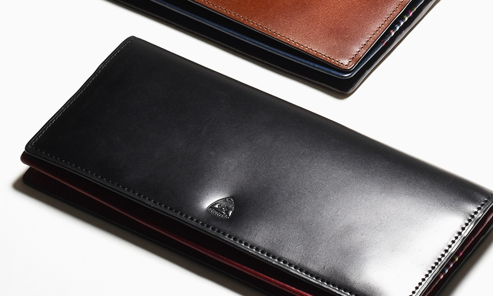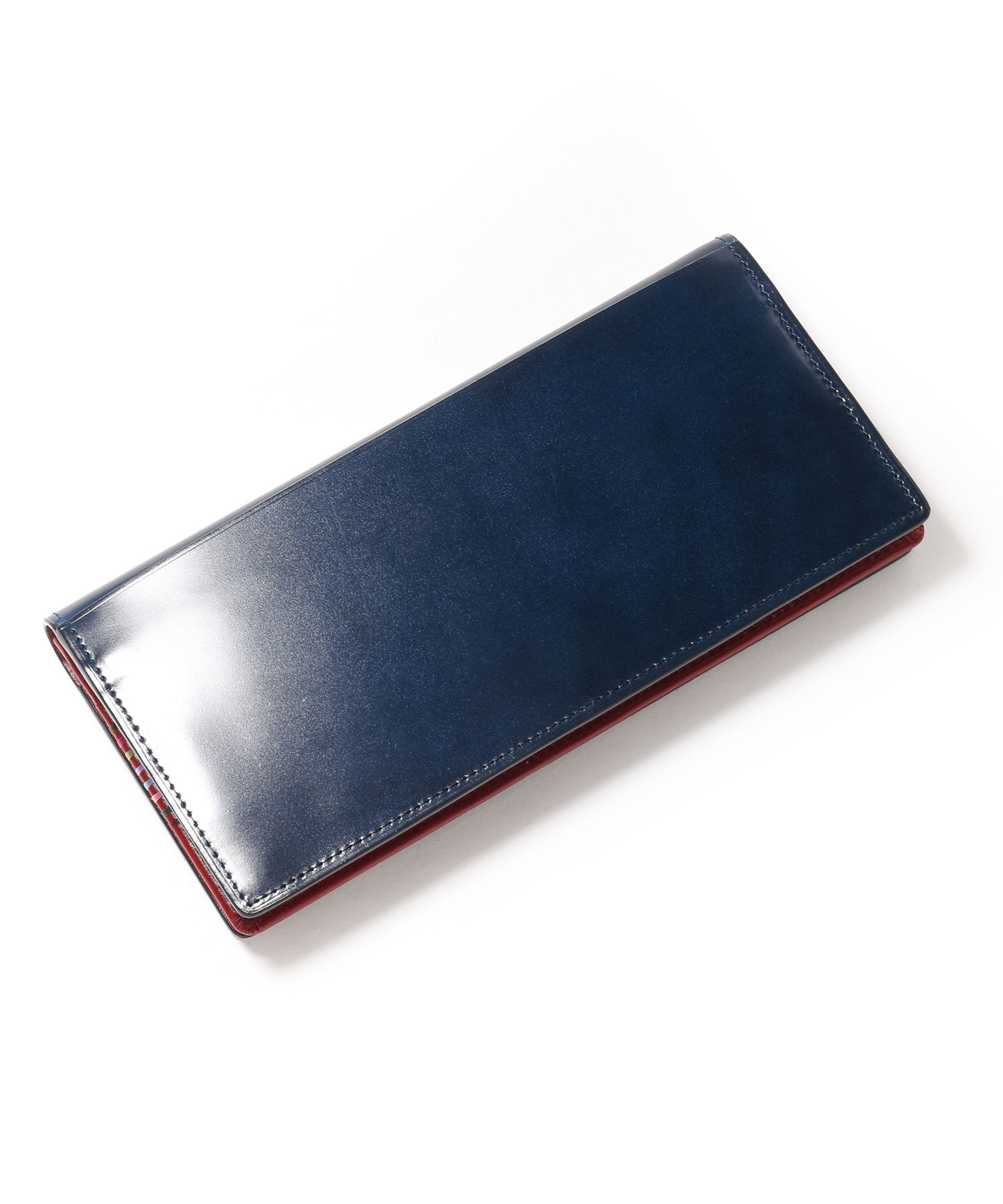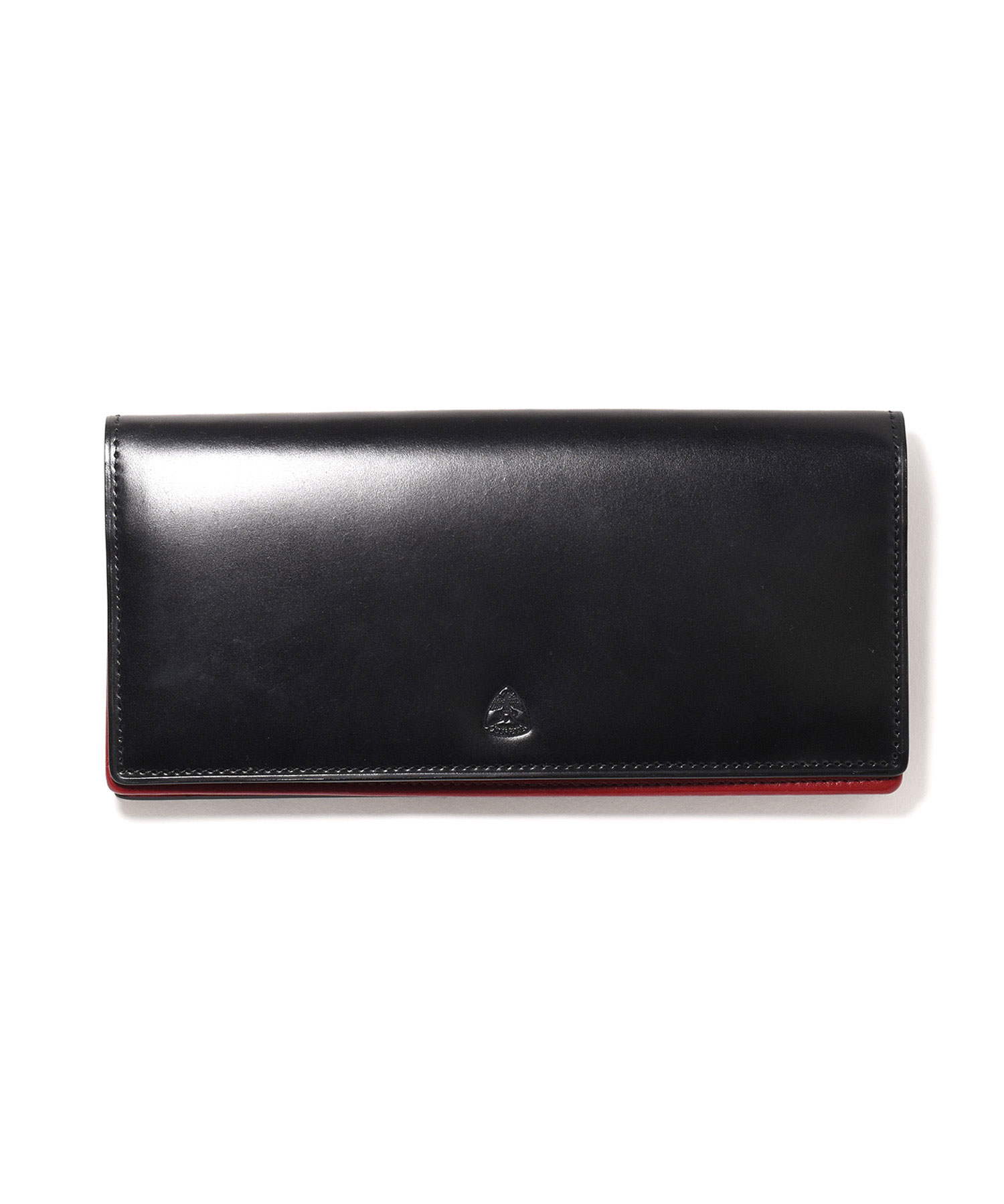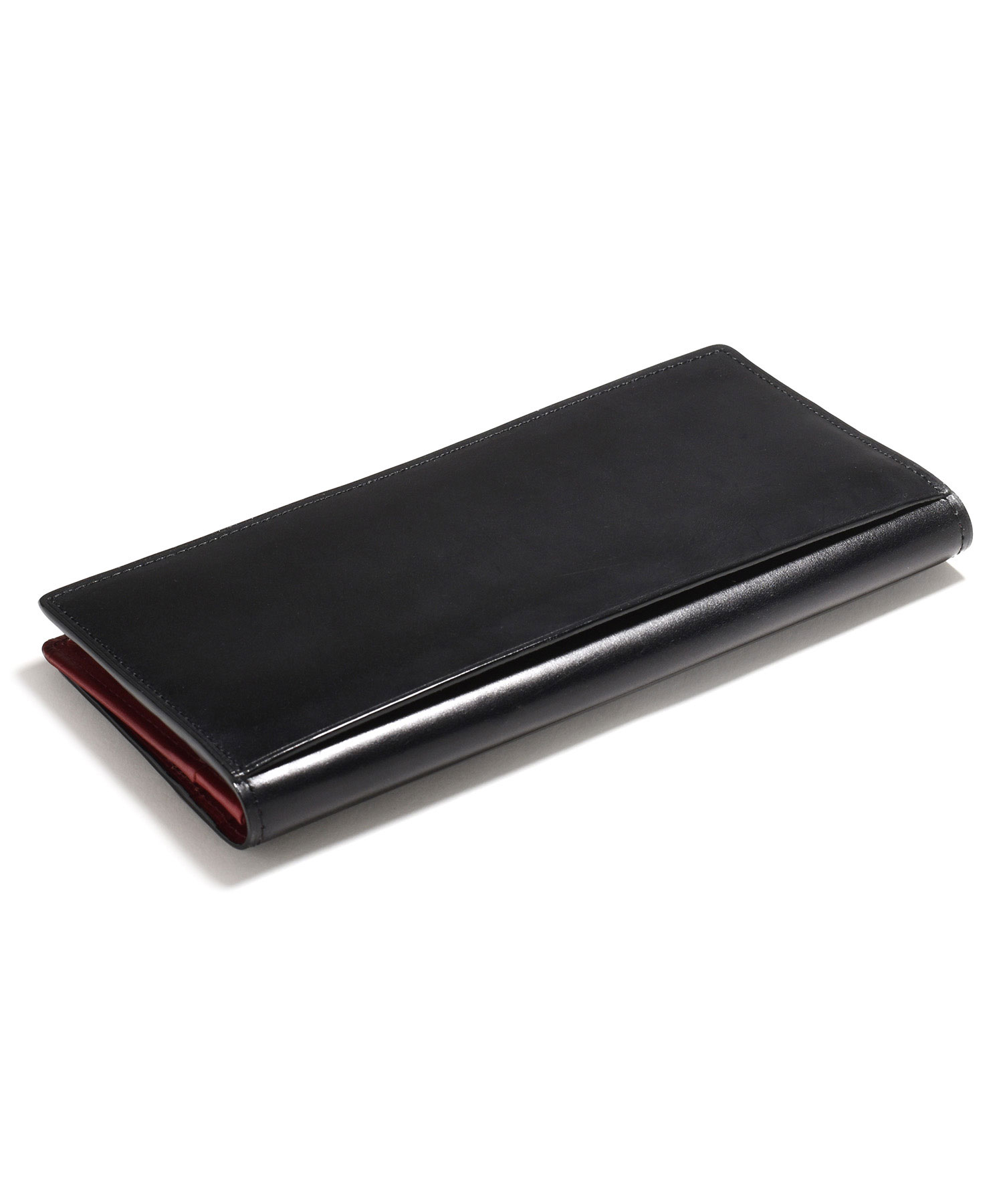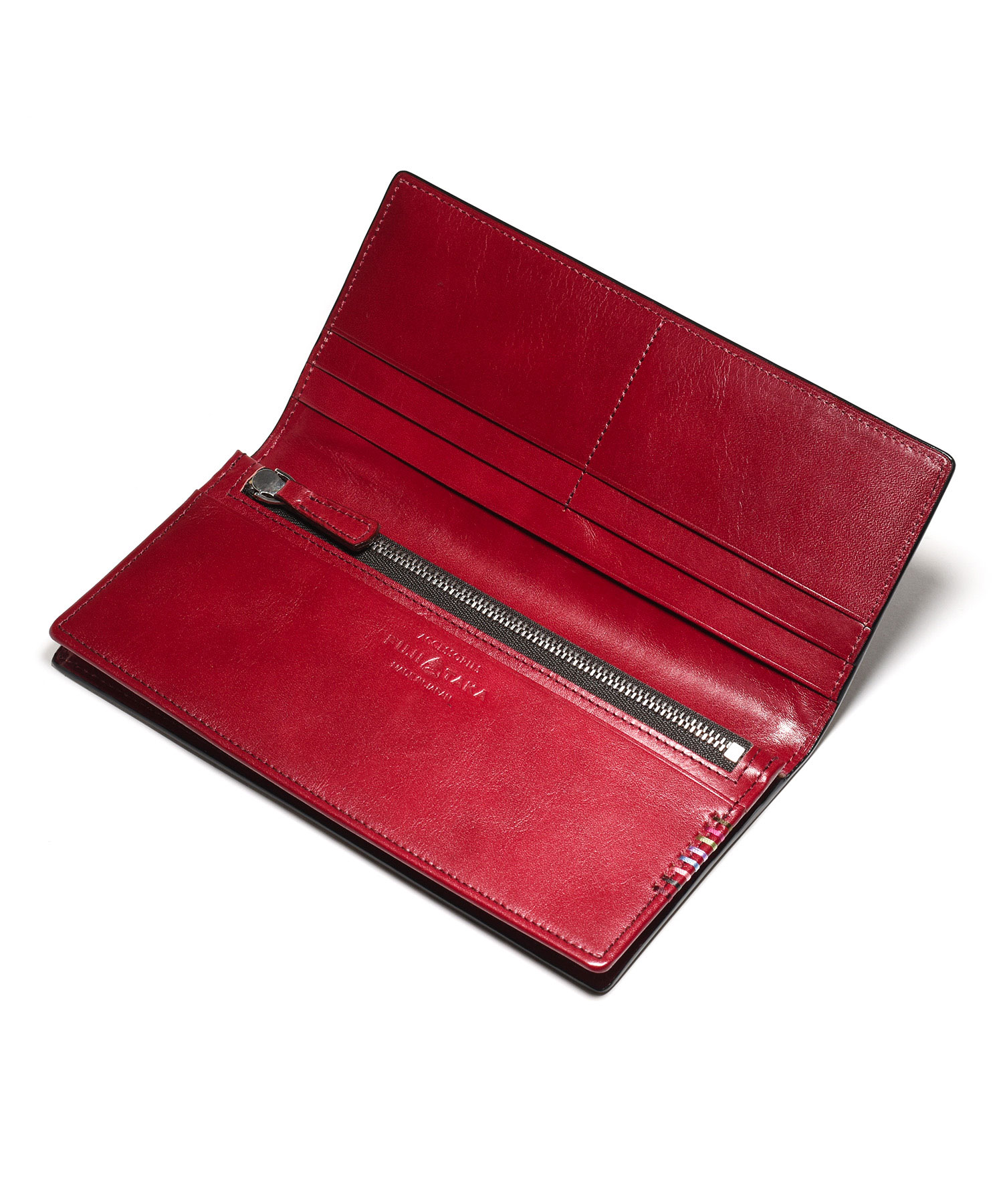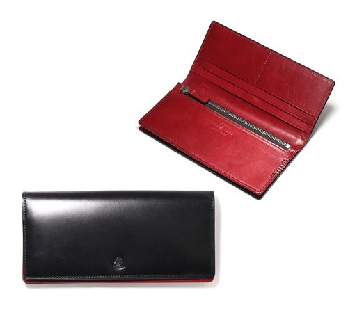希少なオイルコードバンを主素材とし、内革に発色の良いアニリンレザーを使用したフジタカのフォール小物シリーズの通しマチ仕様の長財布。分厚くなりがちな通しマチの仕様ですが、ファスナーの取り付け位置や、特殊な薄型のファスナースライダーを採用することで、薄い形状に仕上げています。