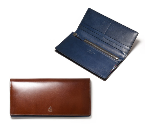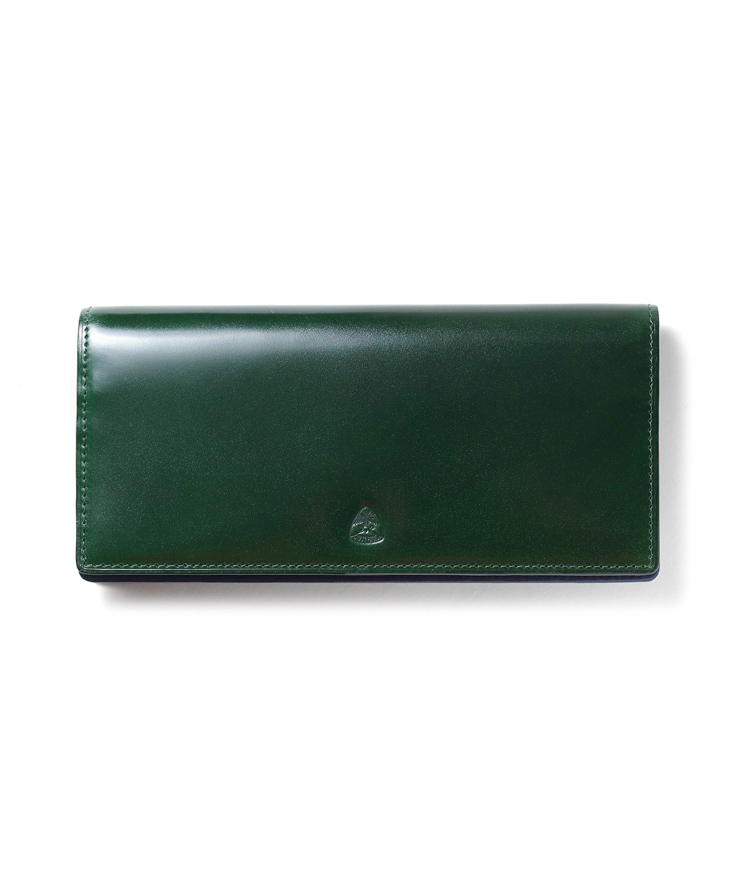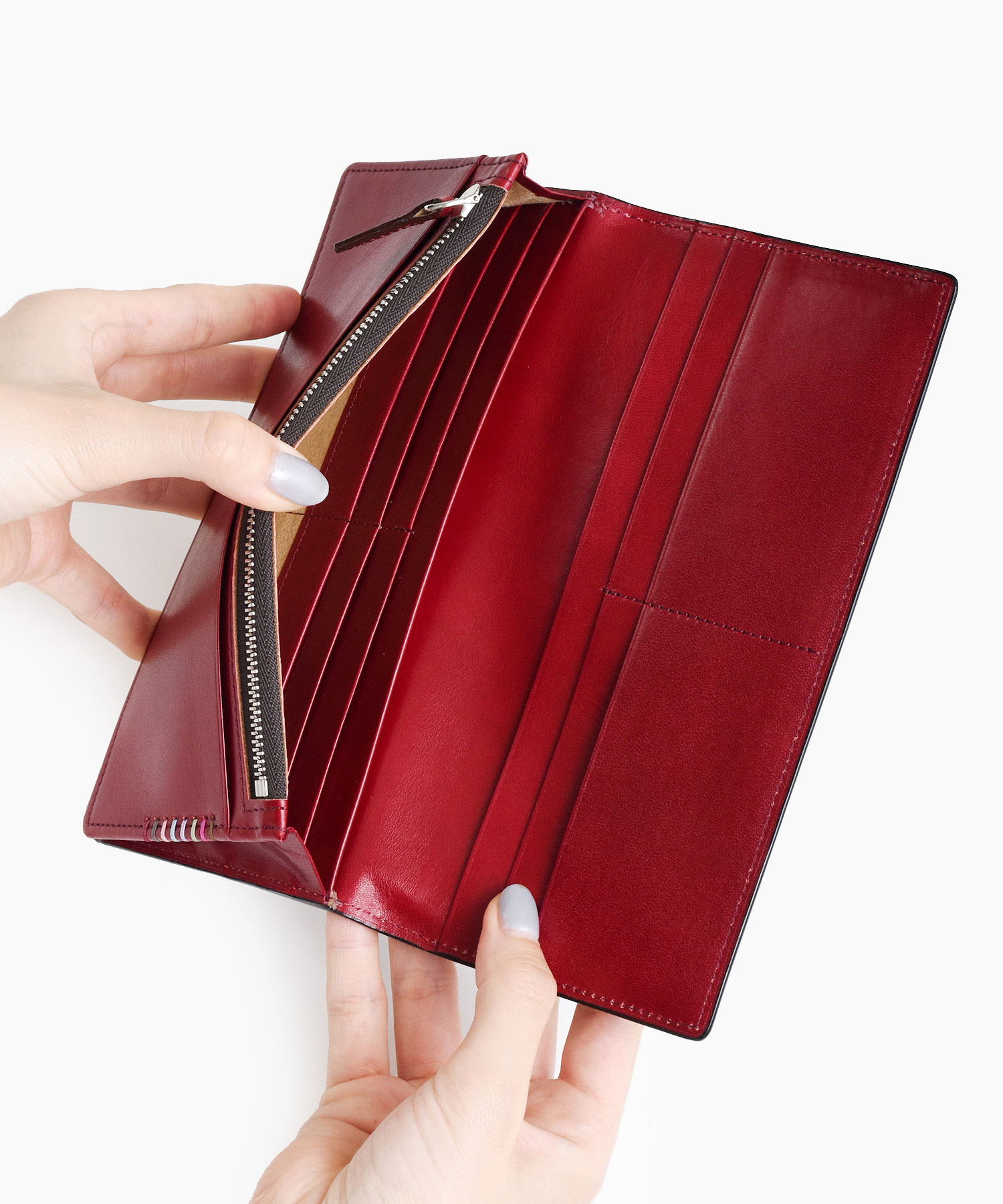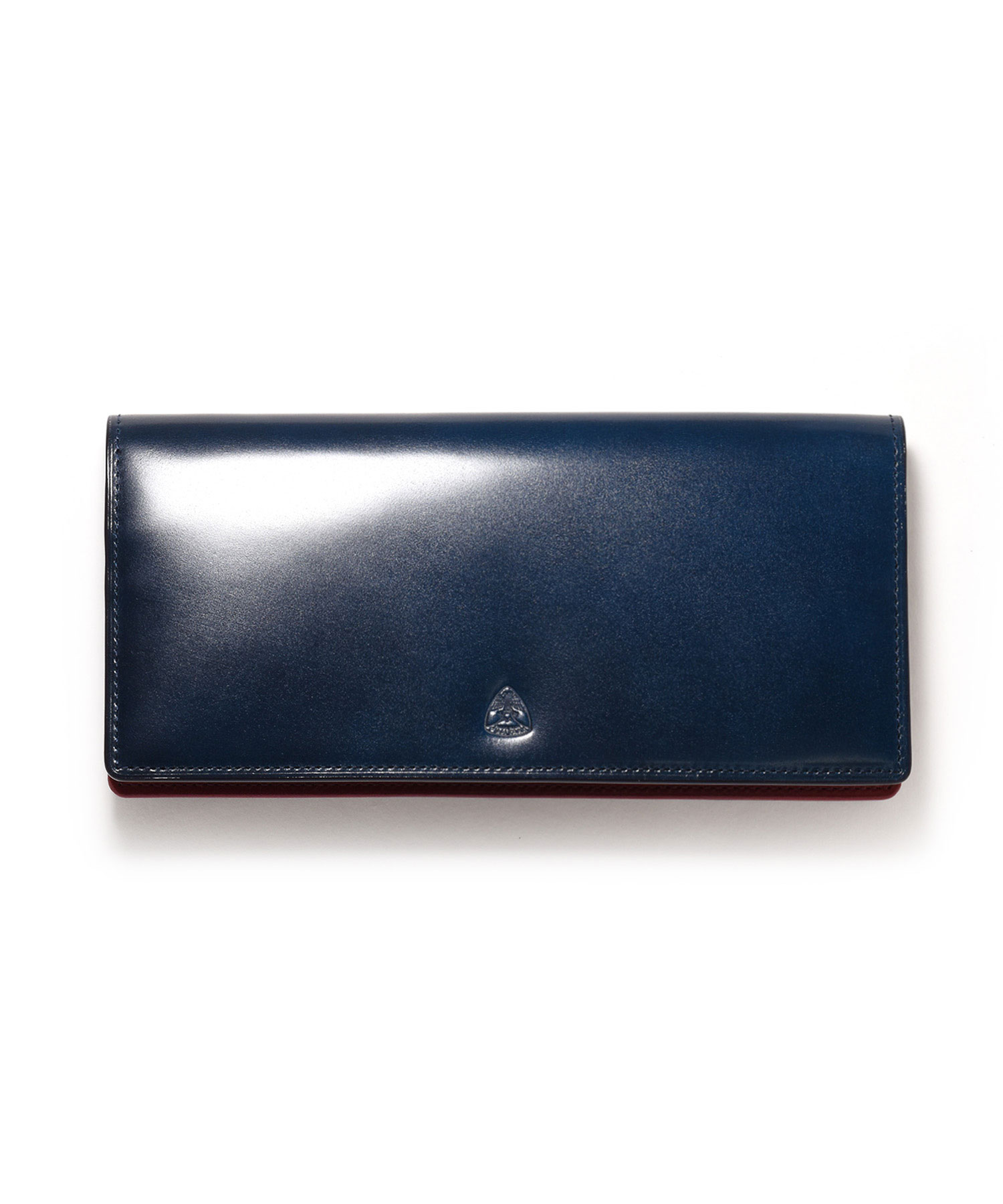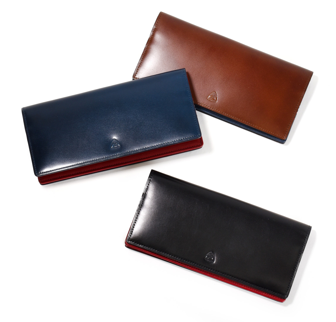 希少なオイルコードバンを主素材とし、内革に発色の良いアニリンレザーを使用したフジタカのフォール小物シリーズの通しマチ仕様の長財布。分厚くなりがちな通しマチの仕様ですが、ファスナーの取り付け位置や、特殊な薄型のファスナースライダーを採用することで、薄い形状に仕上げています。