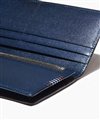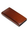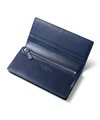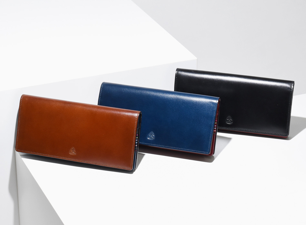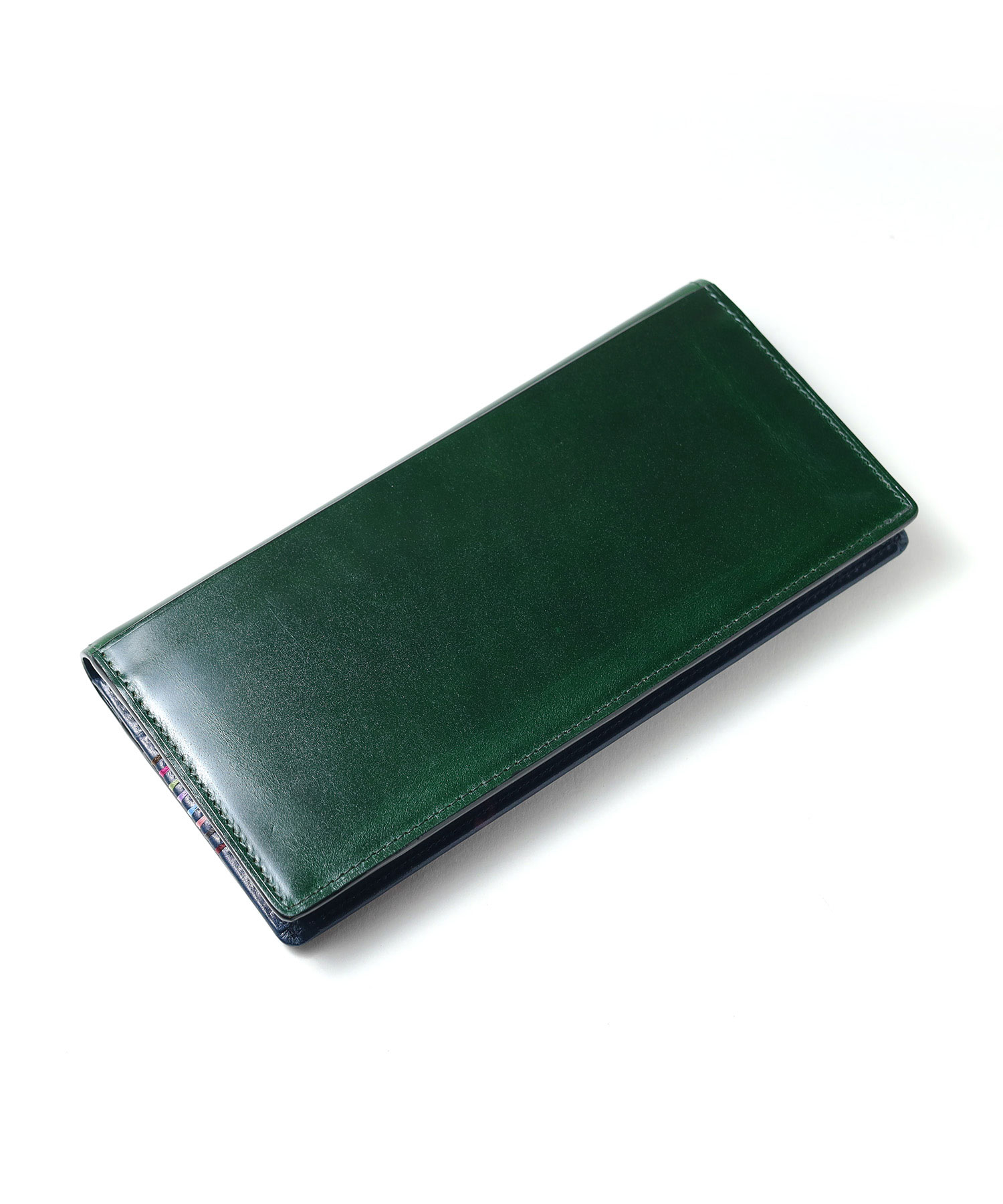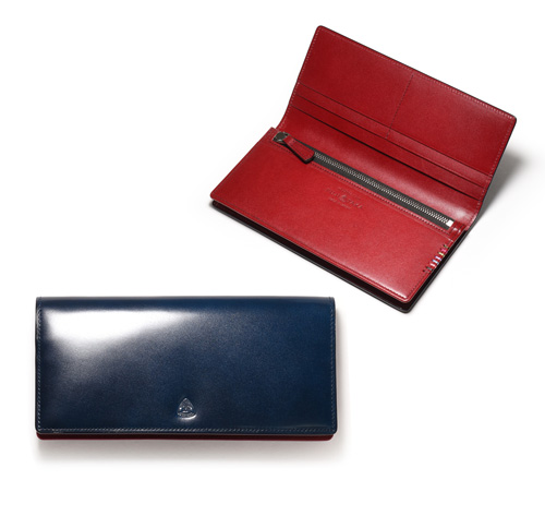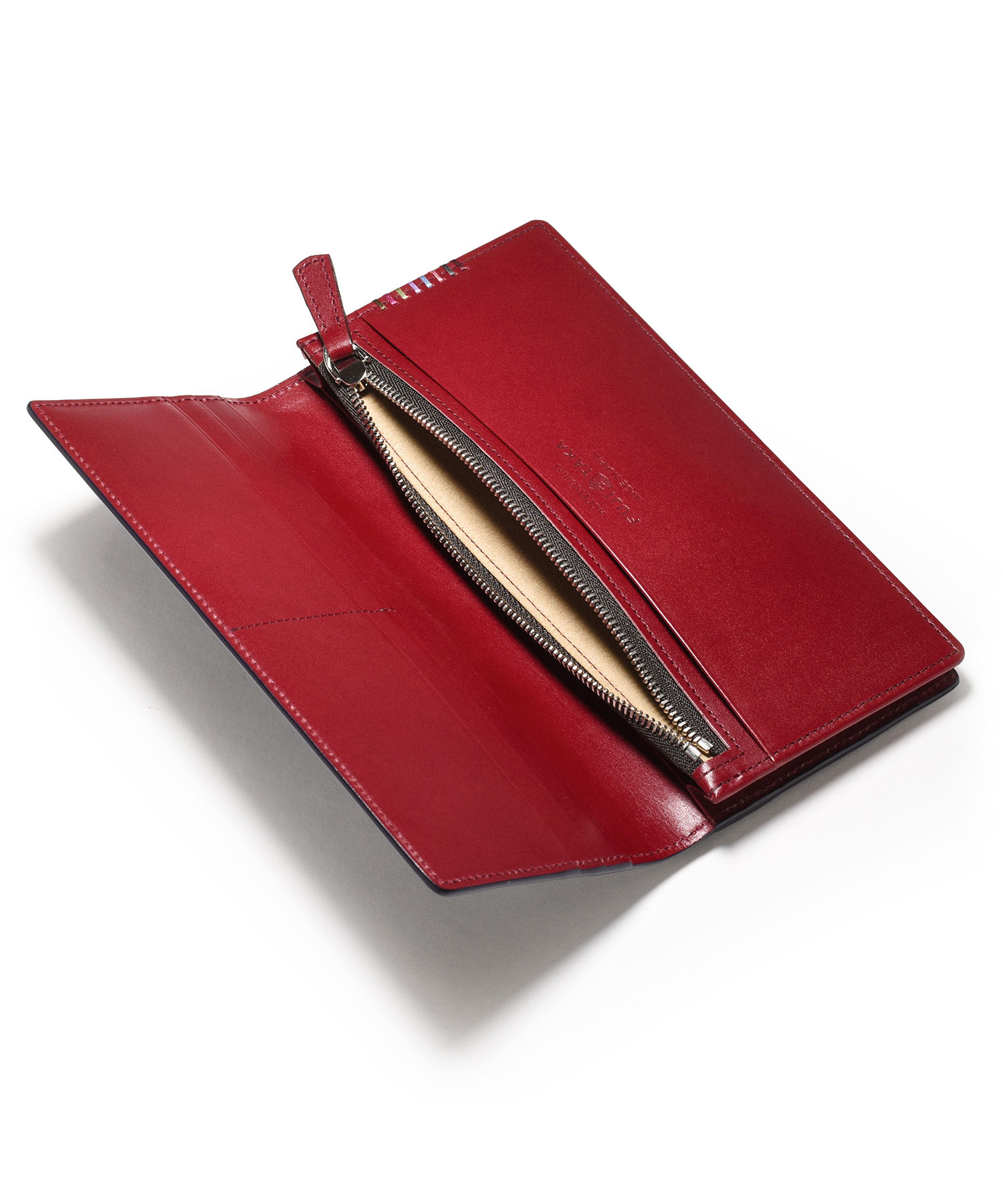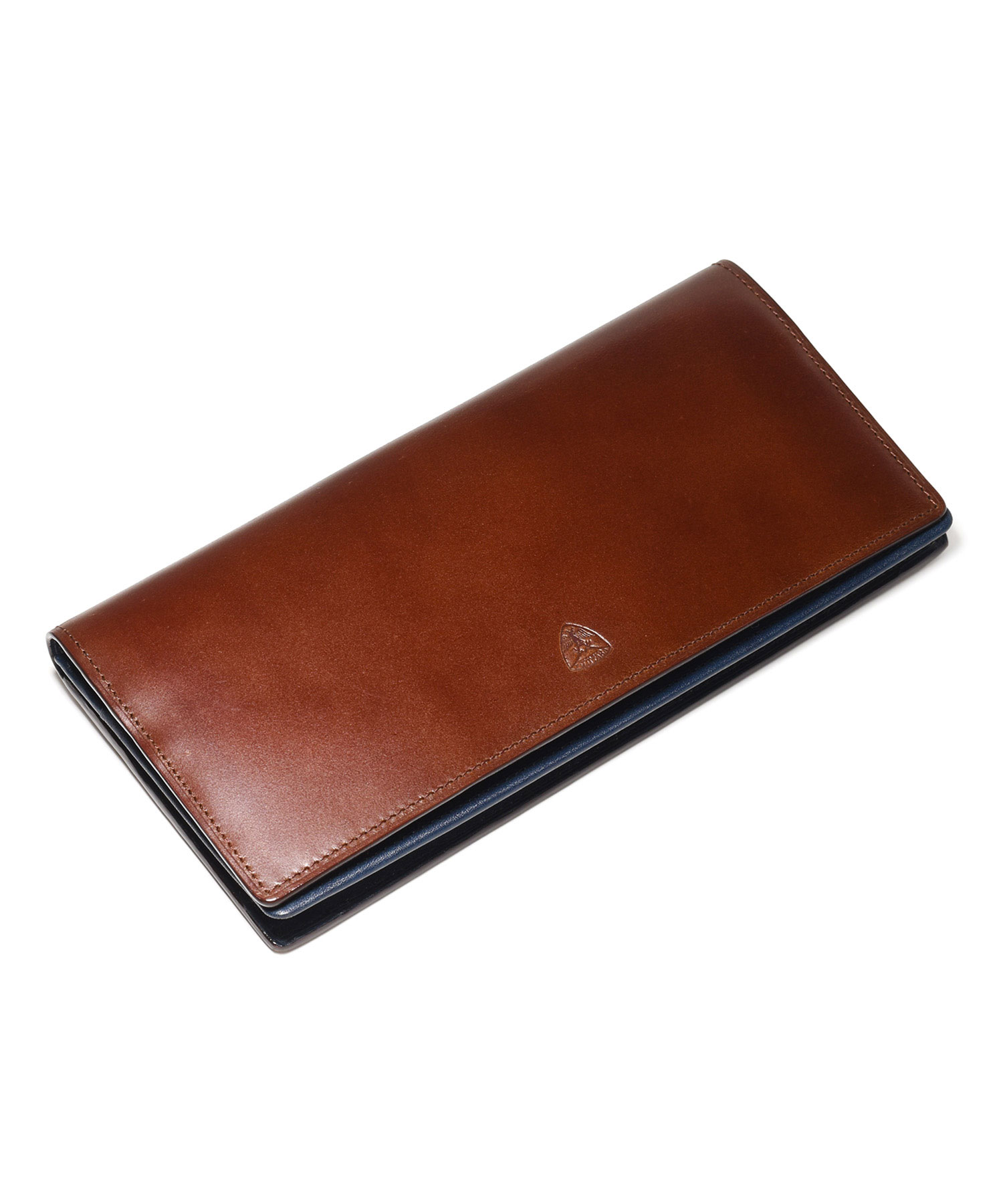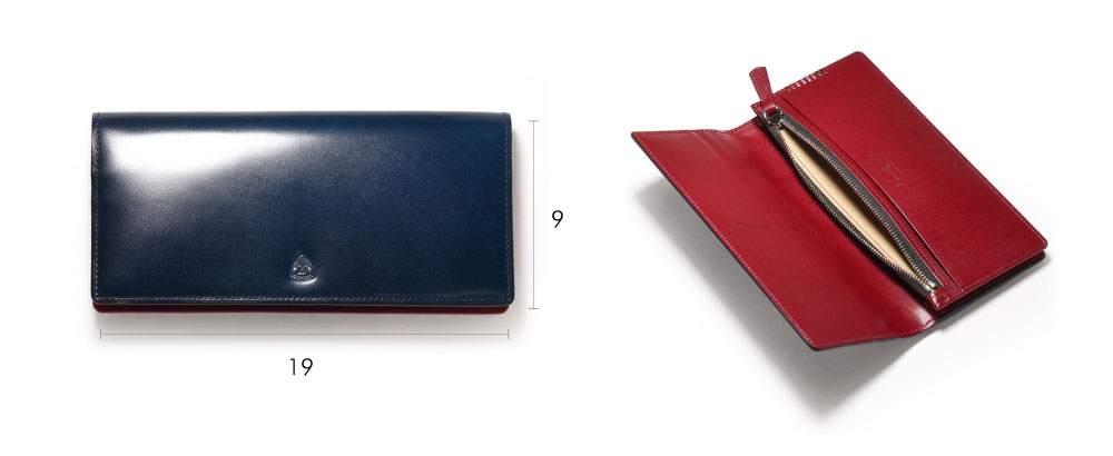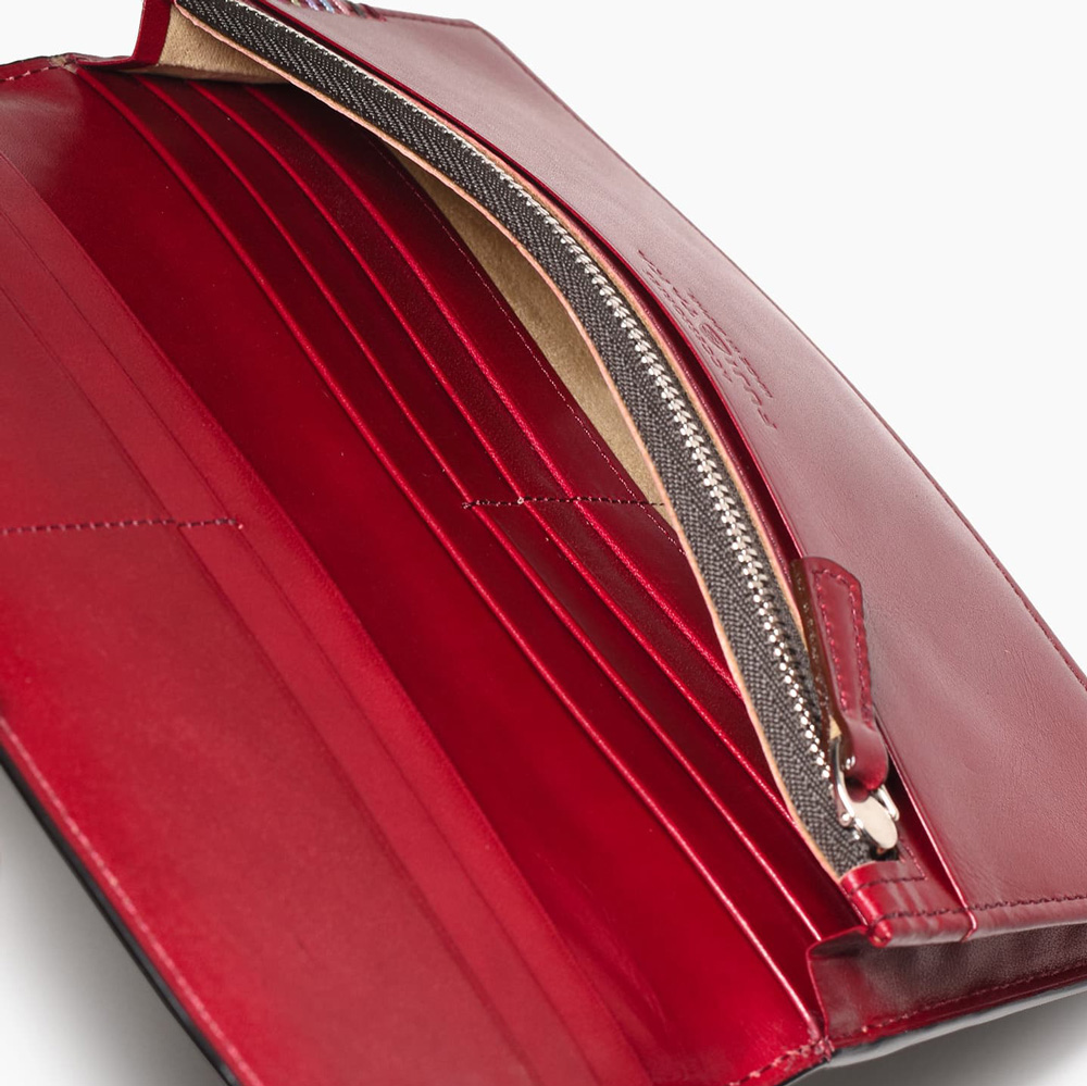 希少なオイルコードバンを主素材とし、内革に発色の良いアニリンレザーを使用したフジタカのフォール小物シリーズの通しマチ仕様の長財布。分厚くなりがちな通しマチの仕様ですが、ファスナーの取り付け位置や、特殊な薄型のファスナースライダーを採用することで、薄い形状に仕上げています。