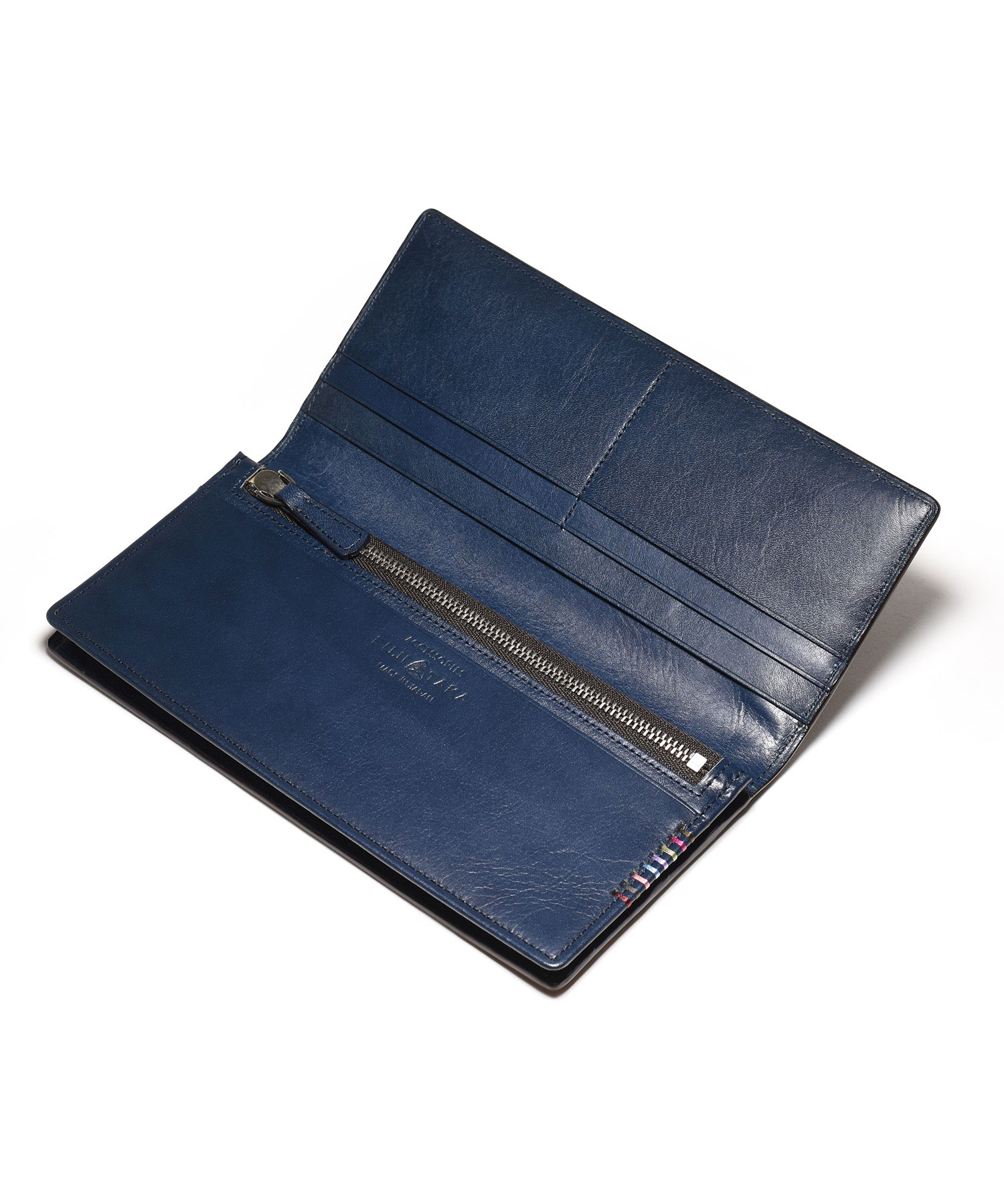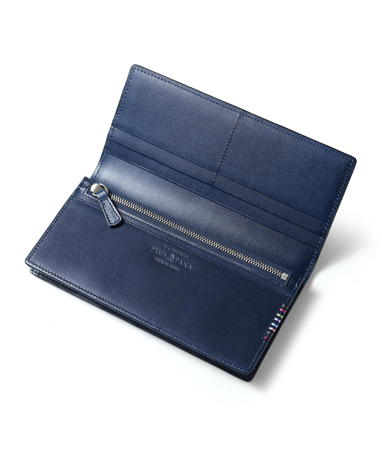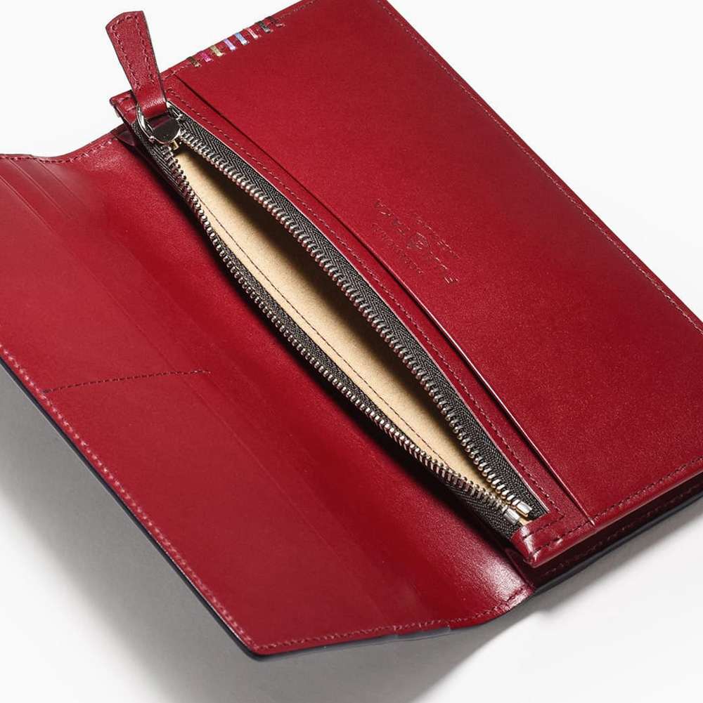 希少なオイルコードバンを主素材とし、内革に発色の良いアニリンレザーを使用したフジタカの『フォール 通しマチ仕様長財布』。内革の色がそれぞれ異なるバイカラー。分厚くなりがちな通しマチの仕様ですが、ファスナーの取り付け位置や、特殊な薄型のファスナースラーだーを採用することで、薄い形状に仕上げています。