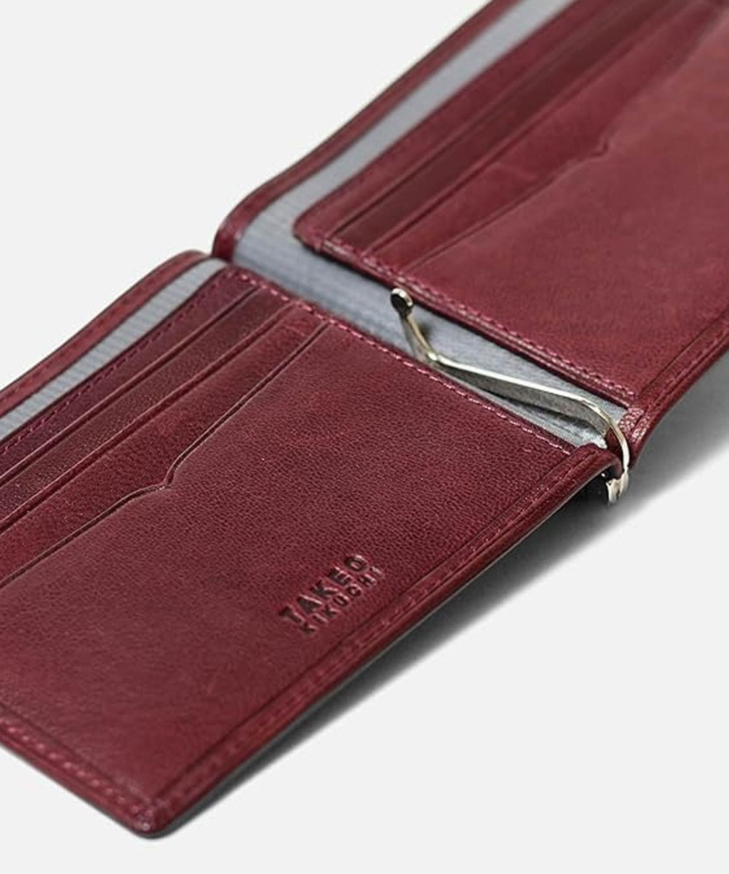 タケオキクチのもっちりとした手触りの札ばさみ。紙幣だけでなく、カードが6枚収納可能。「小銭は持ち歩かない」「小銭入れは別で持ち歩く」という方にピッタリの純札二つ折り財布です。薄マチでスーツの内ポケットにもスリムに収まります。