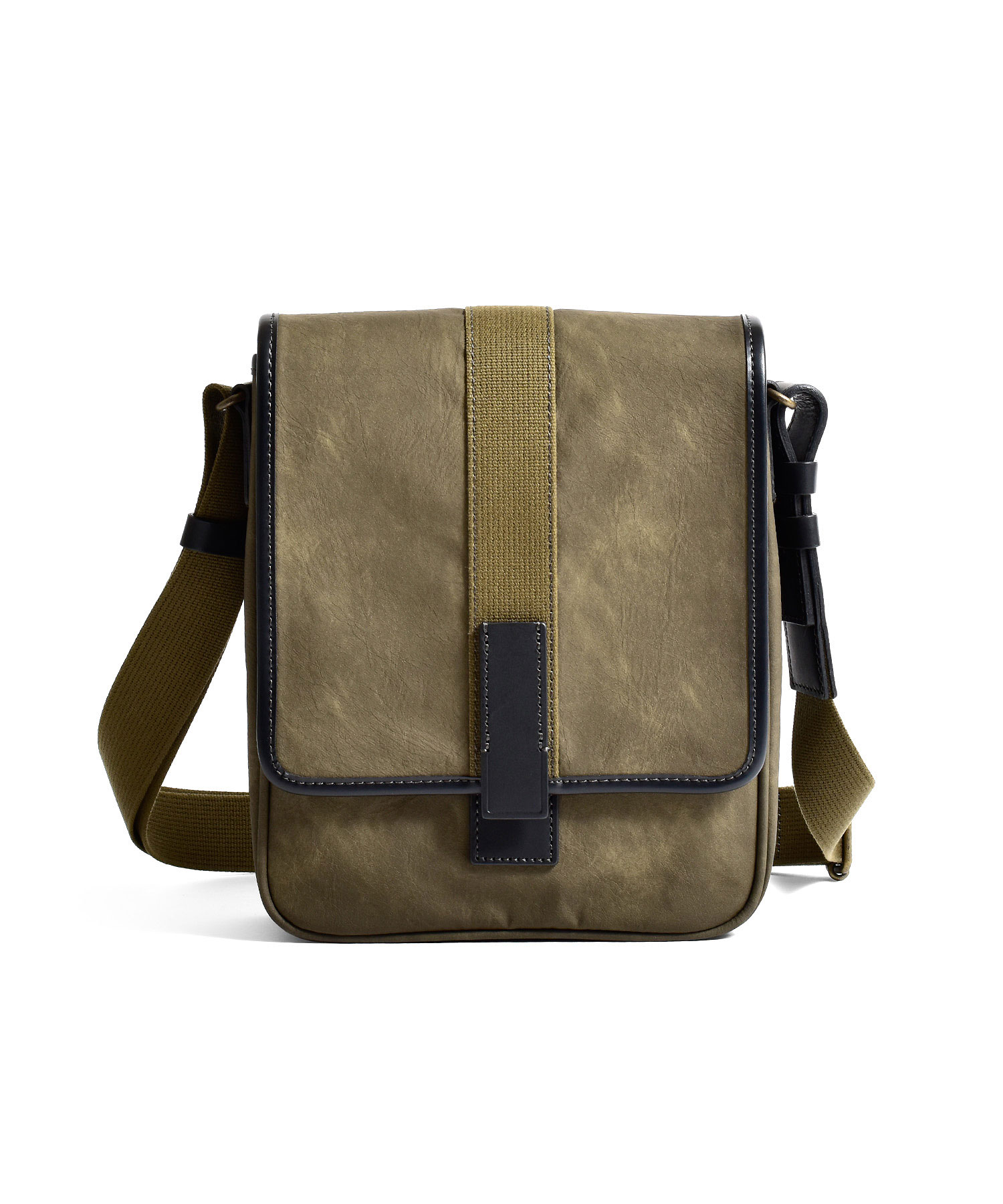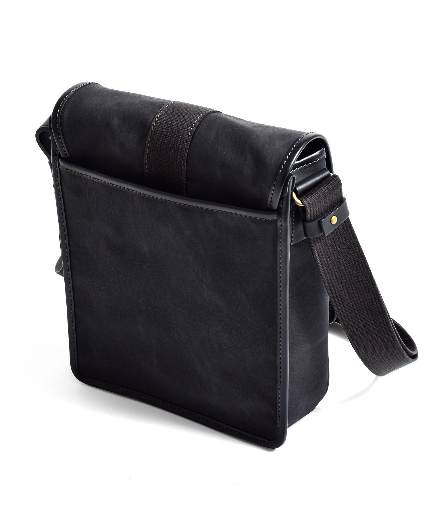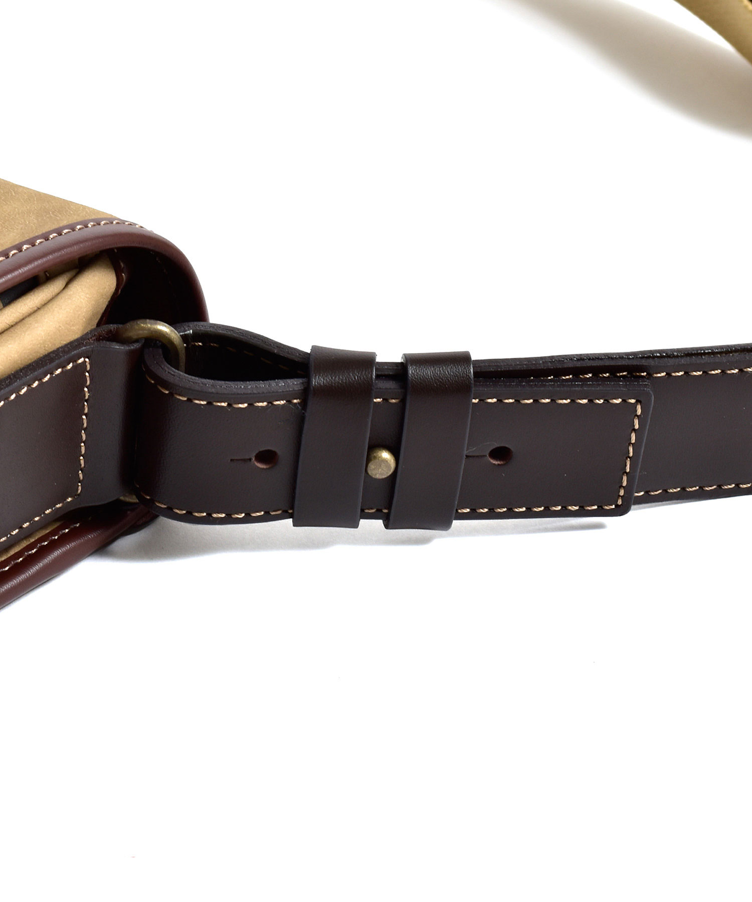 スエードのようなの起毛感のあるコットン100%素材にPVCコーティング加工を施し、味のある色合いの素材に仕上げました。雨や汚れに強く、色落ちの心配もありません。重さも580gと軽量に作られているのでデイリーユースに最適です。フラップセンターから下へと垂直に伸びるコットンテープは圧縮ローラーをかけ、WAX加工を施したこだわりのデザインです。