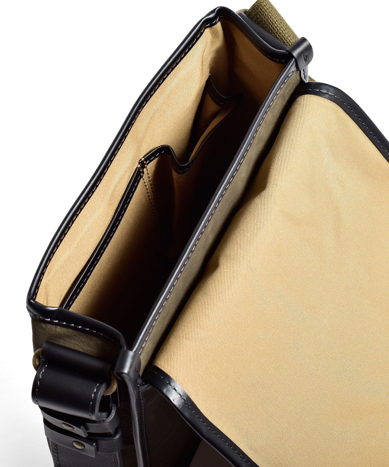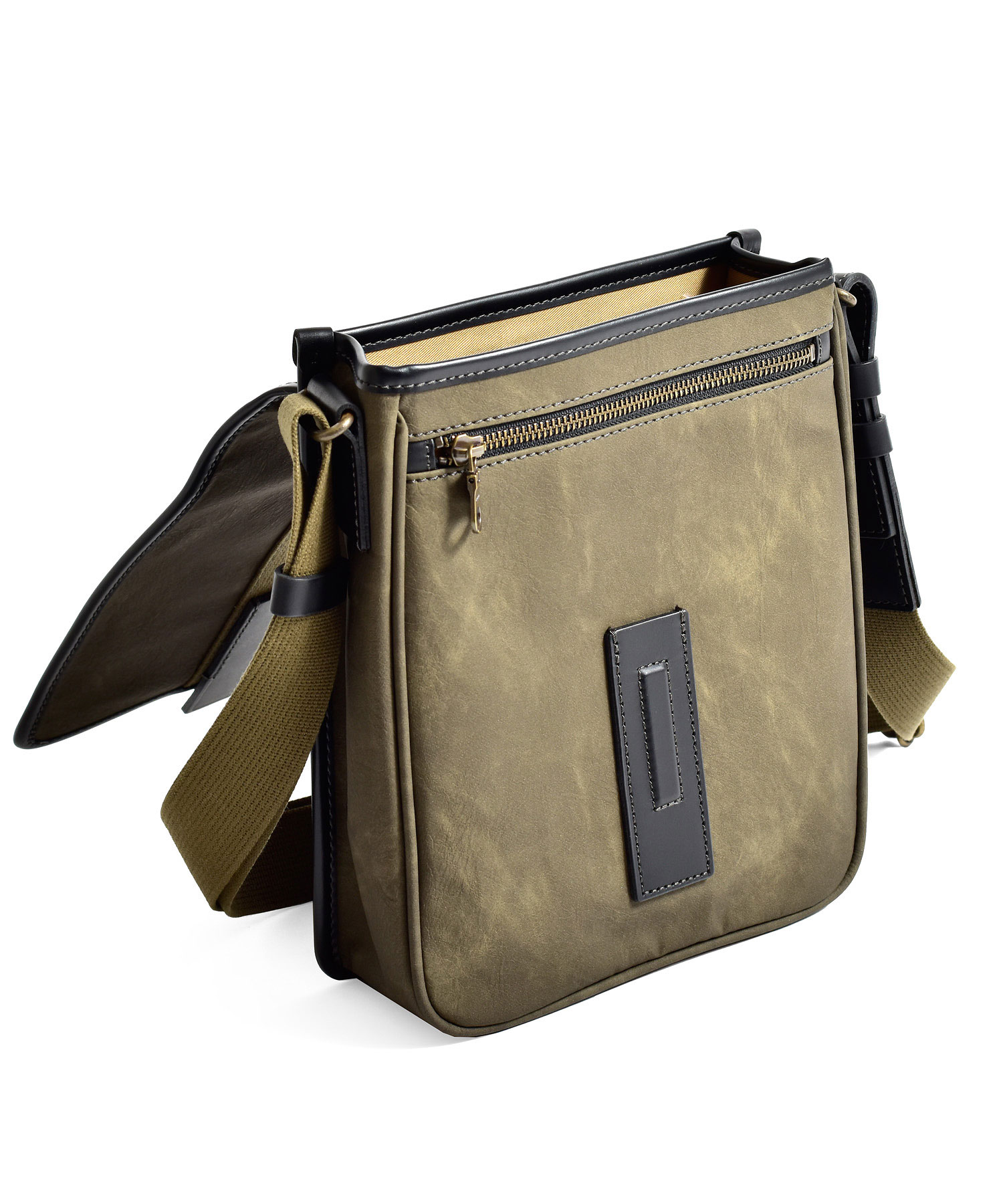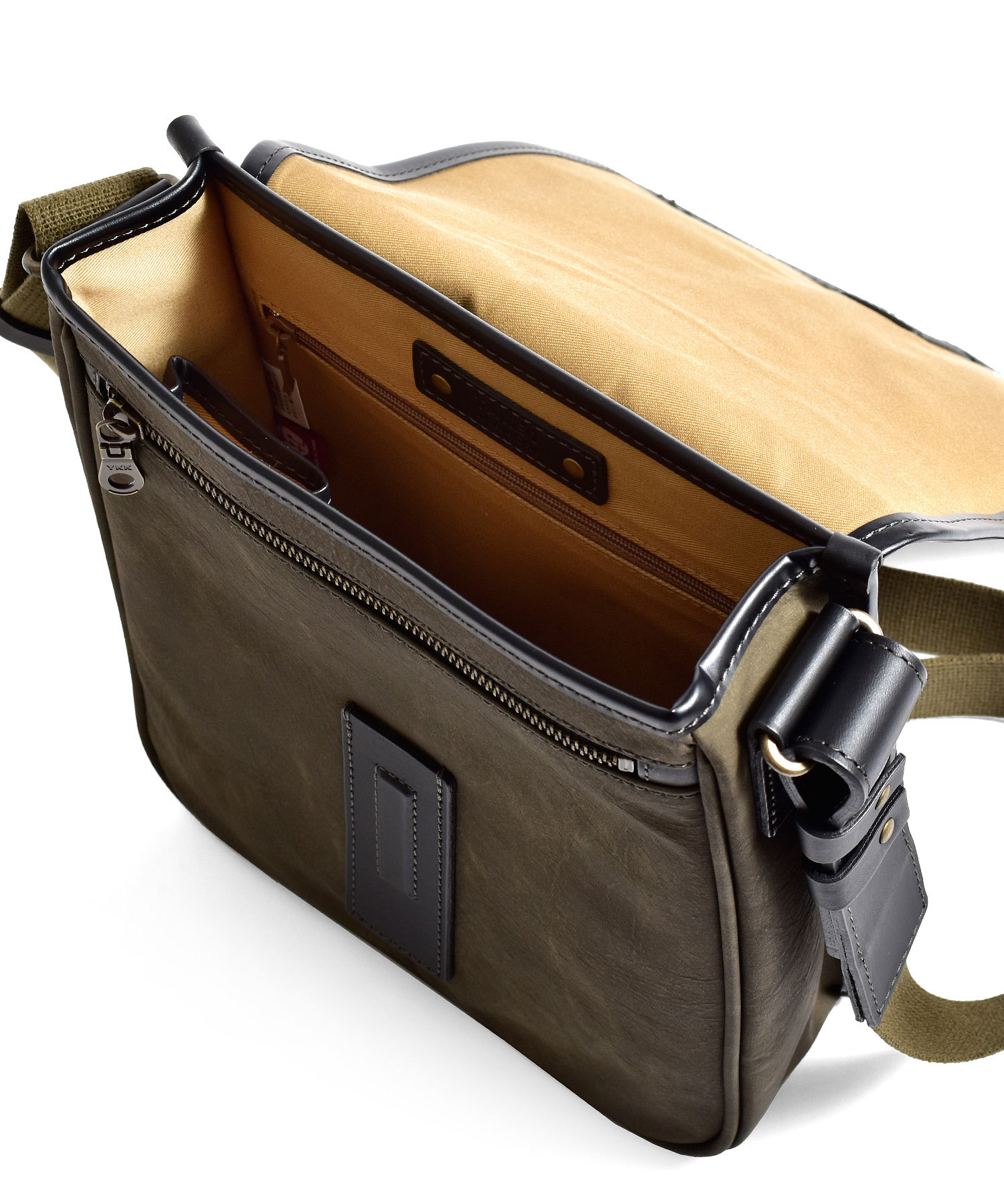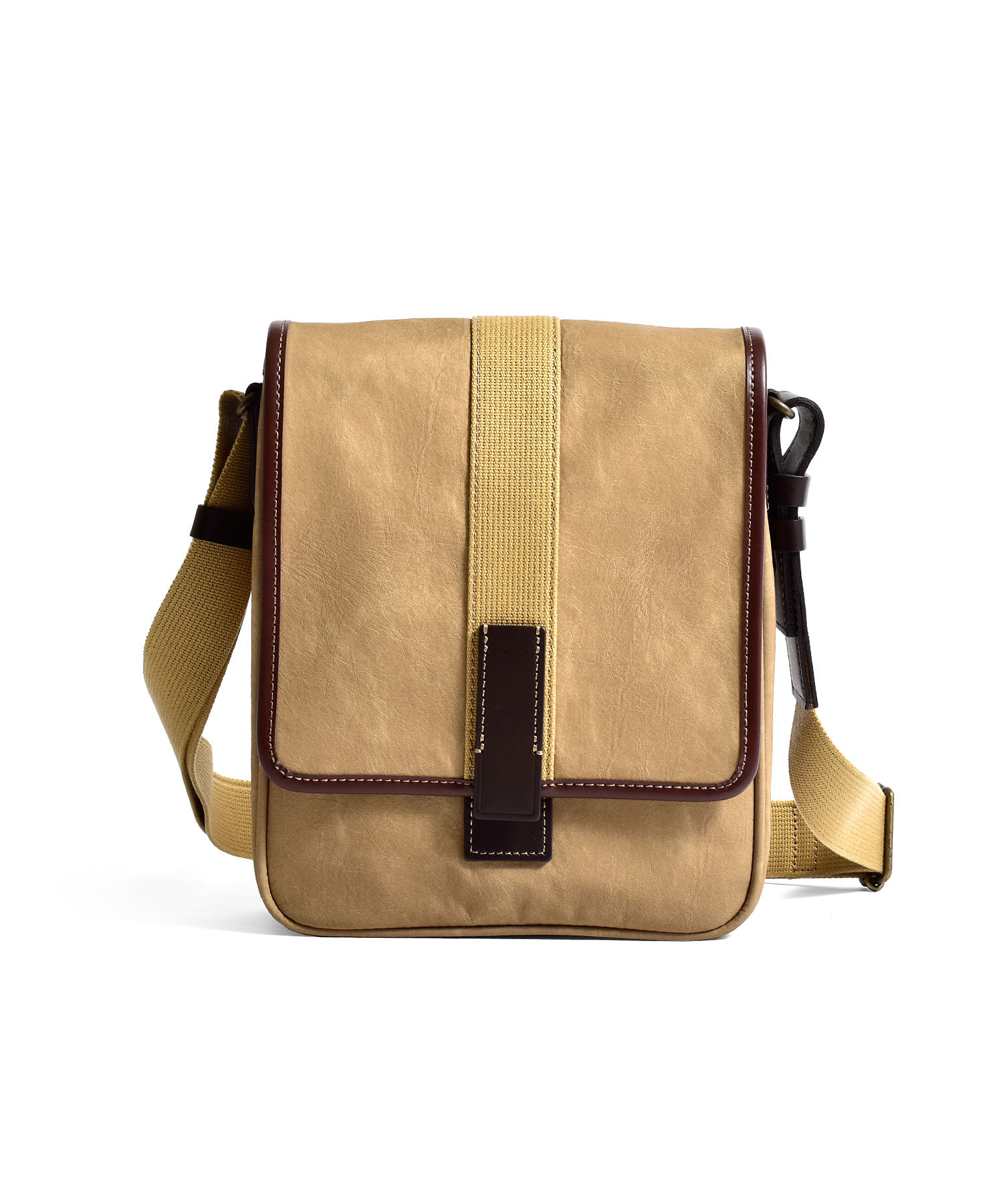 スエードのようなの起毛感のあるコットン100%素材にPVCコーティング加工を施し、味のある色合いの素材に仕上げました。雨や汚れに強く、色落ちの心配もありません。重さも580gと軽量に作られているのでデイリーユースに最適です。フラップセンターから下へと垂直に伸びるコットンテープは圧縮ローラーをかけ、WAX加工を施したこだわりのデザインです。