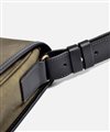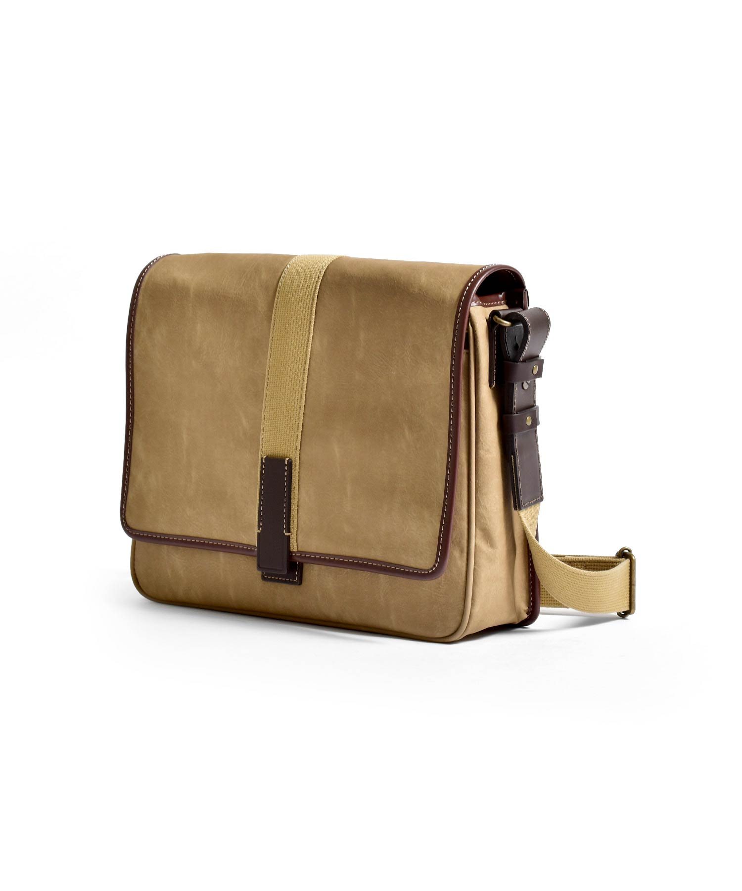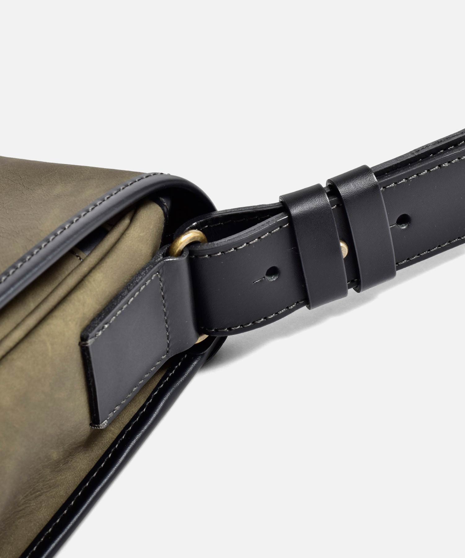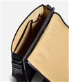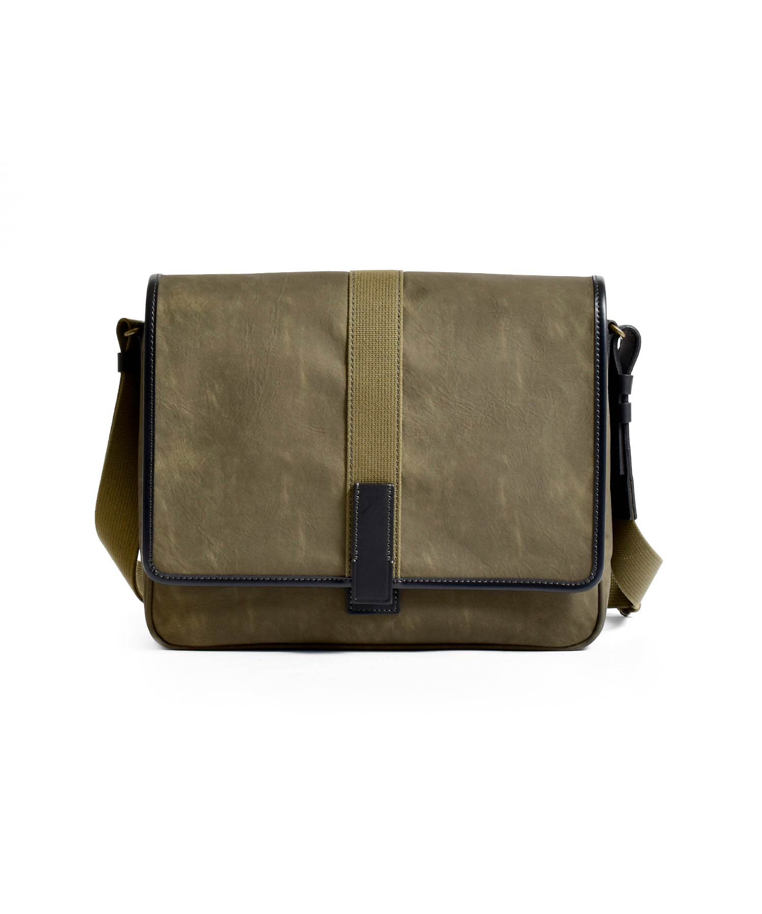 スエードのようなの起毛感のあるコットン100%素材にPVCコーティング加工を施し、味のある色合いの素材に仕上げました。雨や汚れに強く、色落ちの心配もありません。重さも740gと軽量に作られているのでデイリーユースに最適です。フラップセンターから下へと垂直に伸びるコットンテープは圧縮ローラーをかけ、WAX加工を施したこだわりのデザインです。