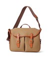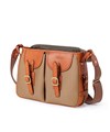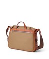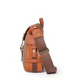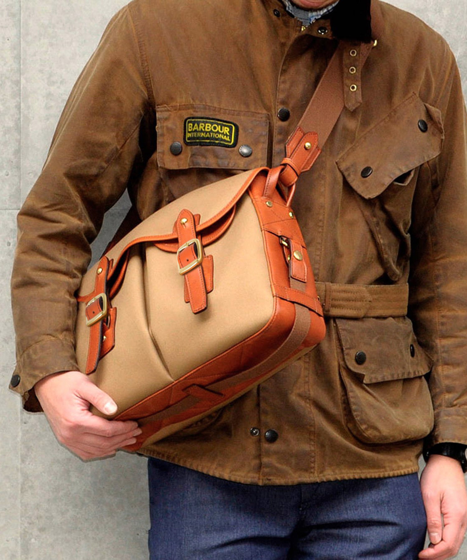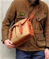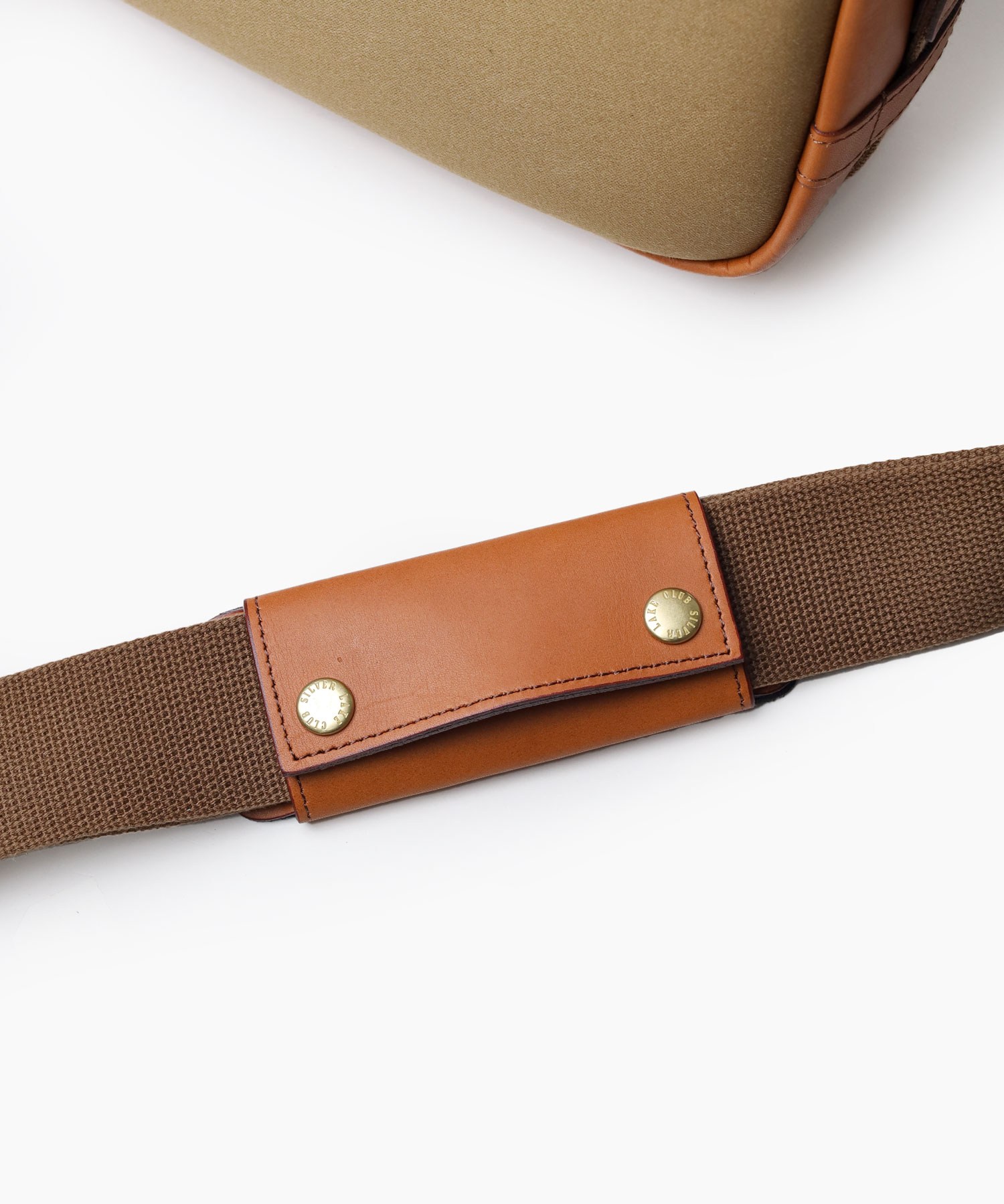 持ち手やデザインのポイントになっているレザーベルト部分は、ヌメ調のハードな革を使用し、朱子の生地と調和して洗練された仕上がりになっています。ショルダーベルトを取り付けるループは、金具ではなく、革を本体のループに通してギボシで留めるタイプを採用しています。手の込んだ作りがこだわりを感じさせます。
