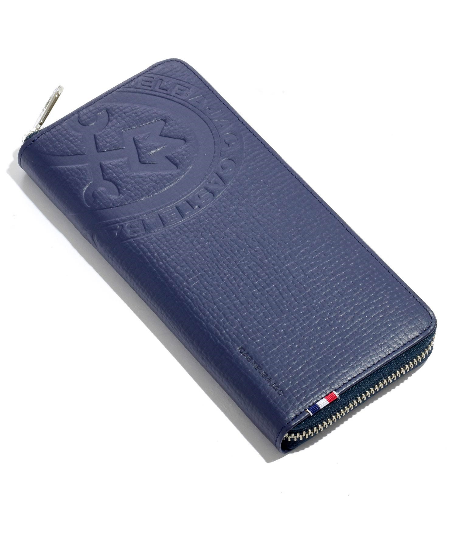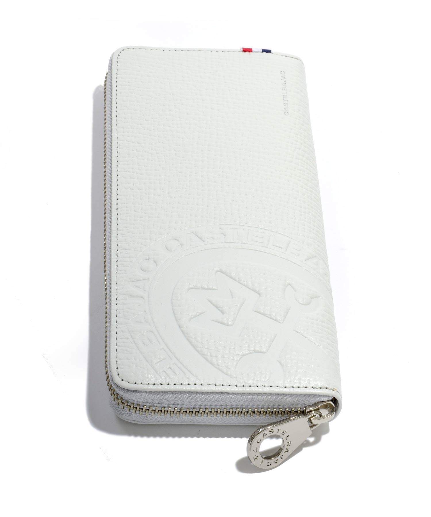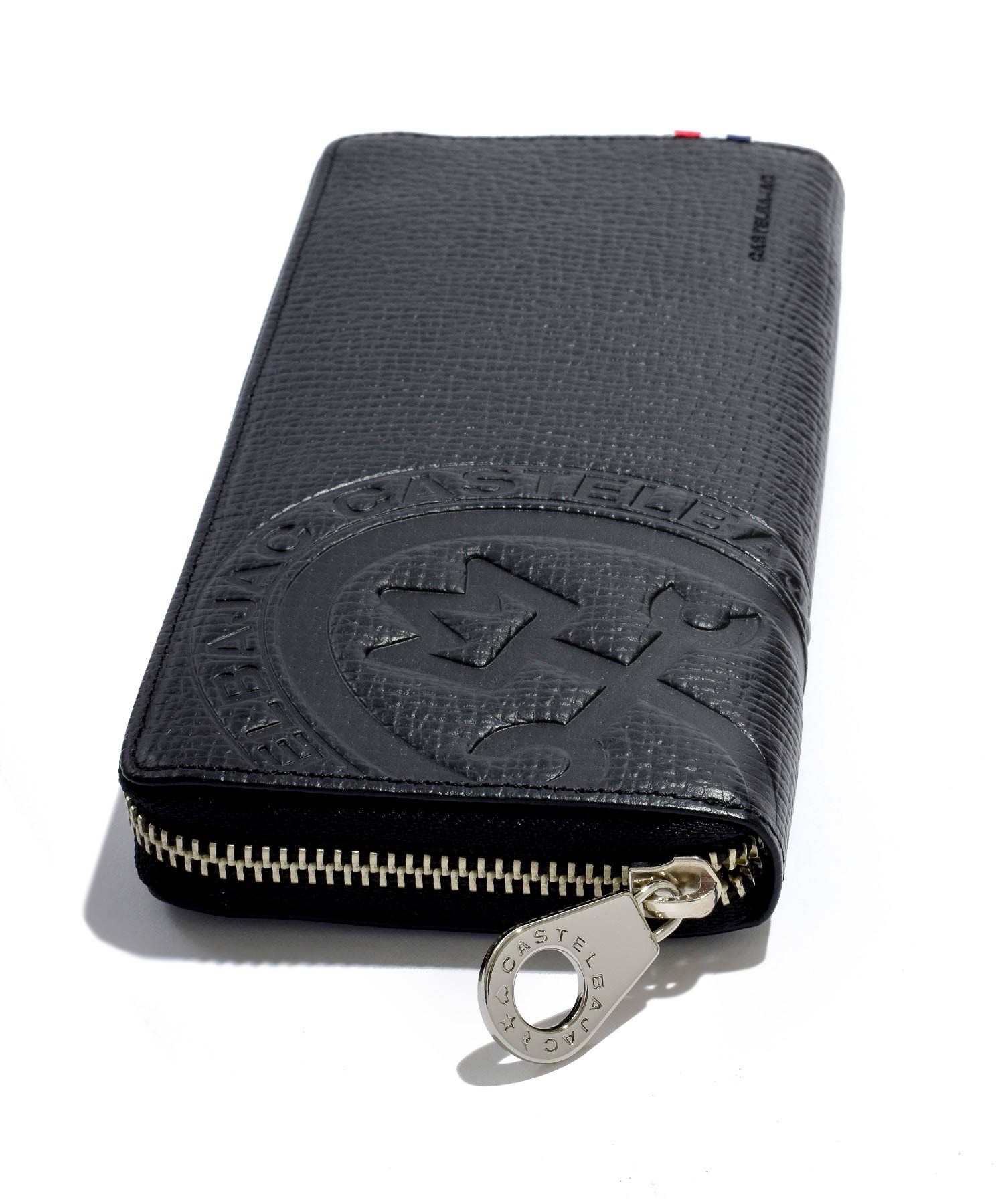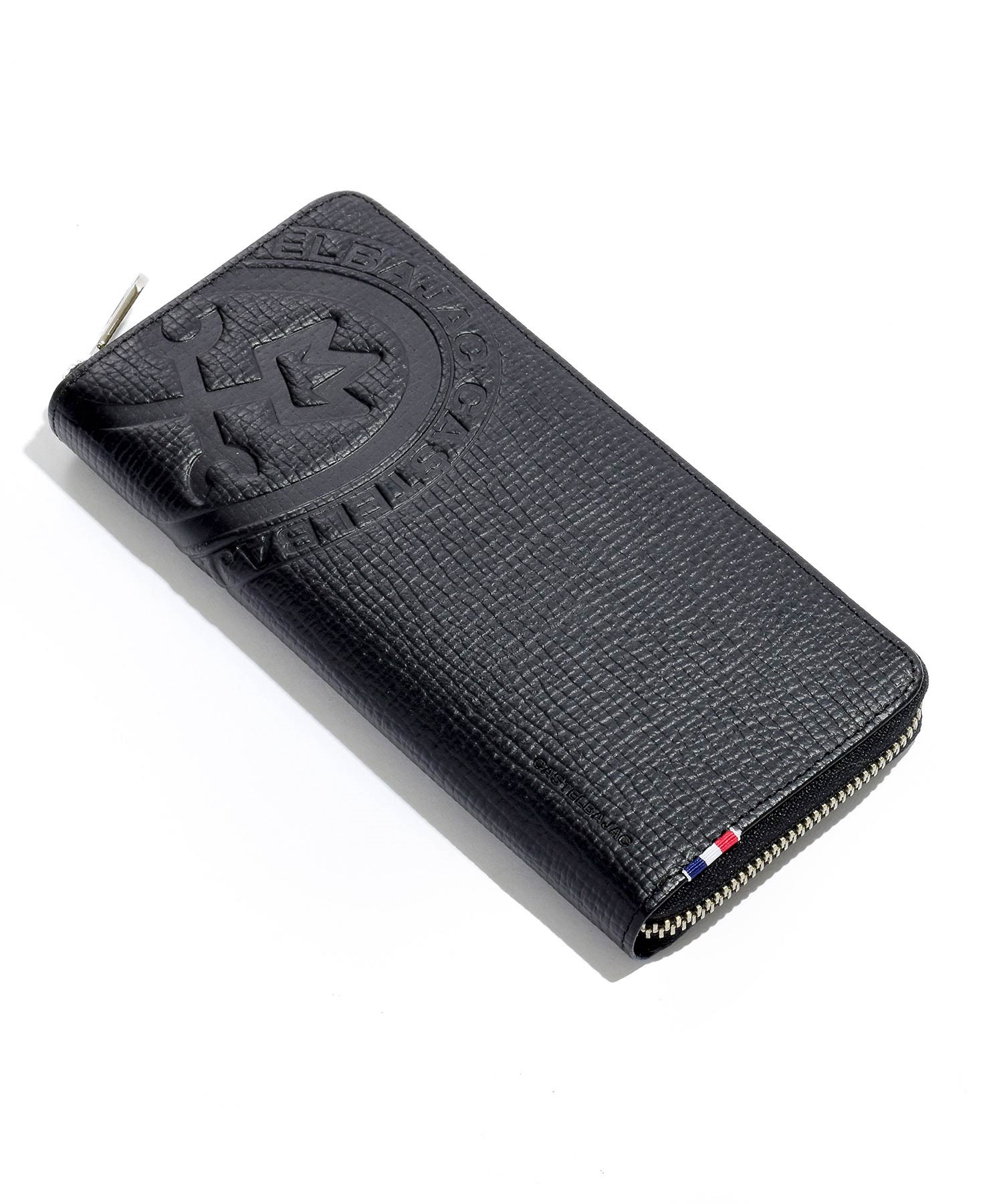 カステルバジャックの家紋ロゴを大胆に型押しした、ピッコロシリーズのラウンドファスナー長財布。本体素材には型押し牛革を使用。