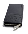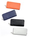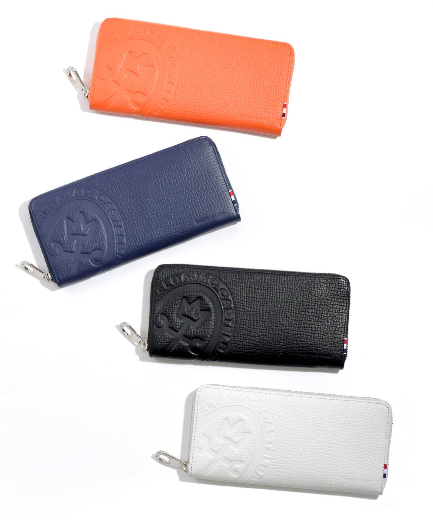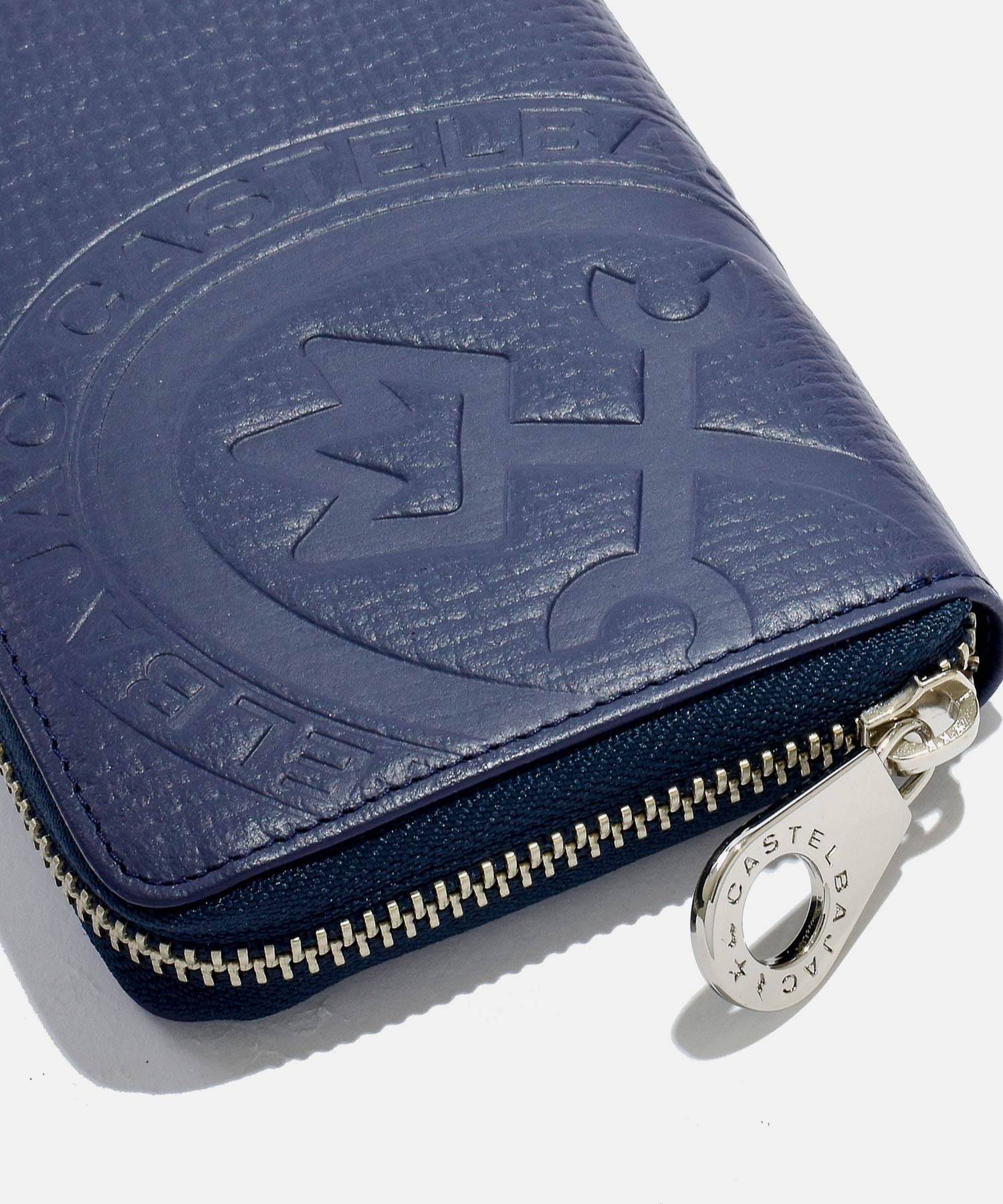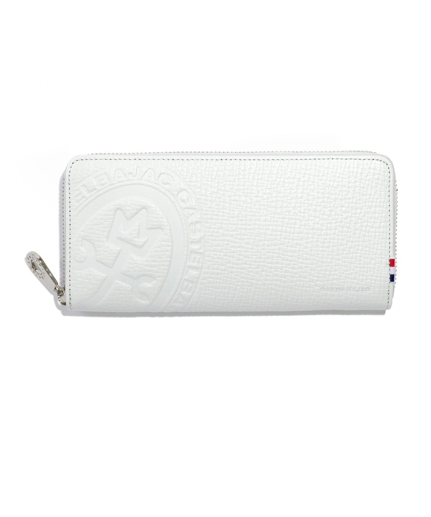 カステルバジャックの家紋ロゴを大胆に型押しした、ピッコロシリーズのラウンドファスナー長財布。本体素材には型押し牛革を使用。