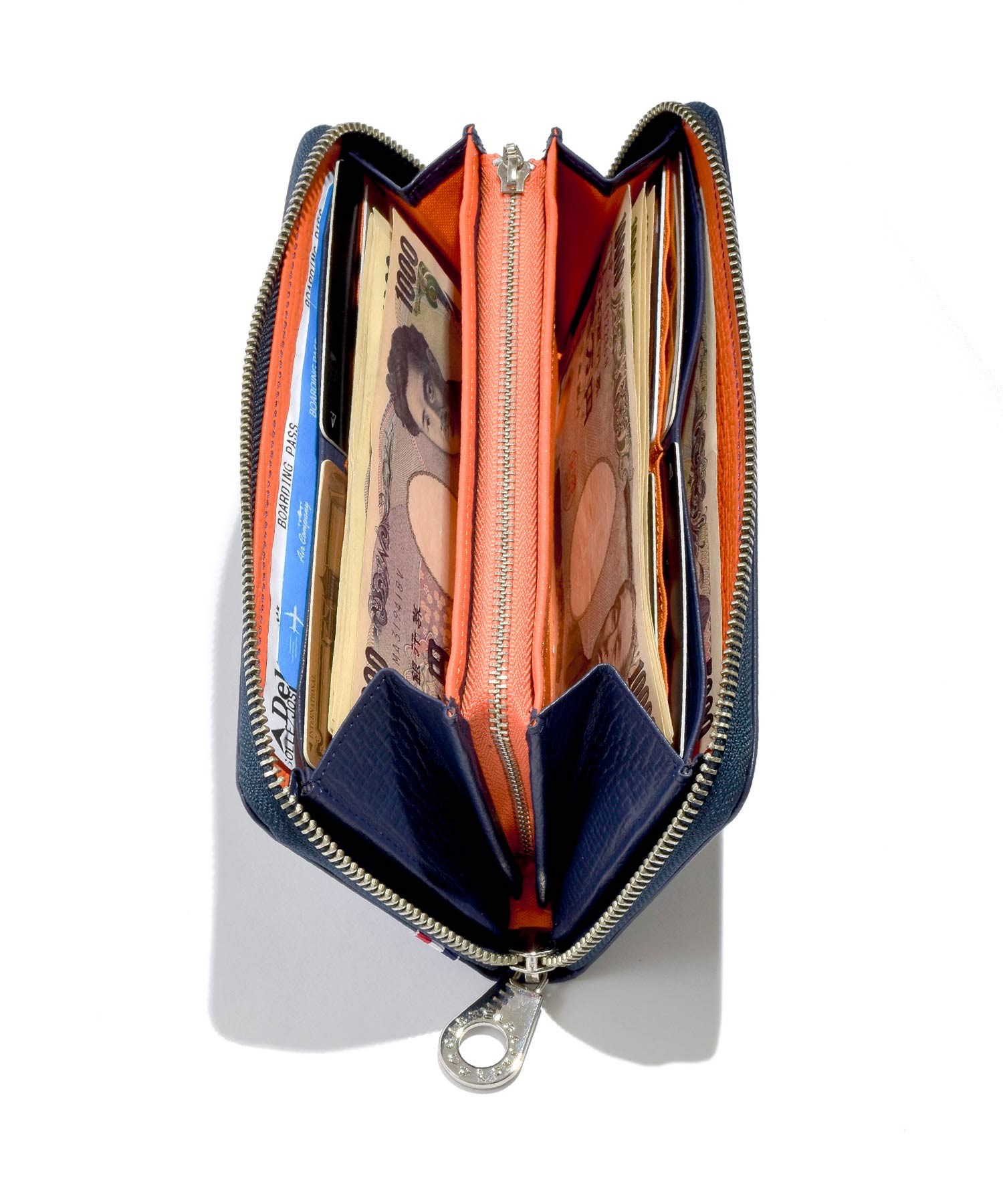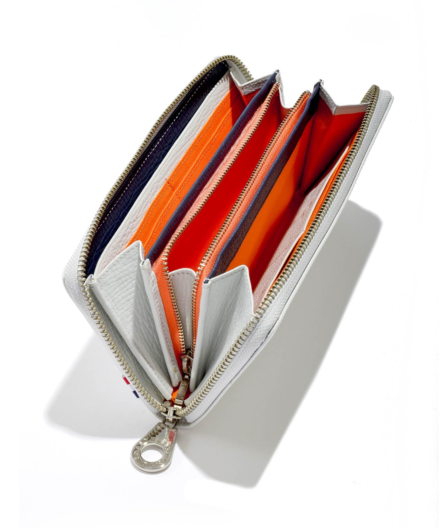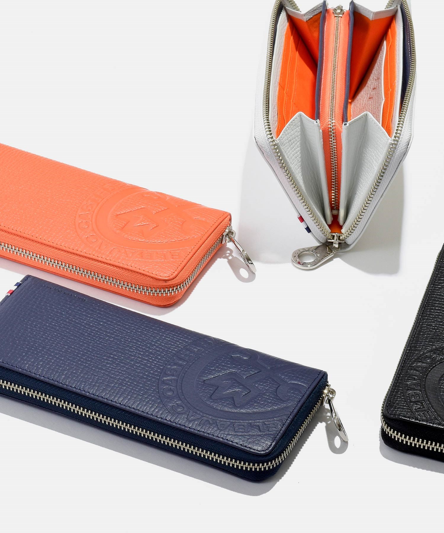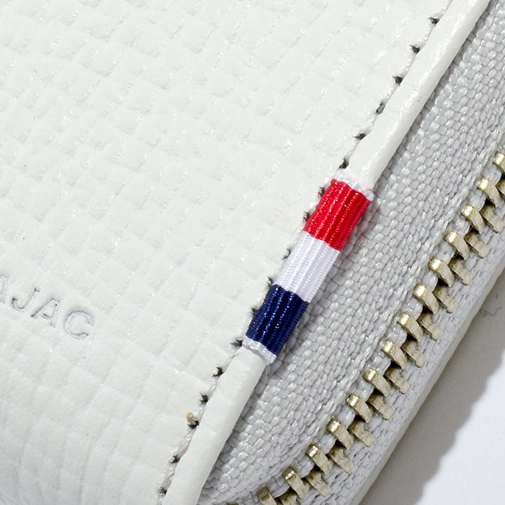 財布の正面にはブランドファンの心をくすぐる迫力サイズの「家紋」表現。また、ブランド本国のフランスの国旗カラーであるトリコロールの織りネームもアクセントになっています。