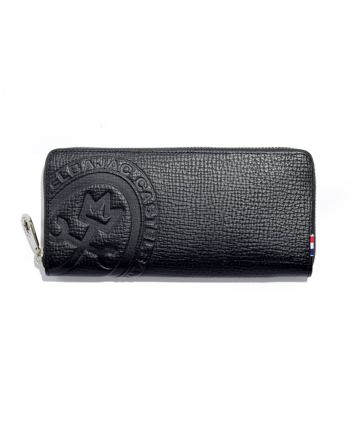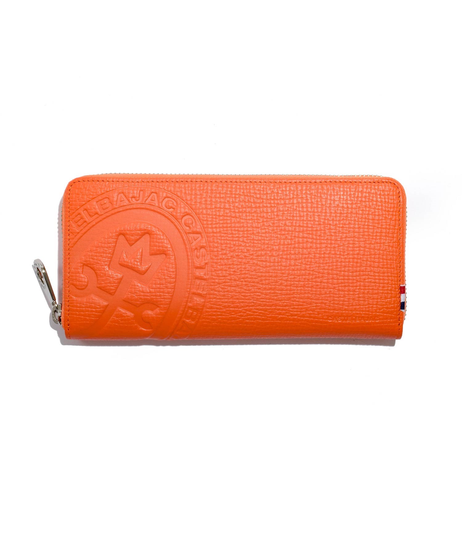 カステルバジャックの家紋マークを大胆に型押しで表現した長財布の正面デザイン。