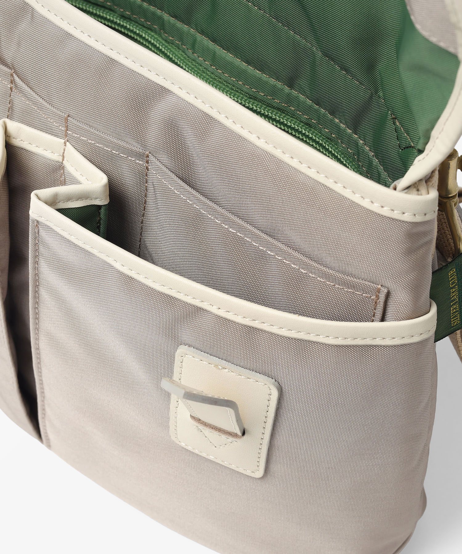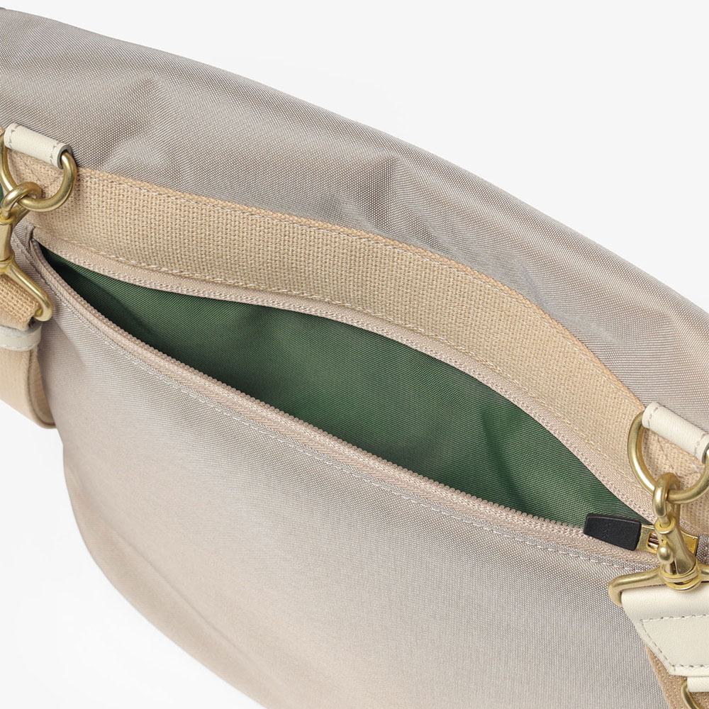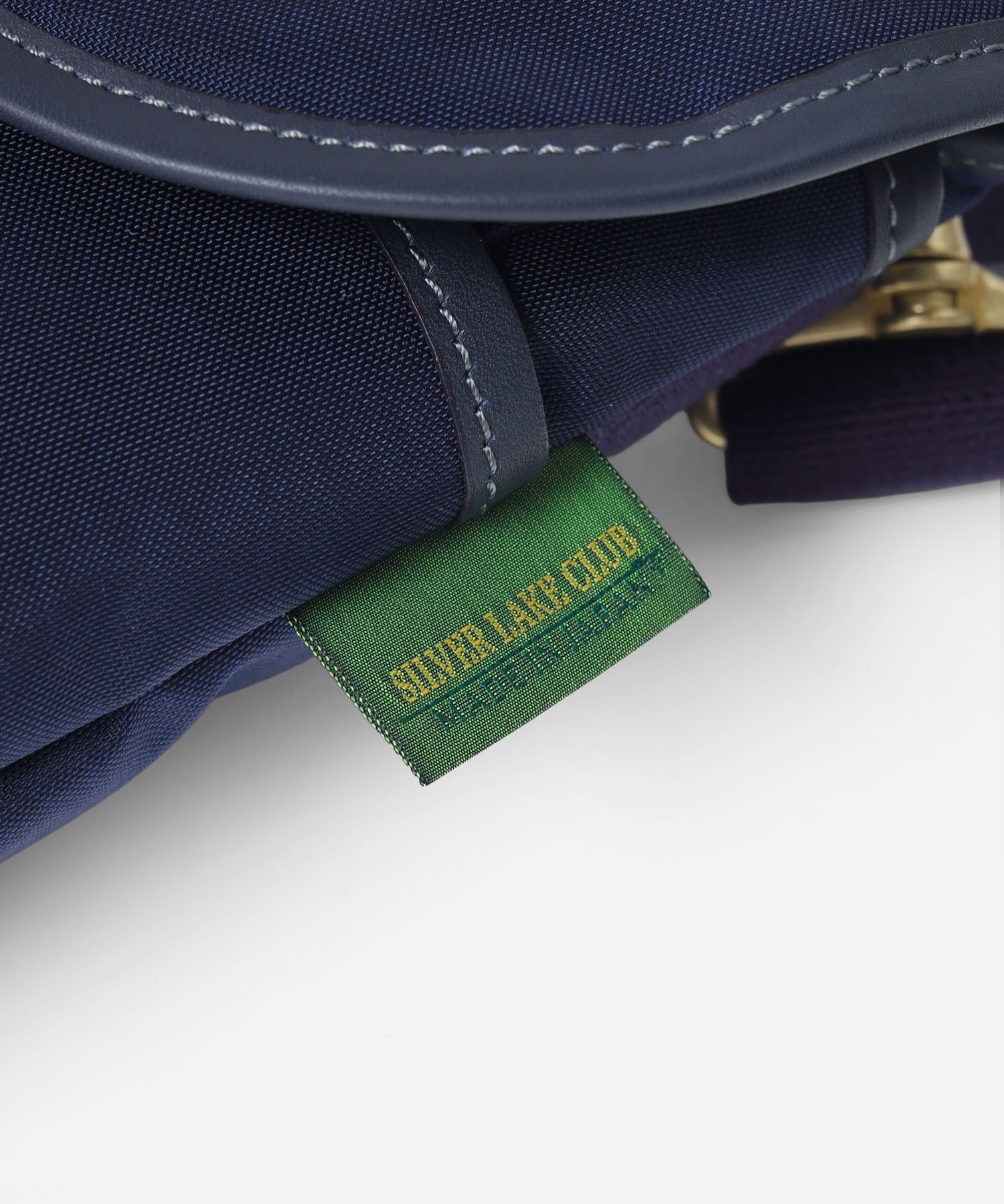 付属の革には、SILVER LAKE CLUB定番のオイルレザーを使用しています。油分を多く含むことで水分が浸透しにくく、使い込むほどに風合いが深まる経年変化(エイジング)を楽しめます。アイコンでもあるギボシ仕様は、頑丈さと機能性を兼ね備えたデザインのアクセントになっています。また、ショルダーベルトには、イヤホンなどの小物を取り付けられる便利なDカンを備え、実用性にも配慮しています。