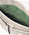 かぶせの下には、ハンカチやパスケースの収納に便利な大きめのポケットと、スマートフォンがすっきり収まる小ポケット、さらにペンさしがそれぞれ2つ備えられています。メインルームは、本やノートなどを収納できる十分な容量があり、外出に必要な最低限の荷物もすっきりと収めることができます。さらに、メインルーム内にはファスナーポケットとオープンポケットを備えており、貴重品や小物を整理して収納可能です。また、バッグの背面にもファスナーポケットを設けており、使い勝手の良い贅沢な仕様となっています。