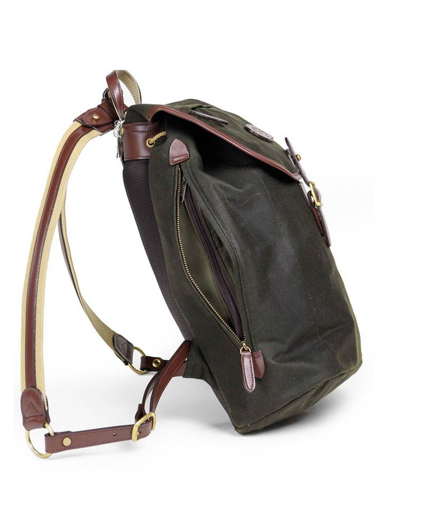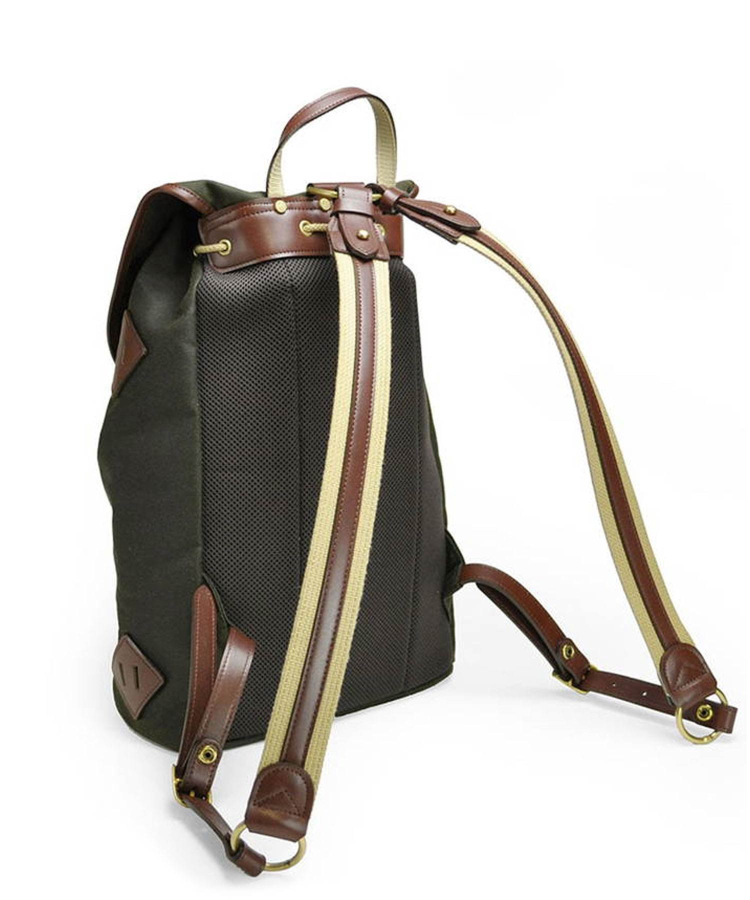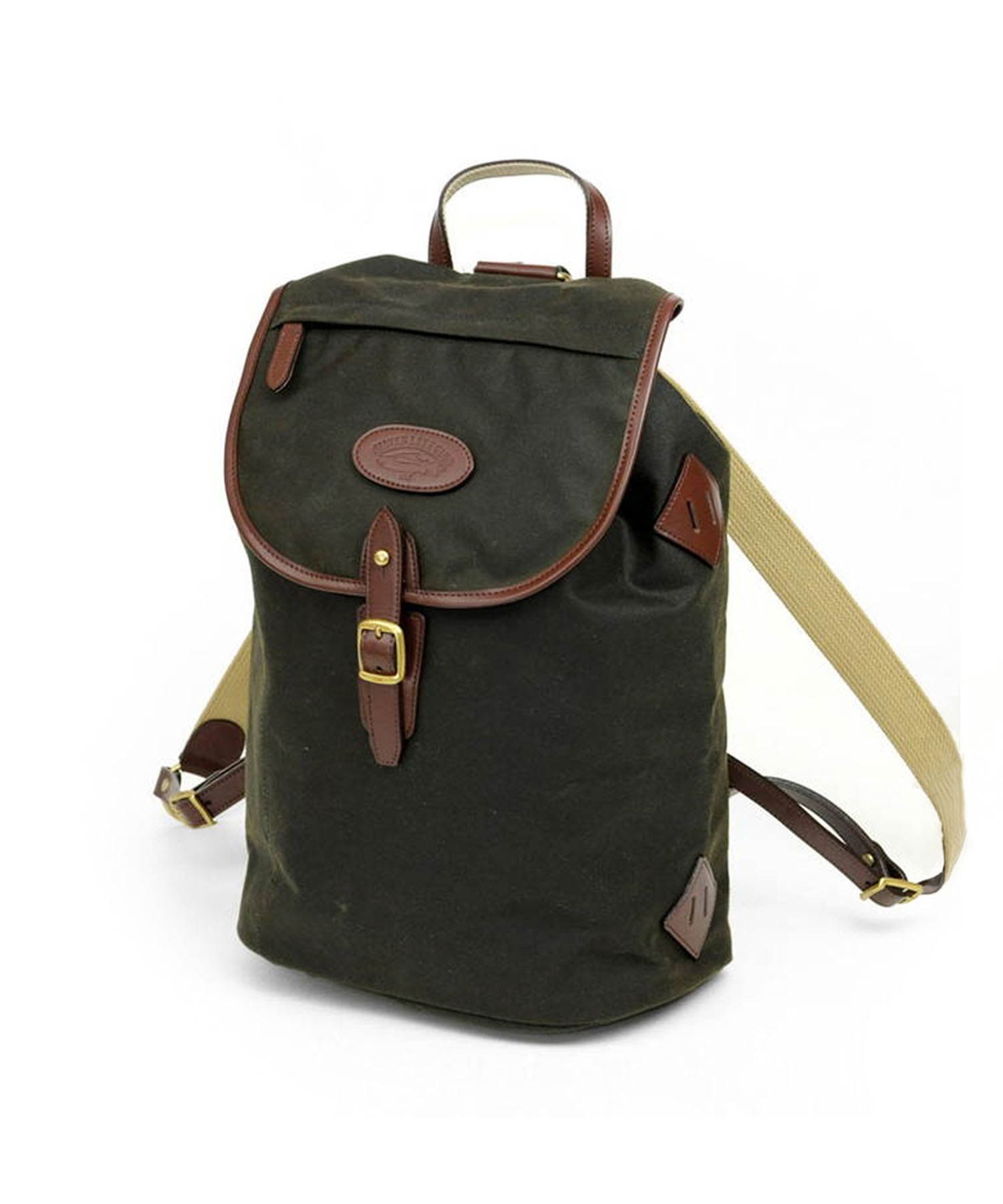 深いグリーン色と、付属のオイルパラフィン牛革が味わい深い、"ワックスドコットン"シリーズのリュック。開口部は巾着式ですので、口が大きく開くので出し入れもスムーズ。背負いのベルト部分は、“本体に縫いつけ”と違い、“Dカン金具への取り付け”なので、ベルトの動きに幅が出て、背負った際に体型に合わせた場所で止まるよう考えられています。これにより、背負いベルトの付け根部分が浮いたりする事が少なく、フィット感が味わえます。