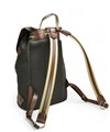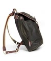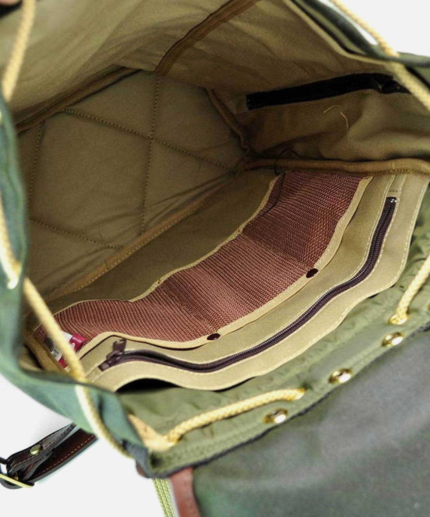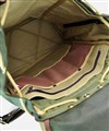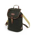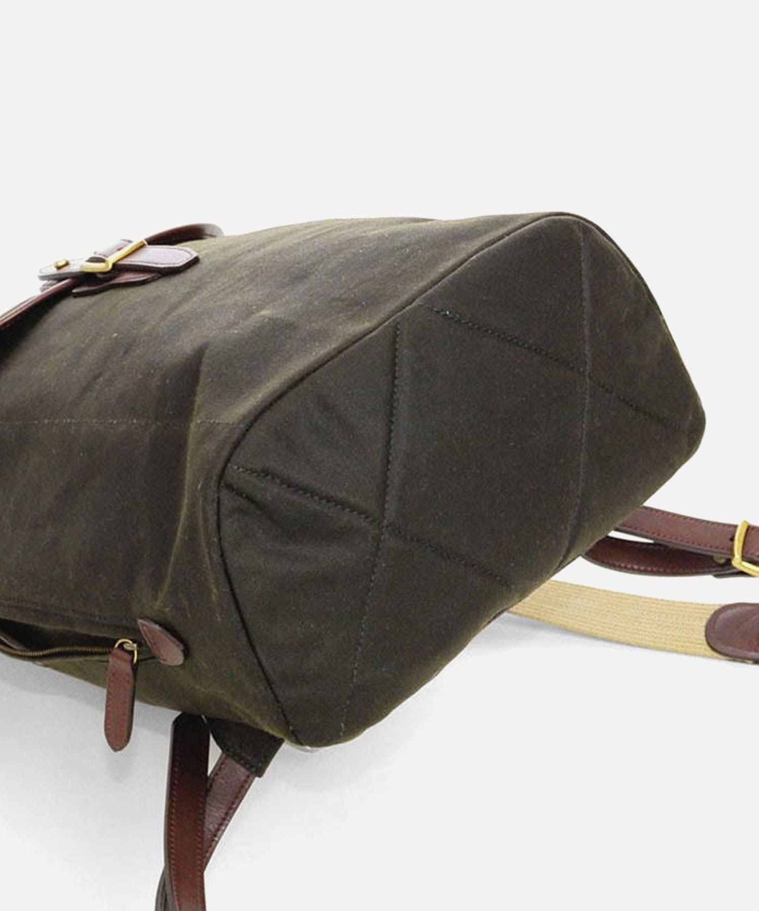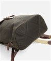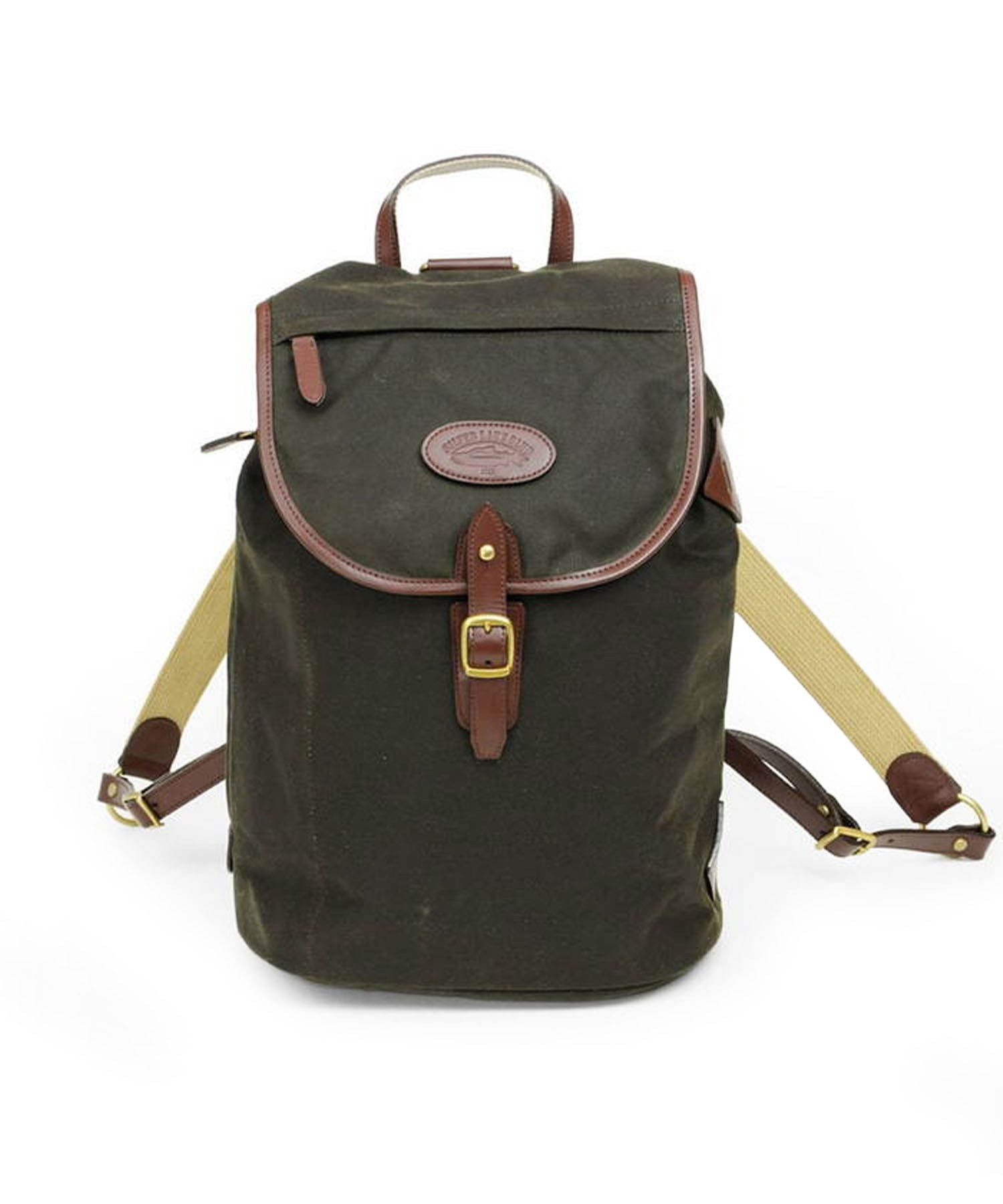 深いグリーン色と、付属のオイルパラフィン牛革が味わい深い、"ワックスドコットン"シリーズのリュック。開口部は巾着式ですので、口が大きく開くので出し入れもスムーズ。背負いのベルト部分は、“本体に縫いつけ”と違い、“Dカン金具への取り付け”なので、ベルトの動きに幅が出て、背負った際に体型に合わせた場所で止まるよう考えられています。これにより、背負いベルトの付け根部分が浮いたりする事が少なく、フィット感が味わえます。
