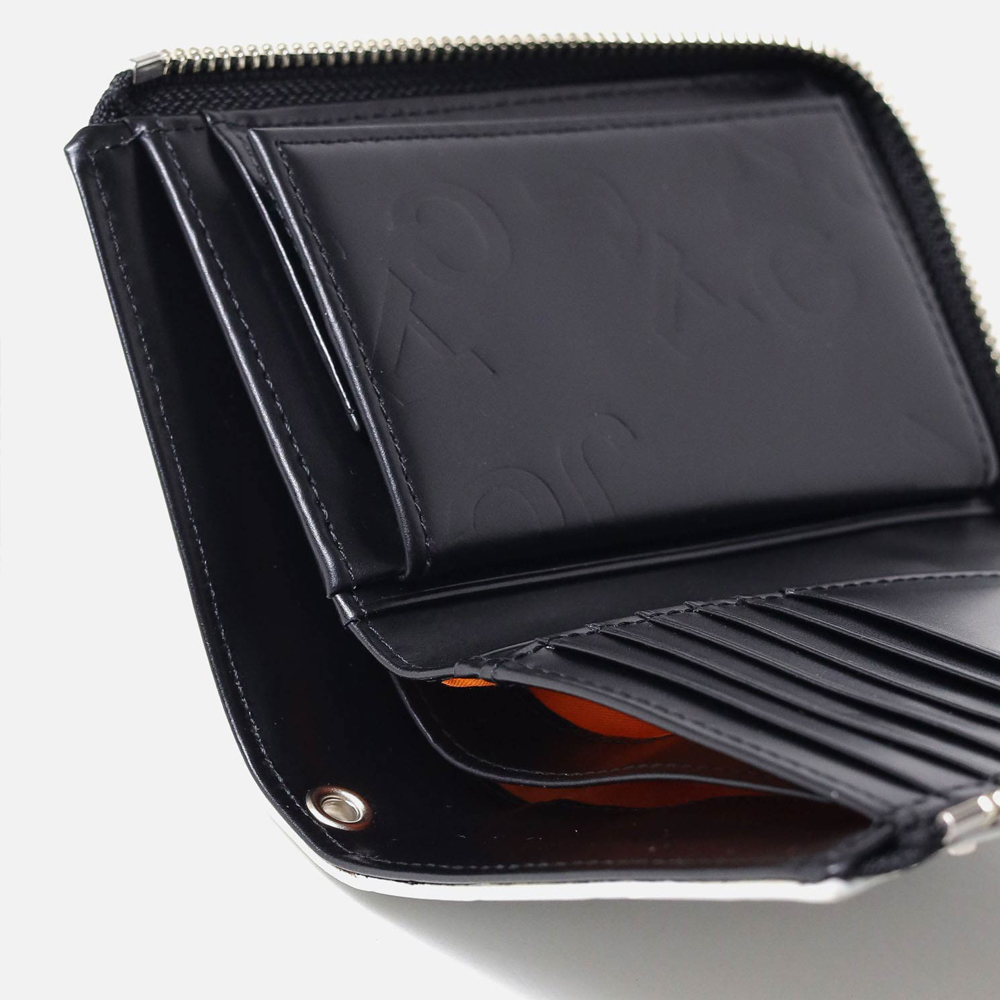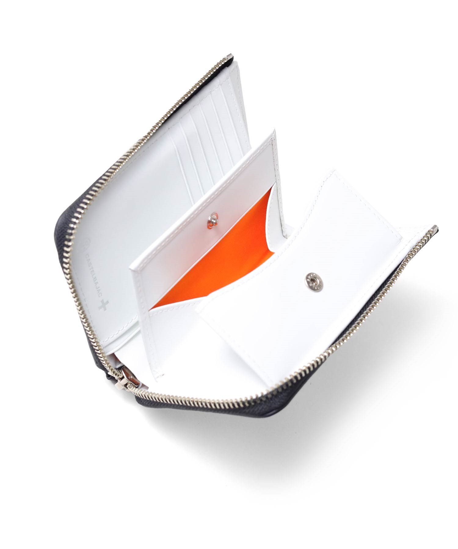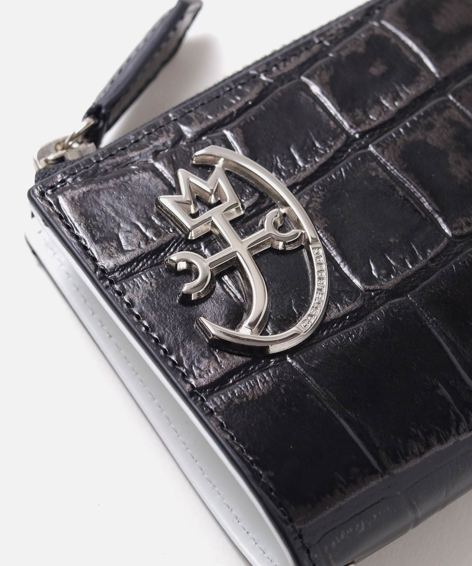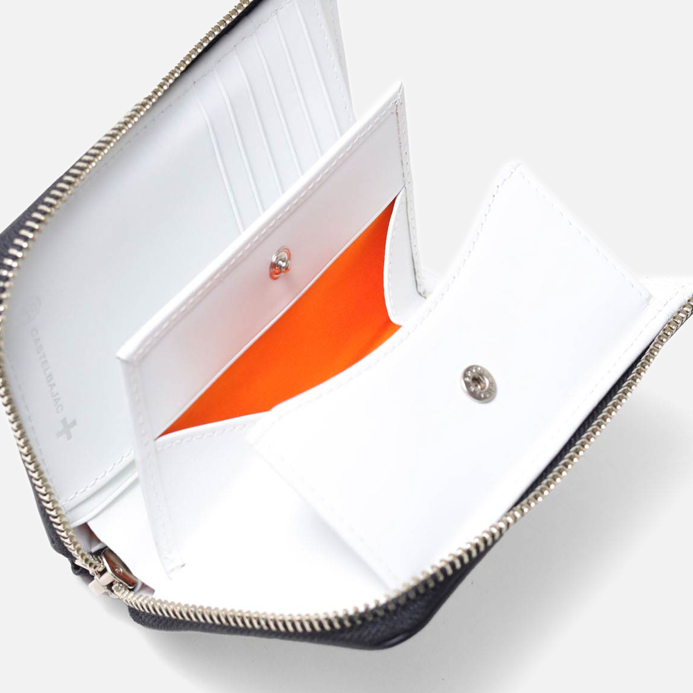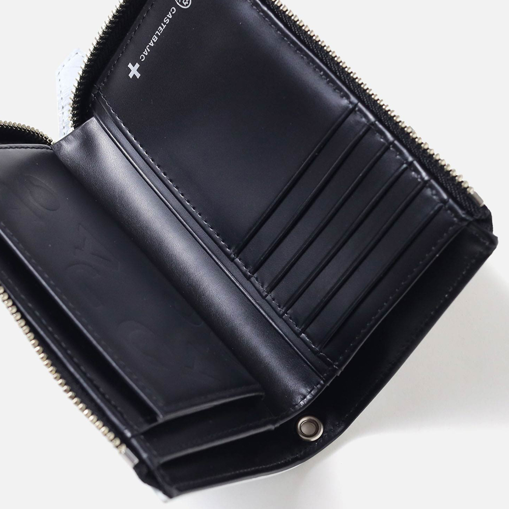 POPなイメージのあるカステルバジャックとは一味違う、ビンテージ物のような深みのある二つ折り財布です。ビンテージ風に仕上げるためにメタル箔を施したデザインがポイント。また、内装と外装は、モノトーンのカラーコンビに仕上げています。ラウンドファスナータイプなので、鞄の中で開いてしまったり、中身が散らばってしまうなどの心配がありません。