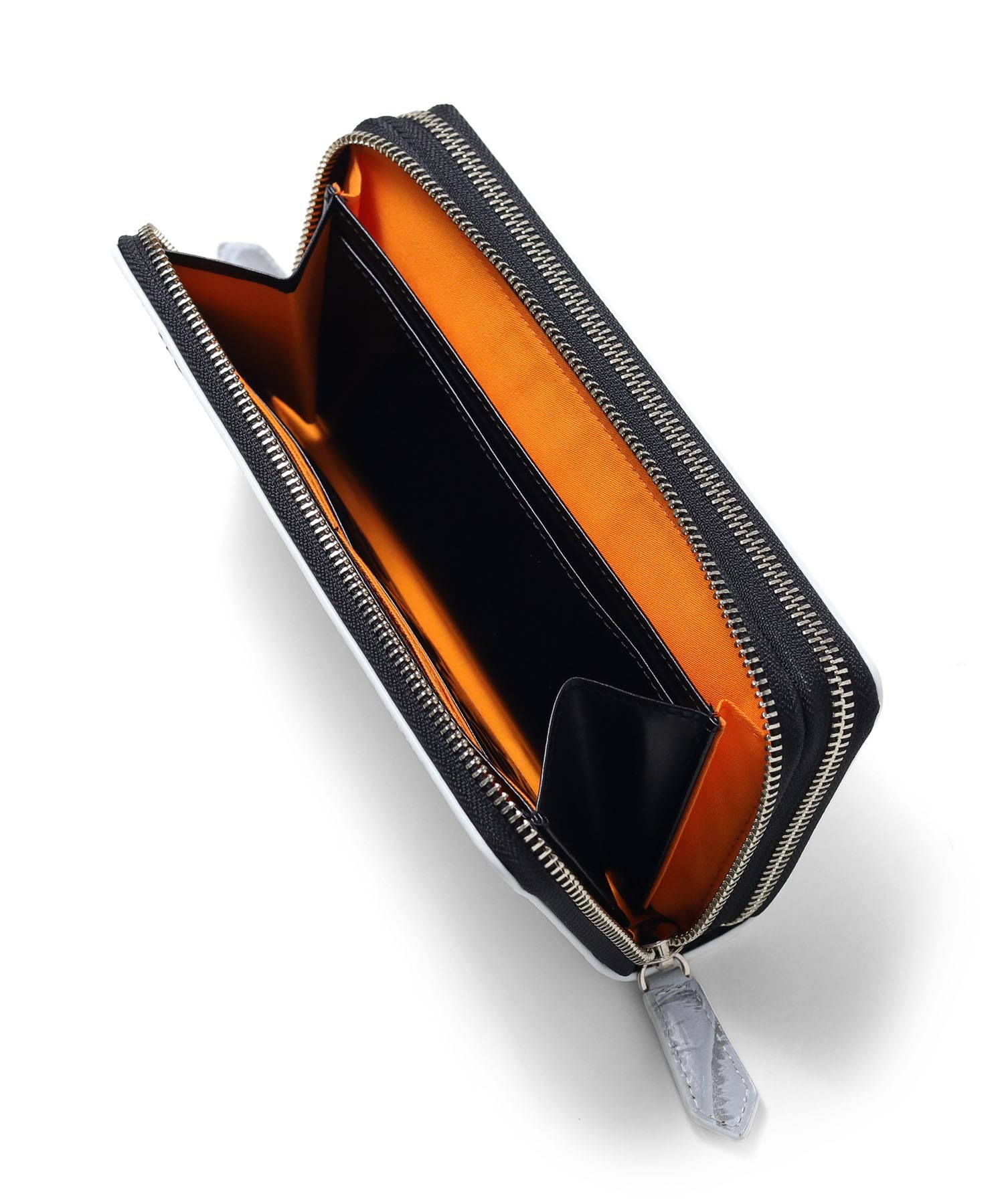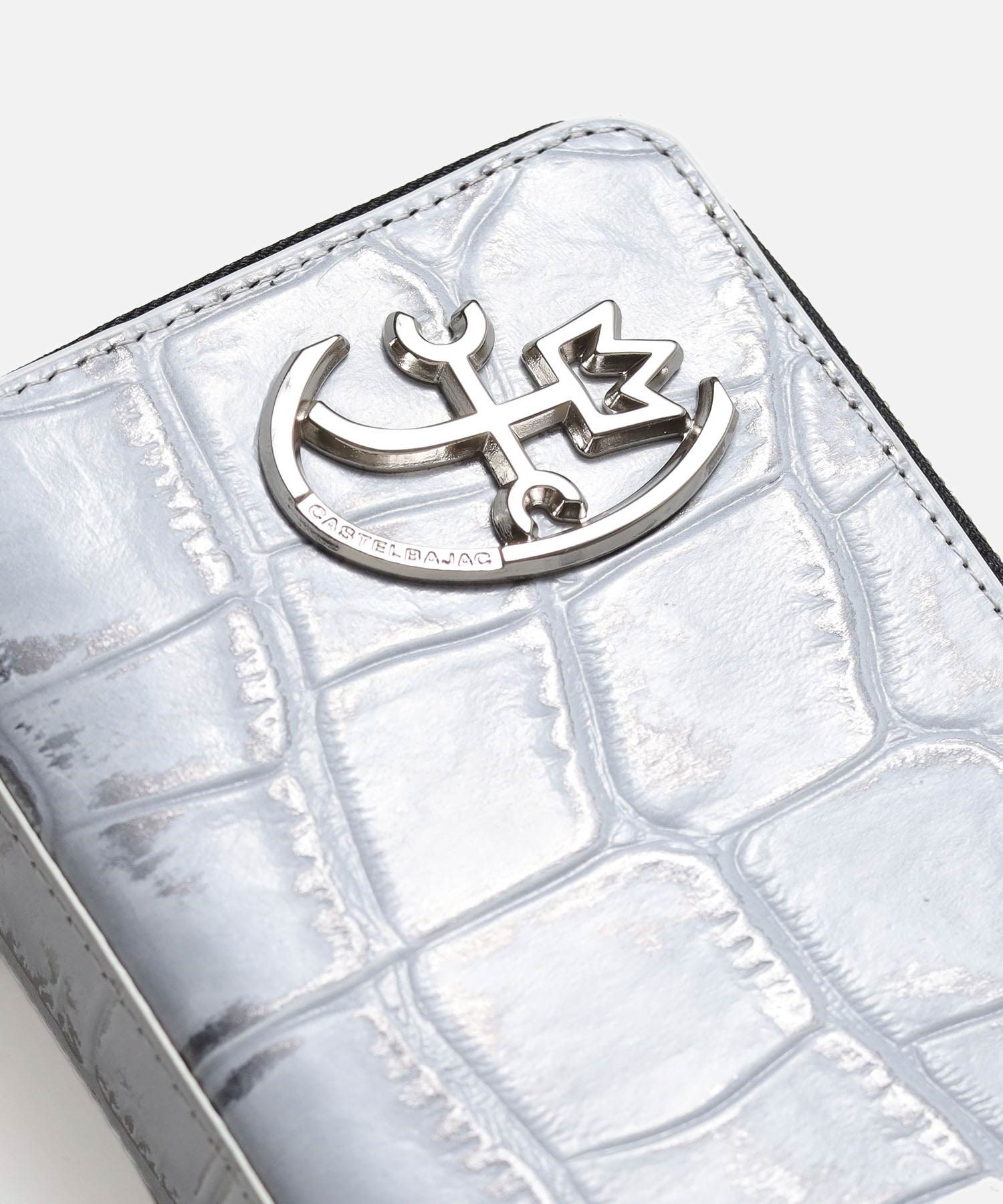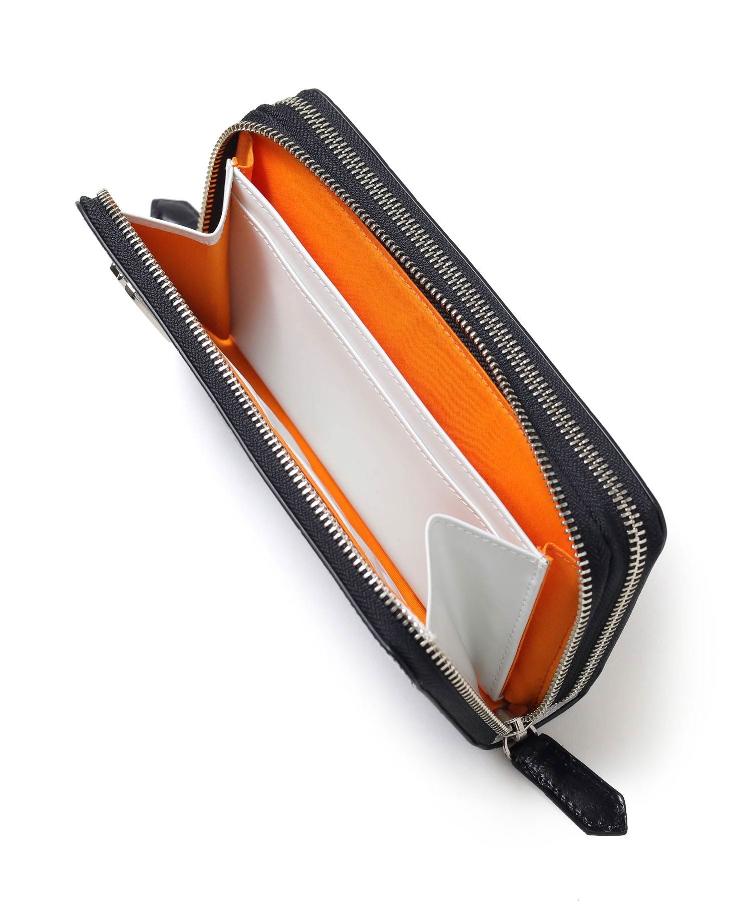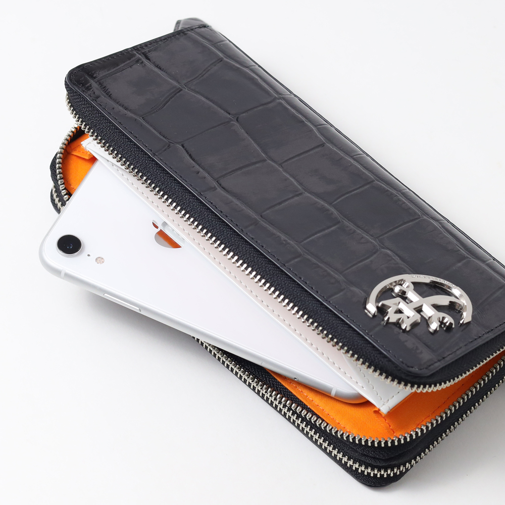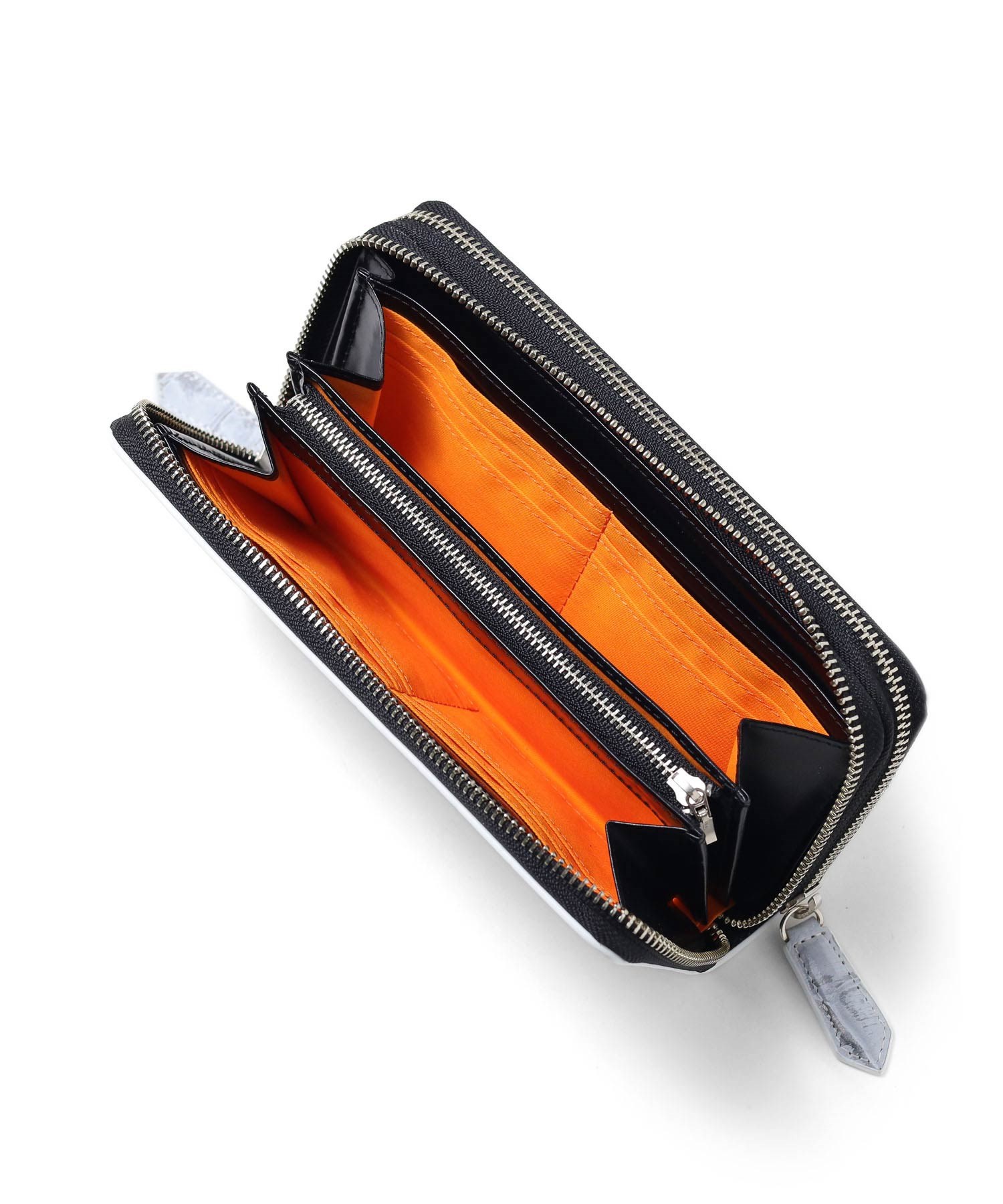 POPなイメージのあるカステルバジャックとは一味違う、ビンテージ物のような深みのある長財布です。ビンテージ風に仕上げるためにメタル箔を施したデザインがポイント。また、内装と外装は、モノトーンのカラーコンビに仕上げています。ダブルファスナータイプで、前室にはスマートフォンの収納が可能な大容量仕様になっています。