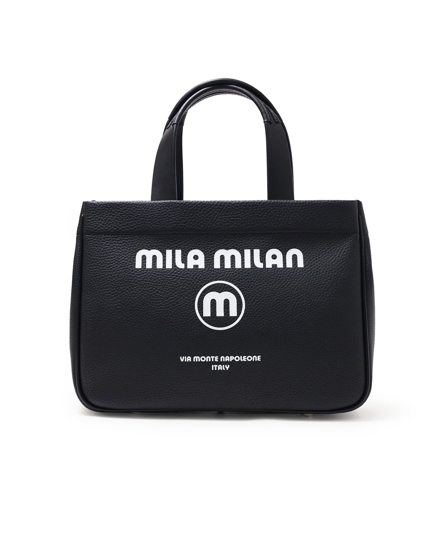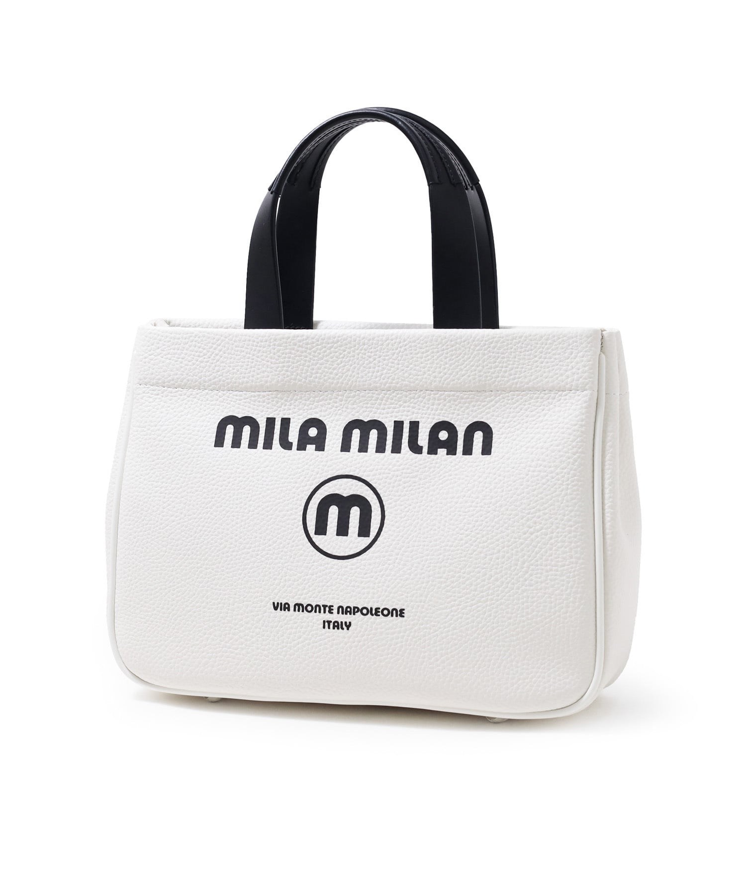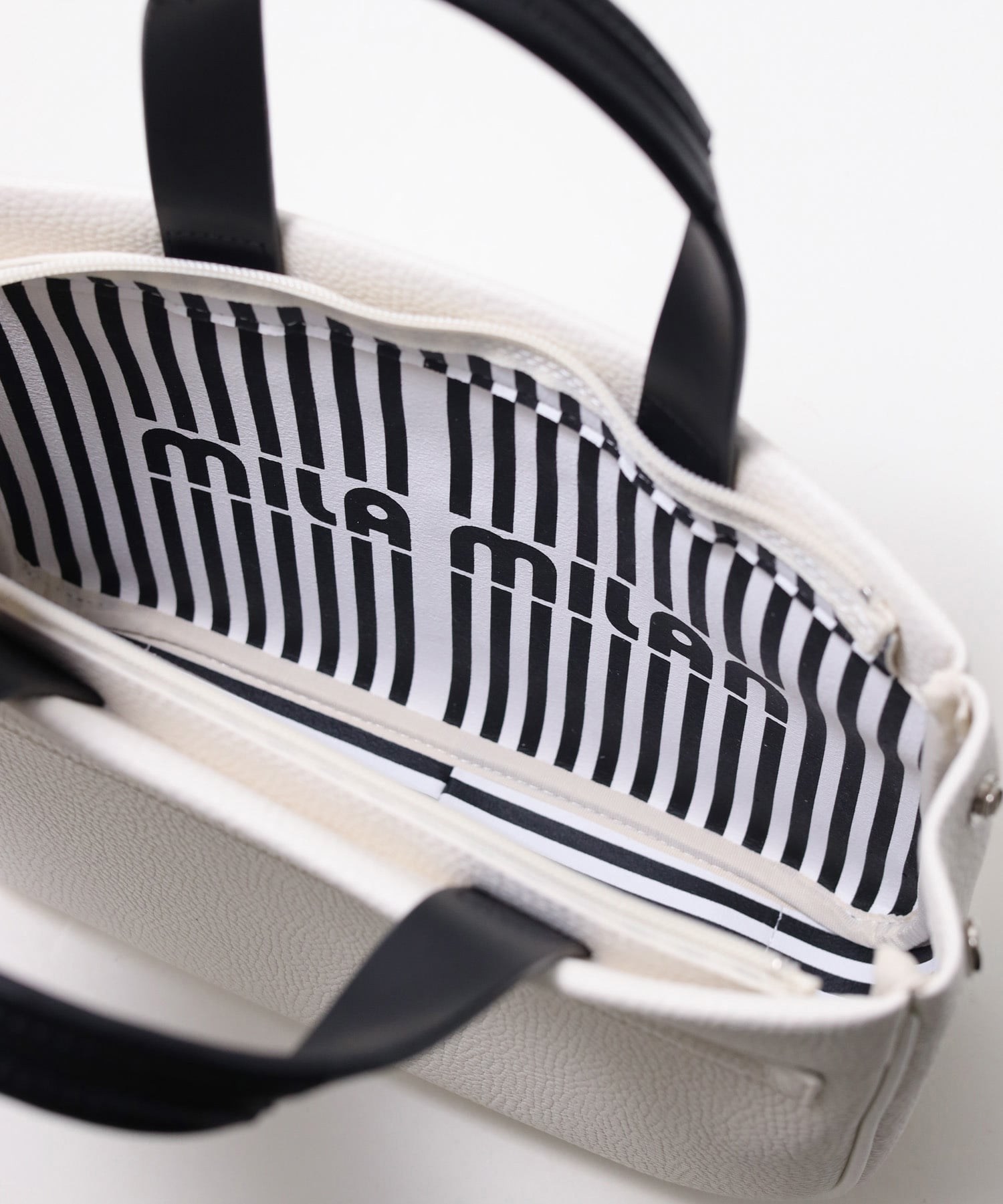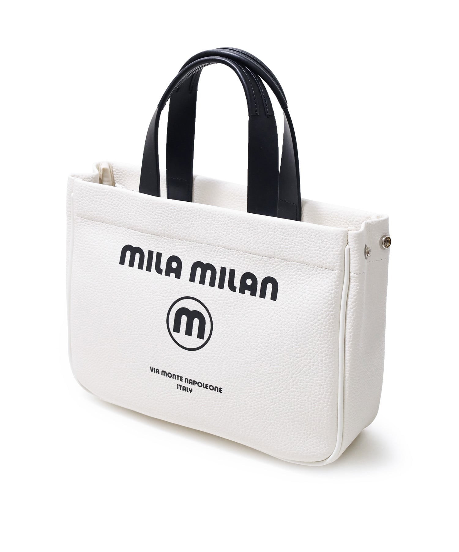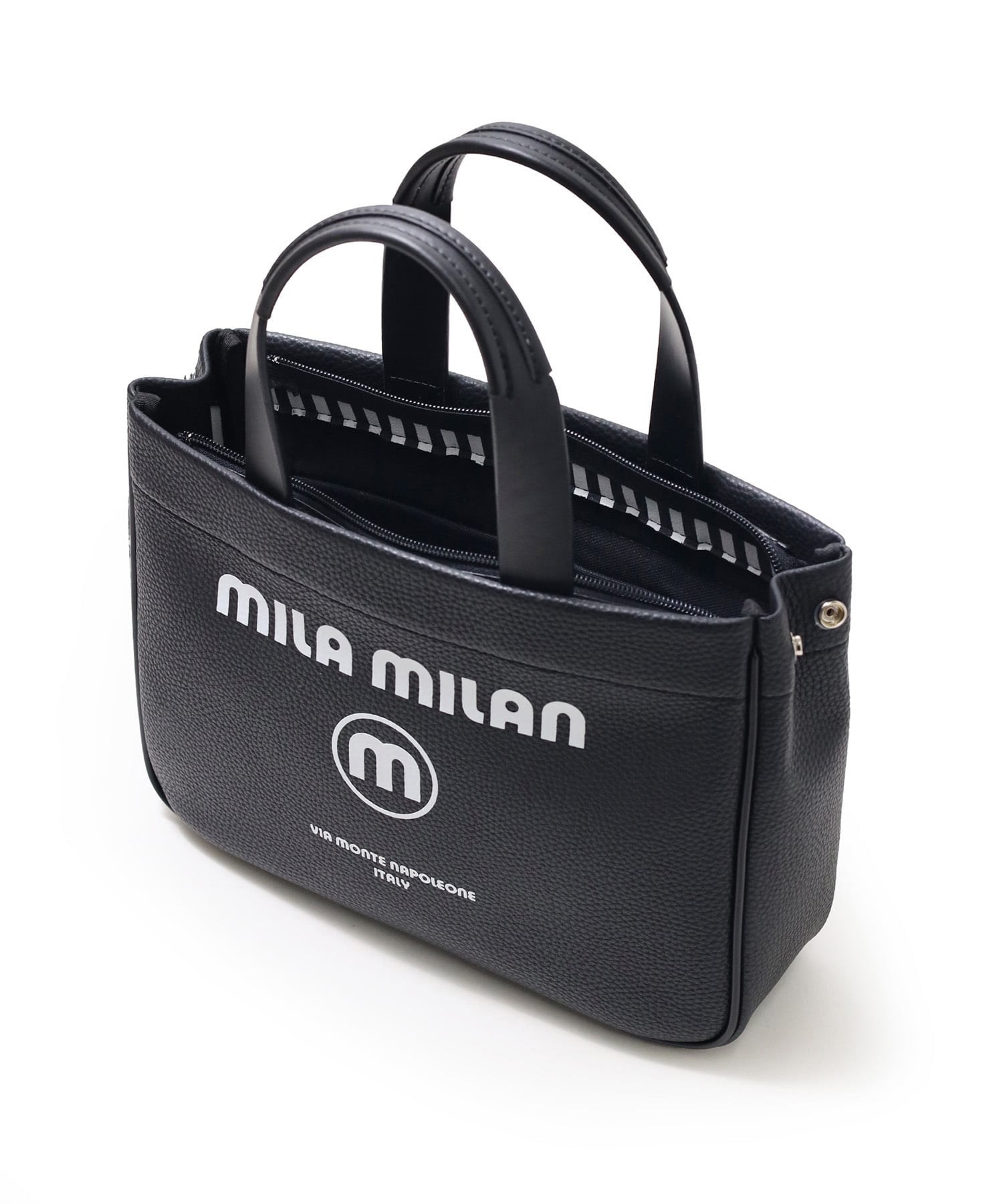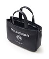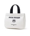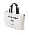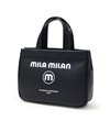モノトーン調にブランドロゴがポイントのミラ・ミランのカジュアルミニトートバッグ。普段使いから、ゴルフや旅行等様々なシーンでお使いいただけるミニサイズトートです。本体生地は防水機能のあるPVCを使用しております。一見シンプルなトートに見えますが、内装にはブランドイメージのストライプ柄を施すなどのこだわりも。男性、女性どちらもお使いいただけるバッグです。